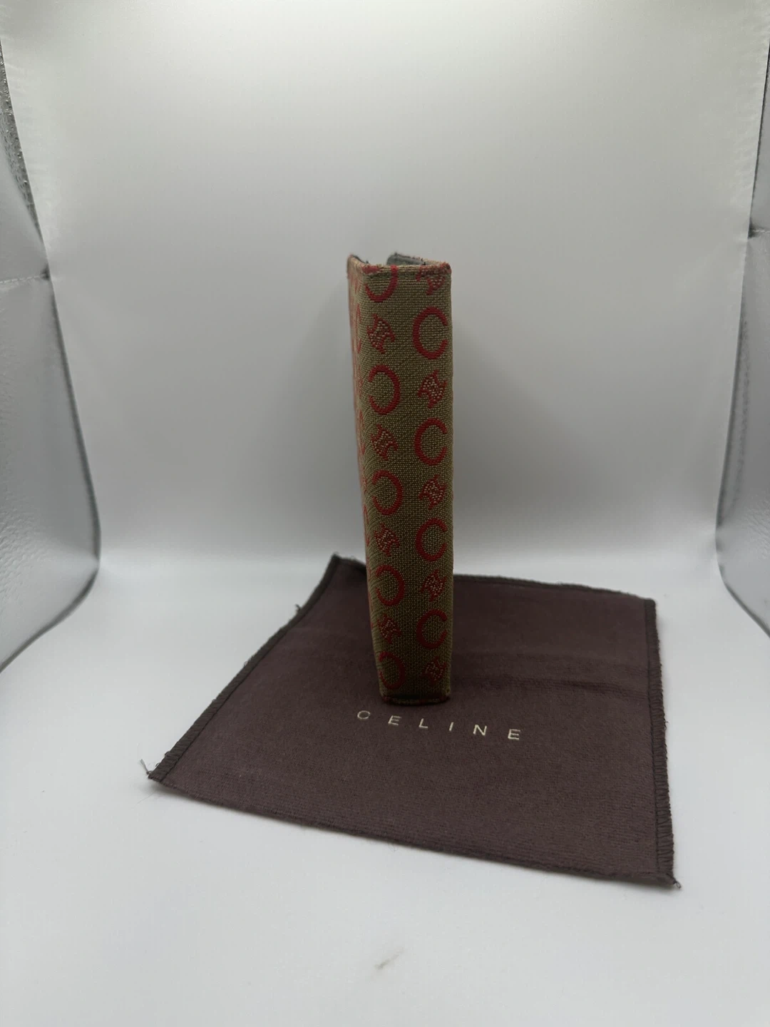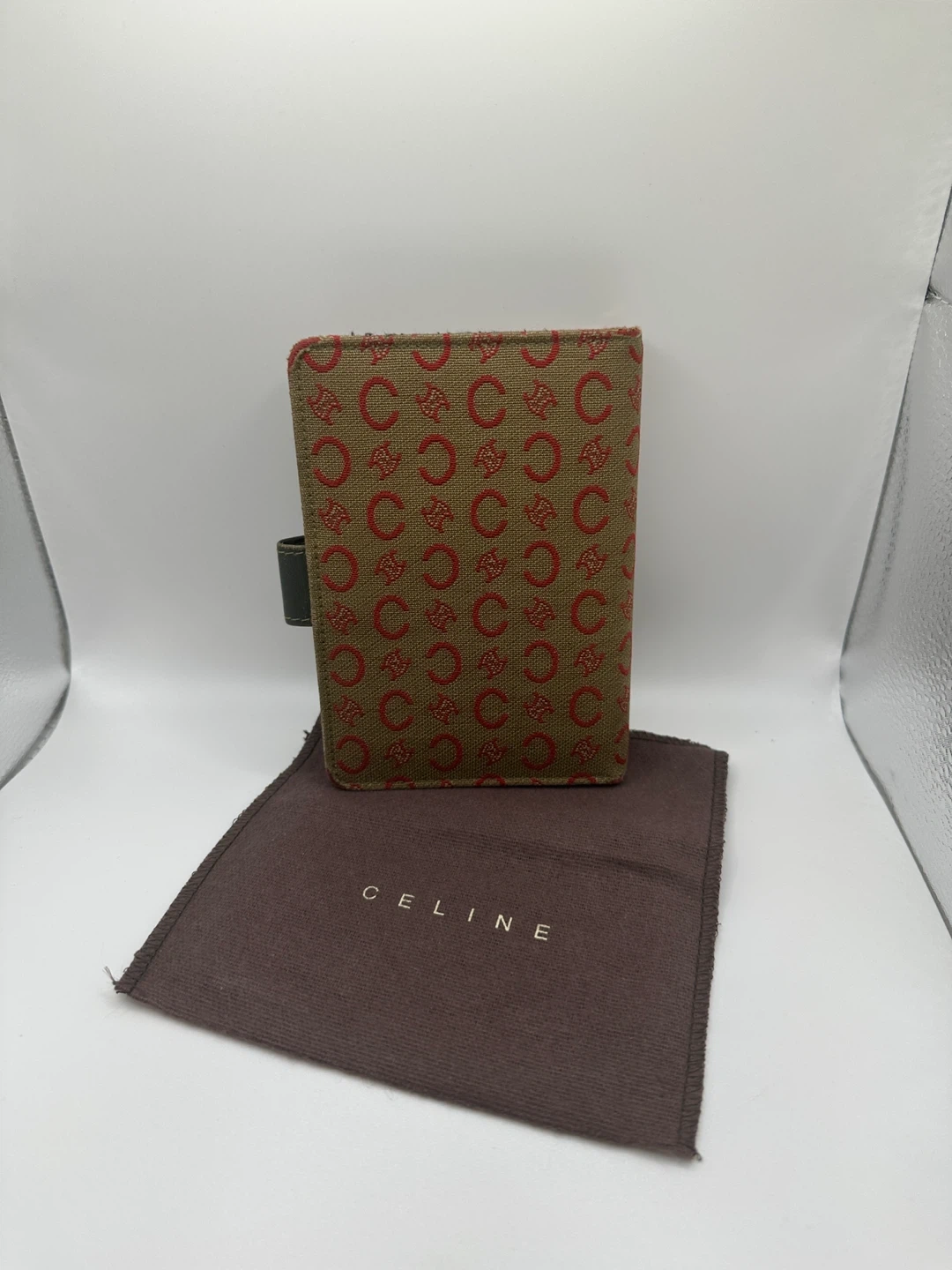 CELINE canvas organizer with a signature 'C' monogram print in red and tan. Includes assorted GUCCI inserts and a protective dust bag. Gold-tone binder rings.