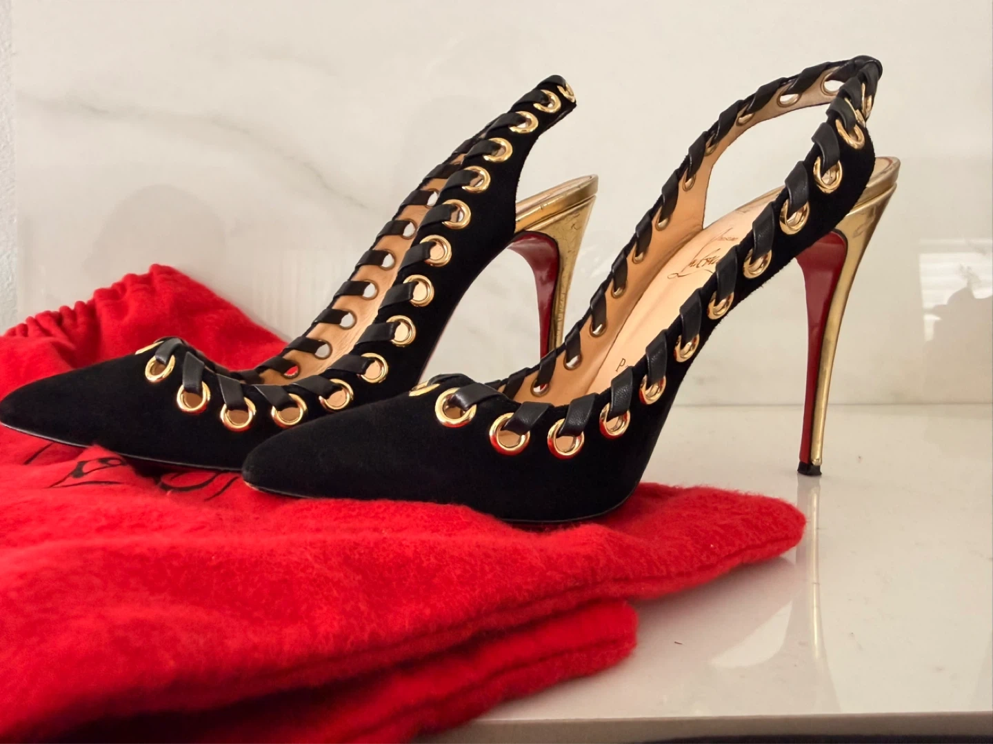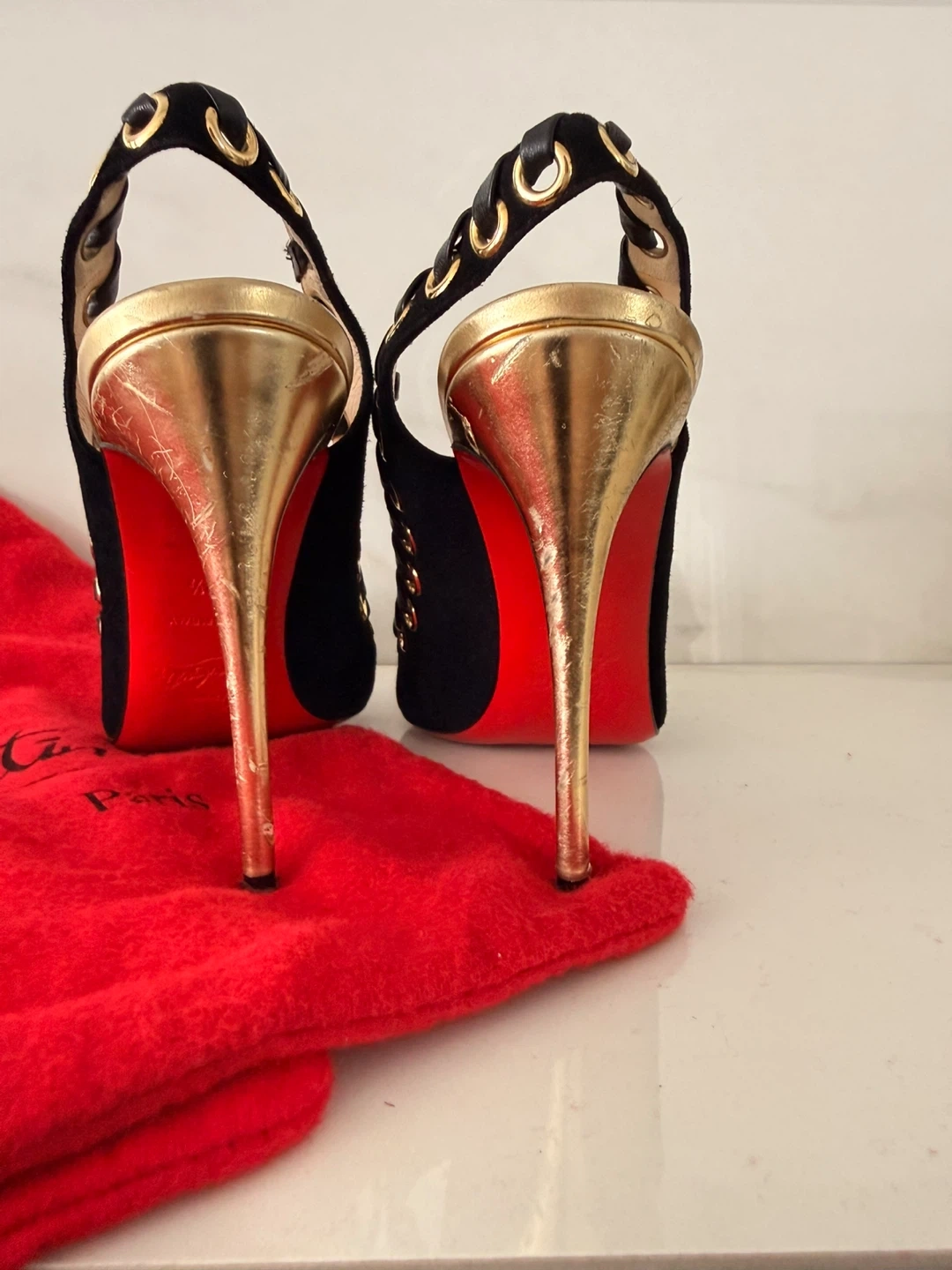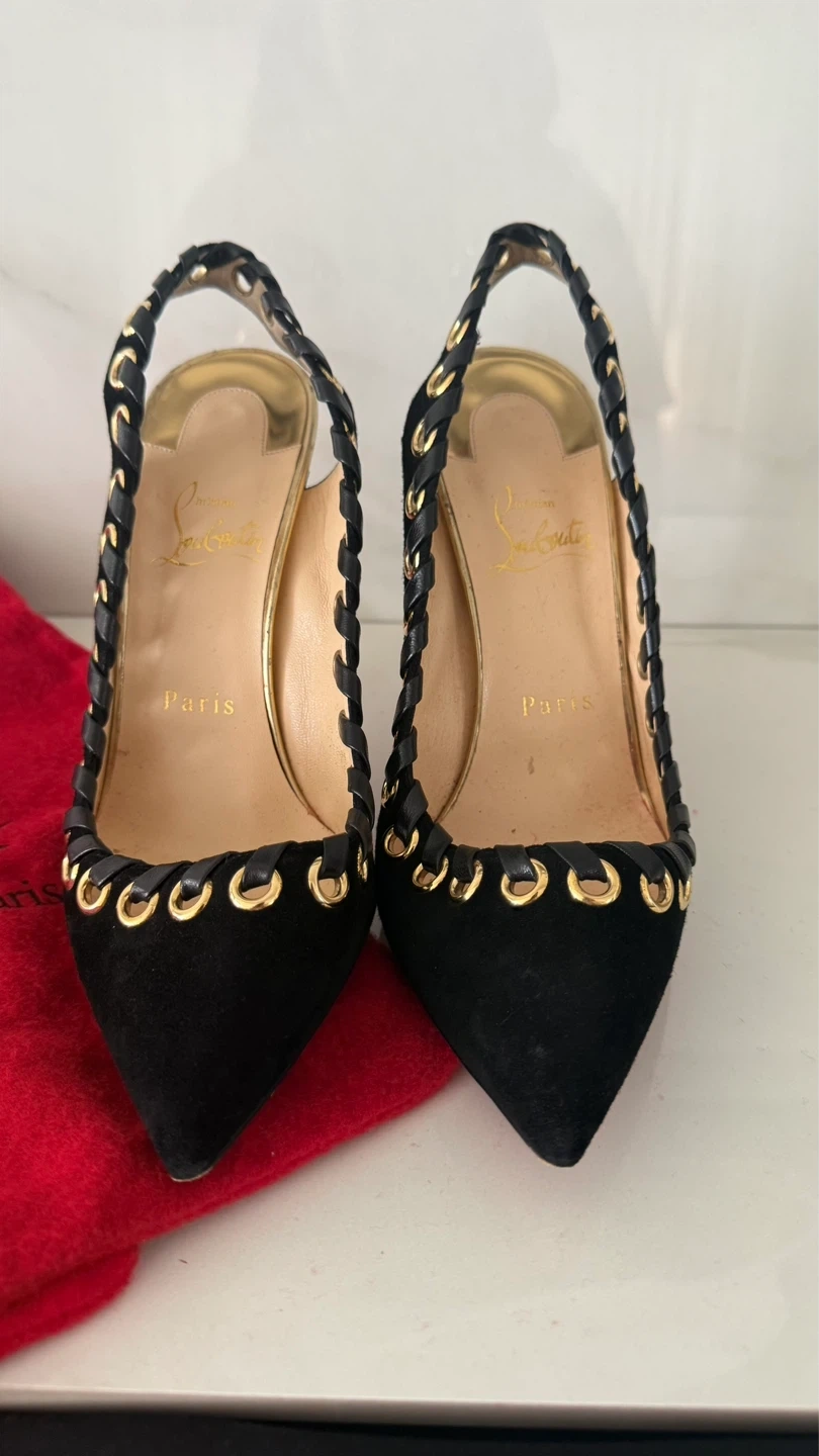 Christian Louboutin Black Suede Gold Heel Slingbacks