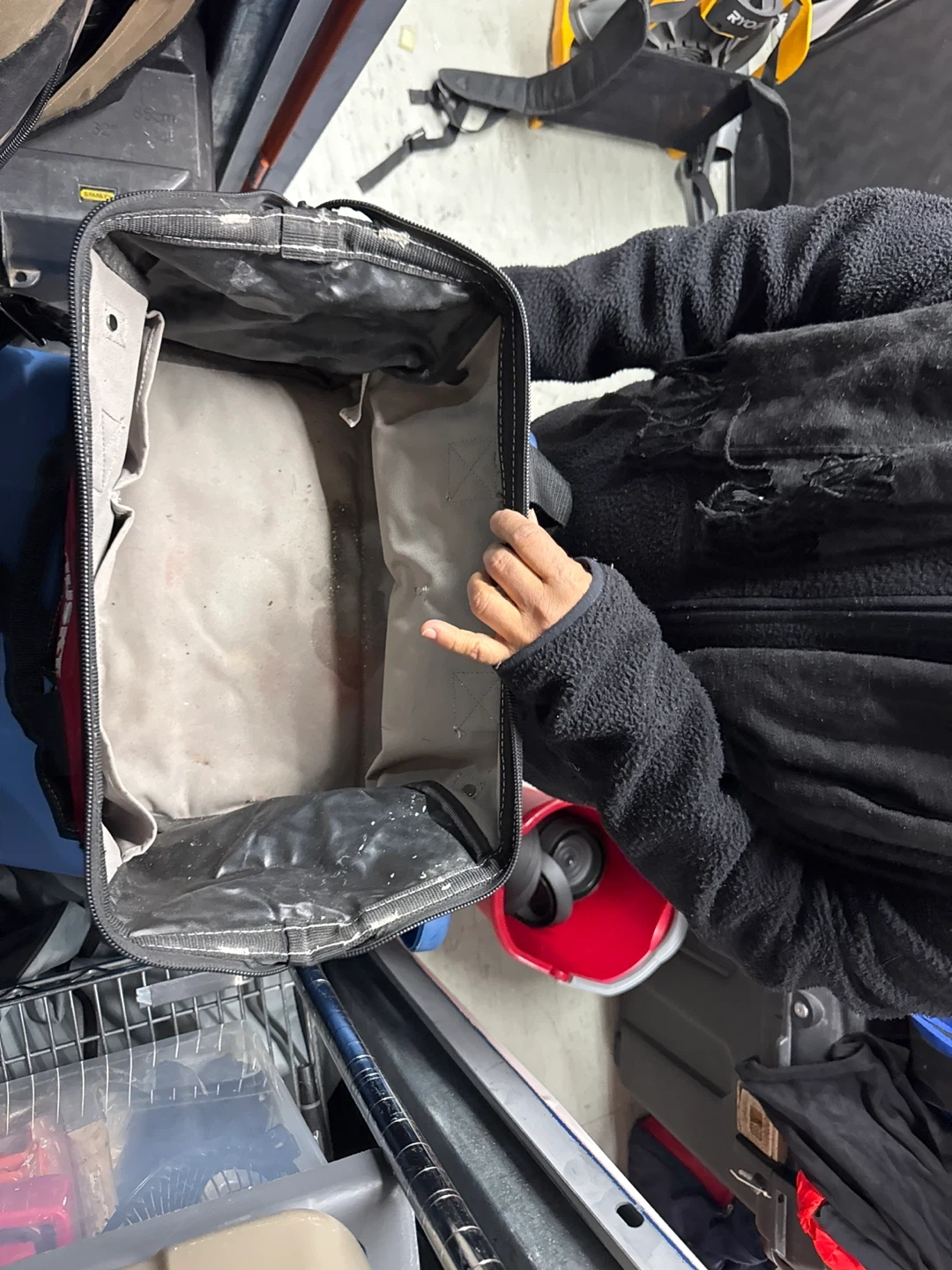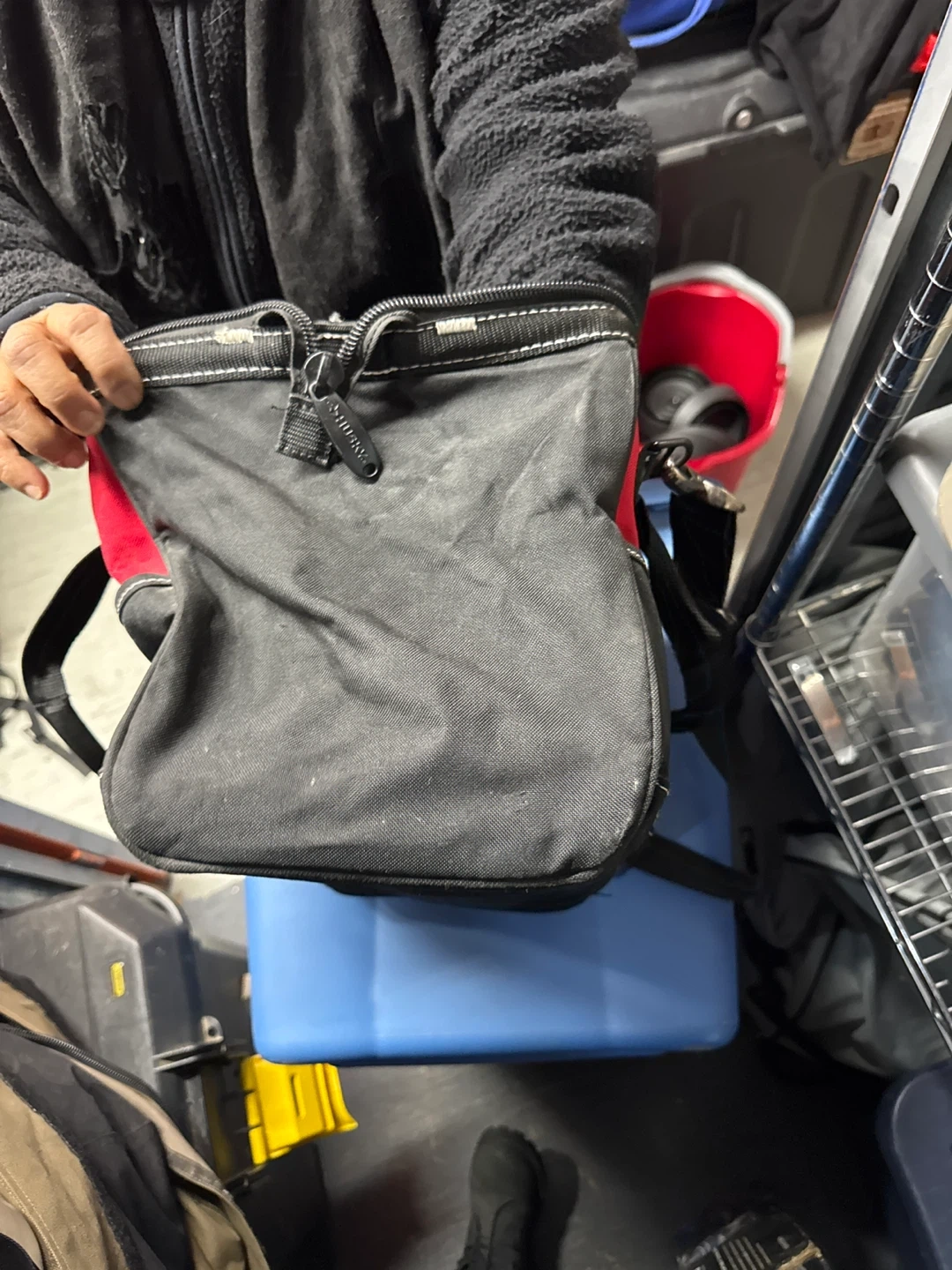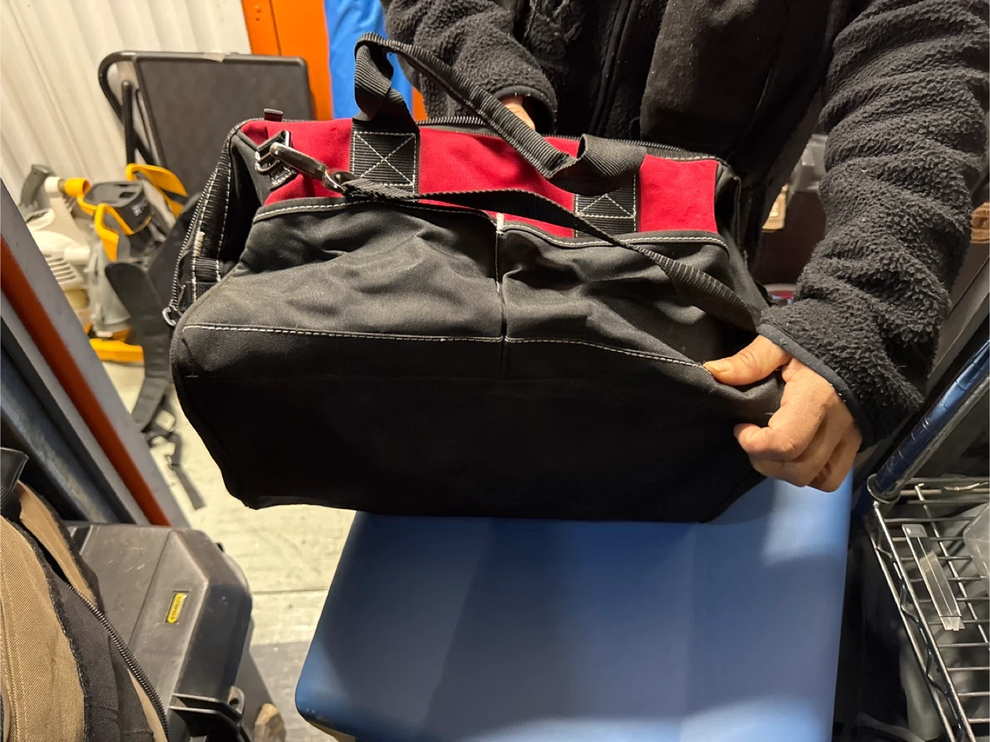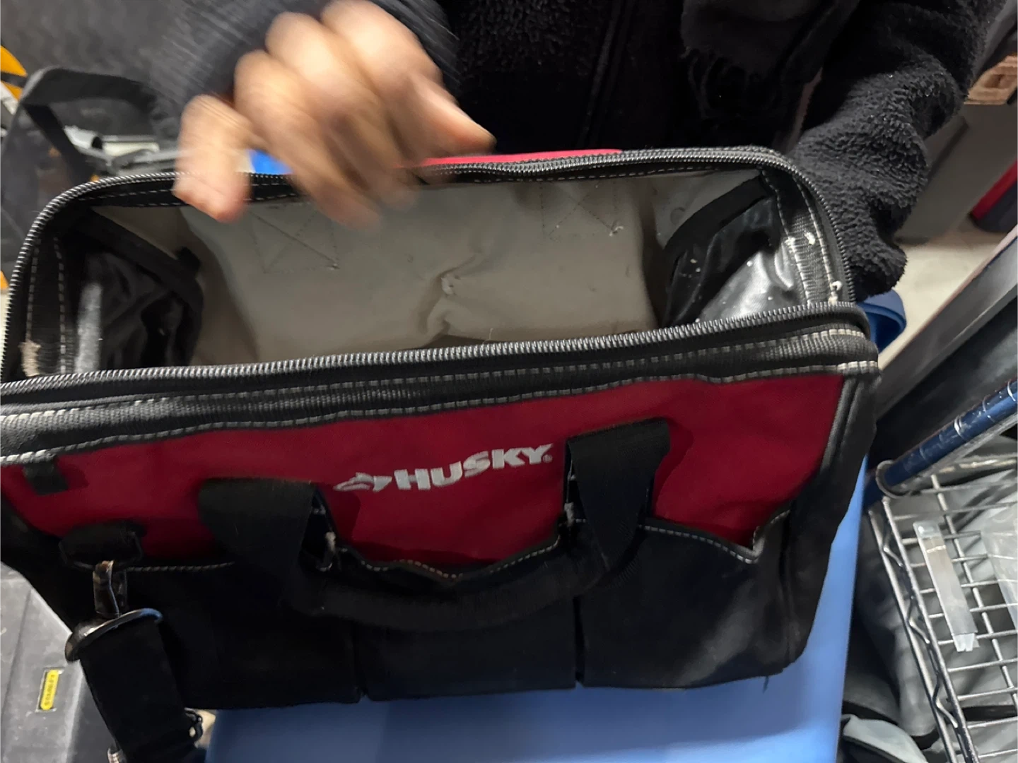 This is a Husky brand tool bag in red and black. It's a durable fabric construction with multiple pockets inside and out. It has a sturdy zipper closure and handles for easy carrying.