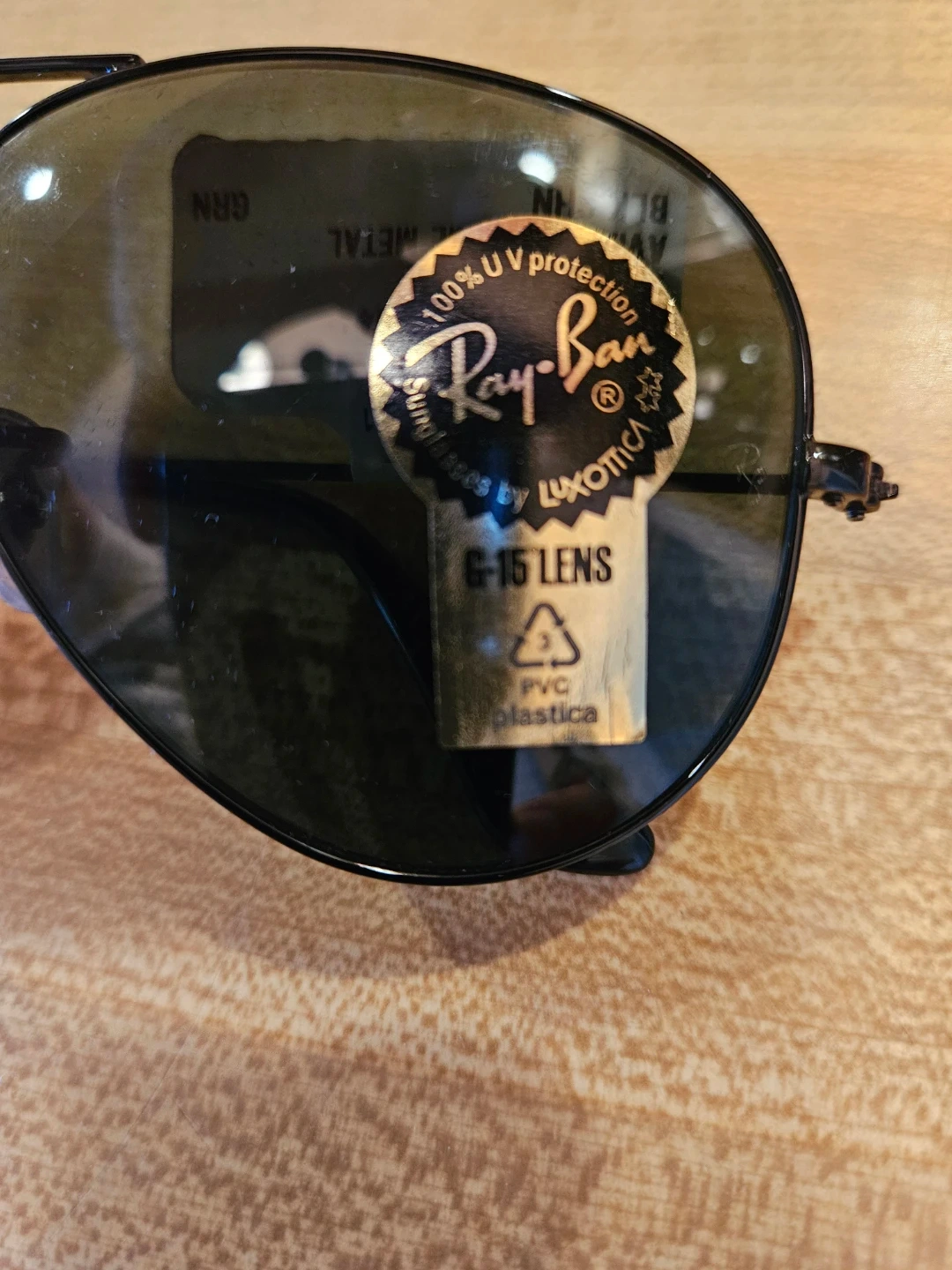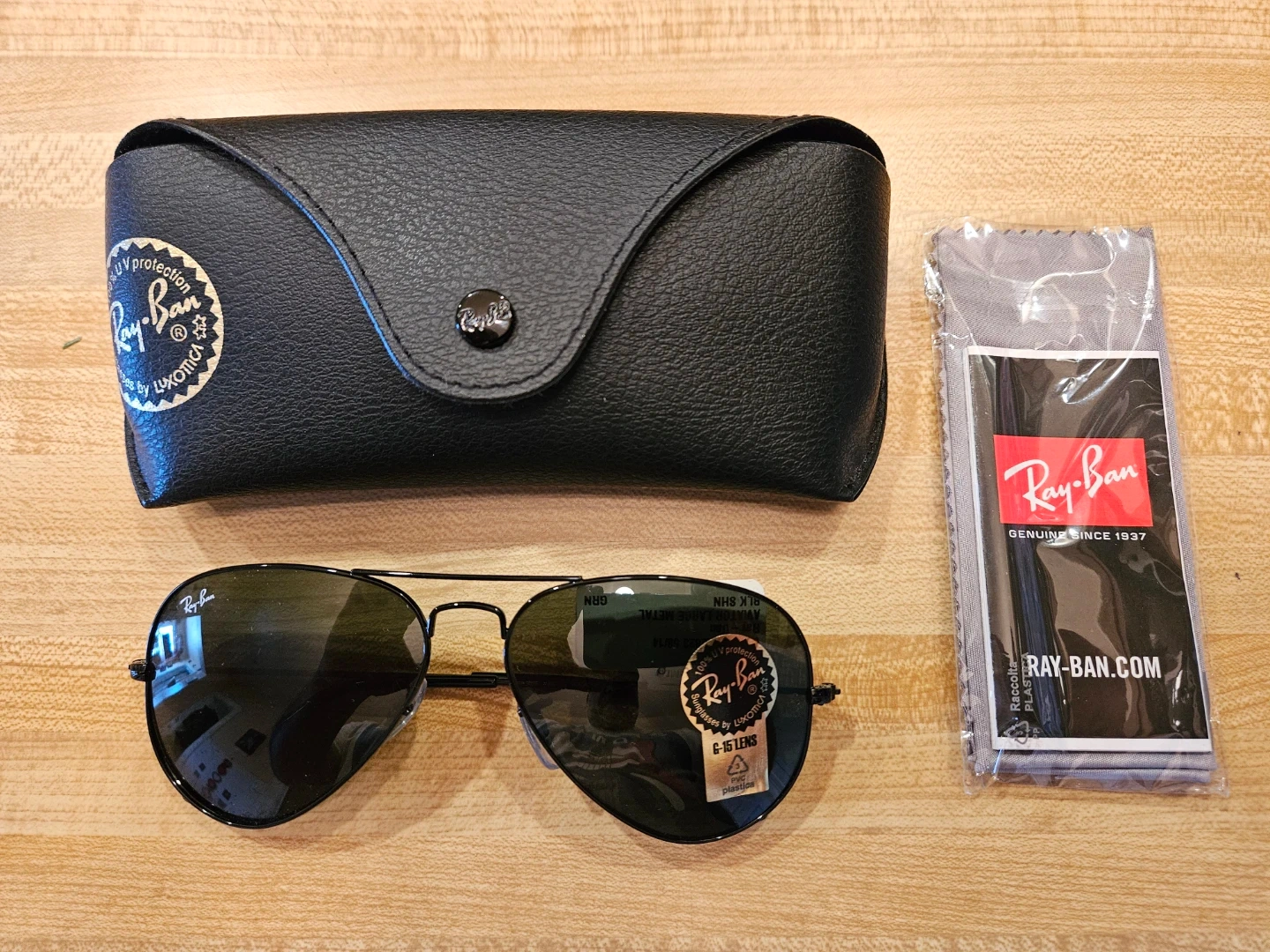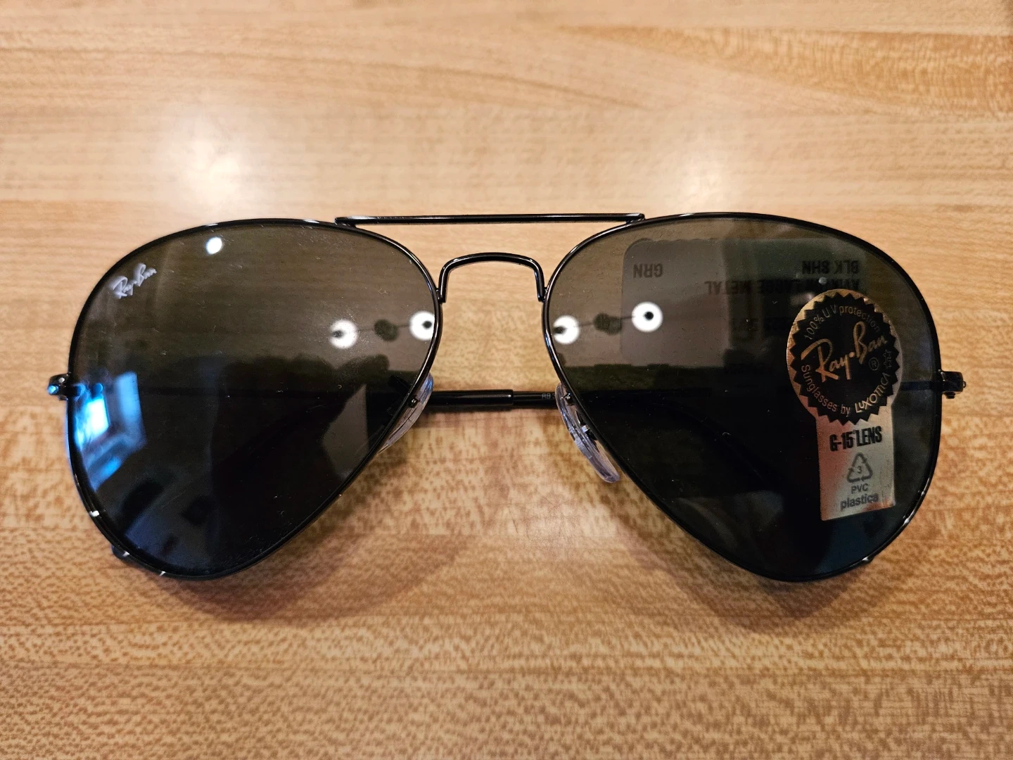 Selling a pair of Ray-Ban Aviator Large Metal sunglasses in black. These classic shades feature G-15 lenses and offer 100% UV protection. The tag shows they were originally $171. Comes with the case and cleaning cloth!