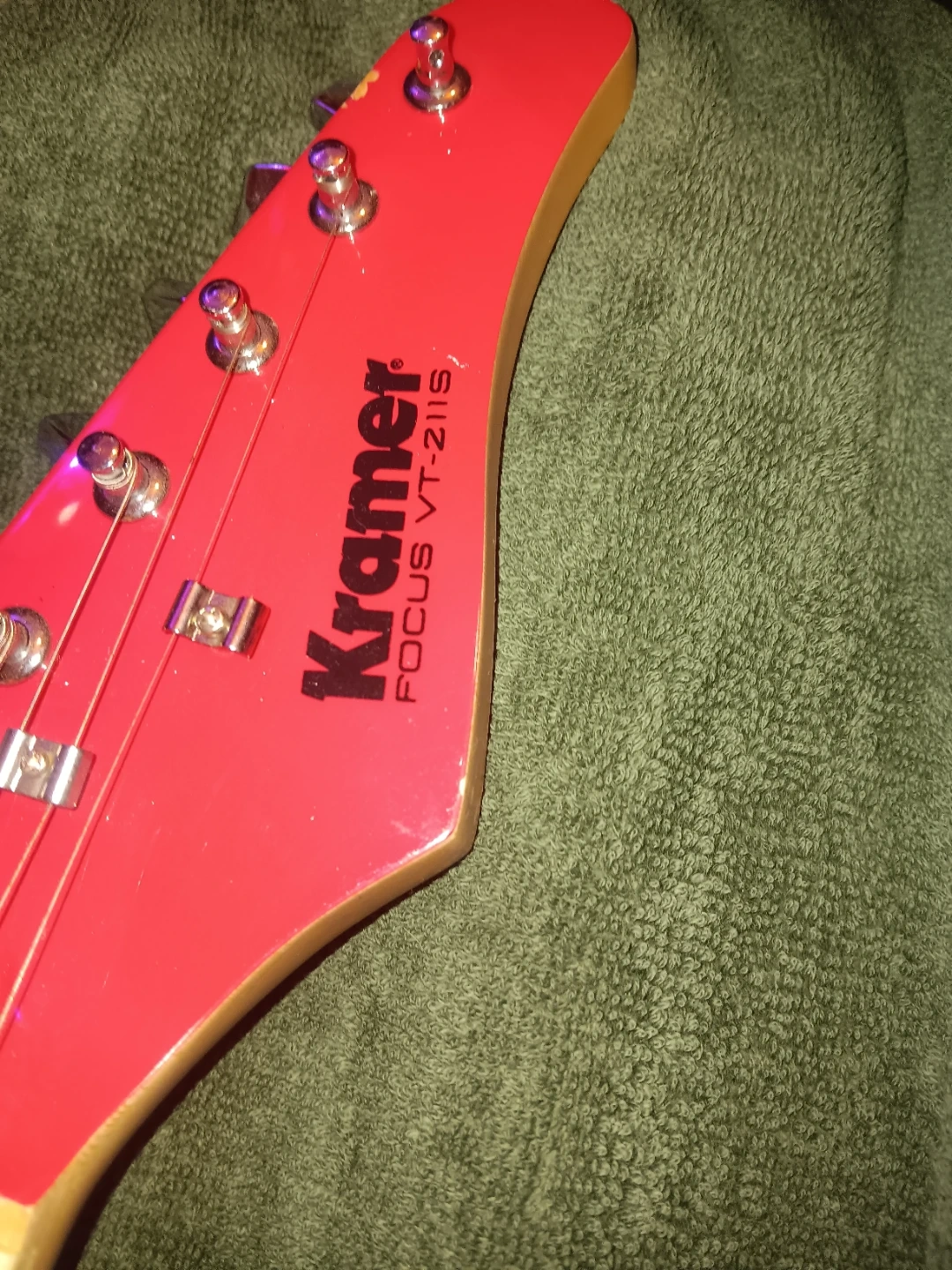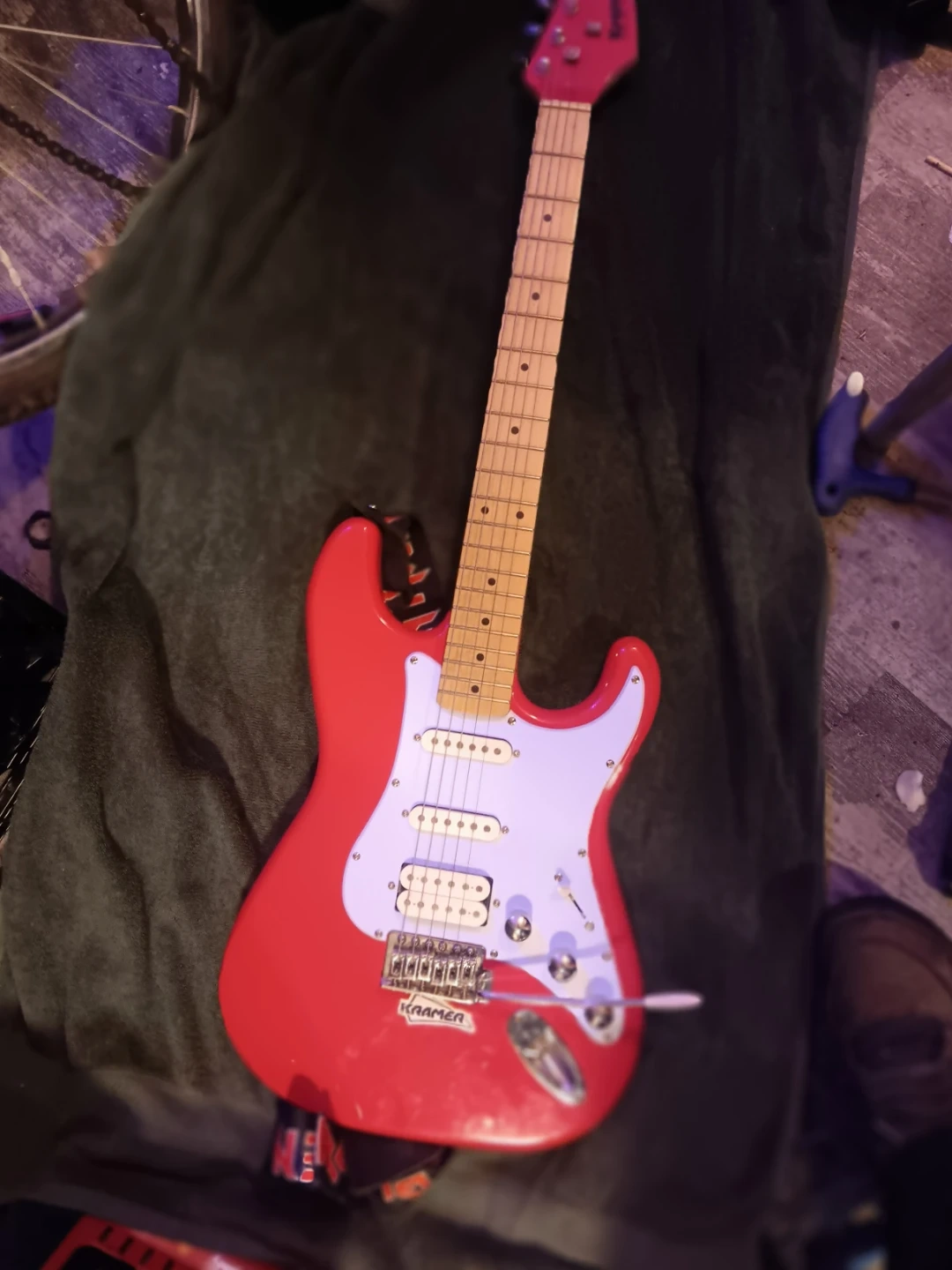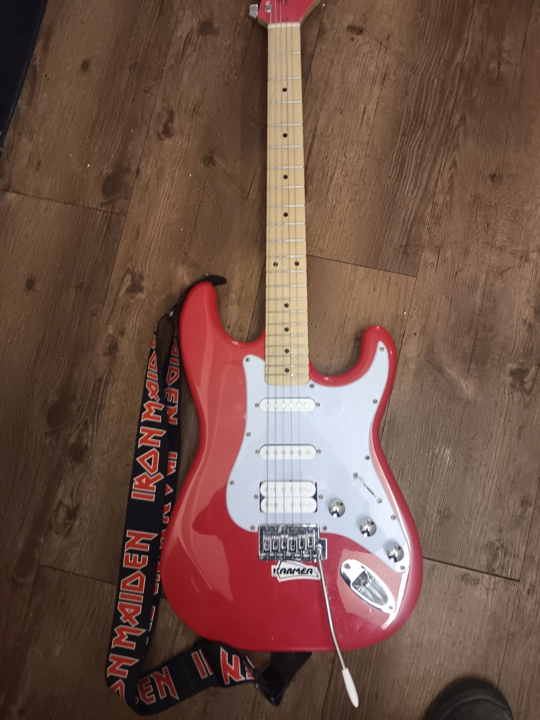 This is a red Kramer Focus VT-211S electric guitar. It features a maple neck and a white pickguard. This guitar is suitable for aspiring guitarists learning to play.