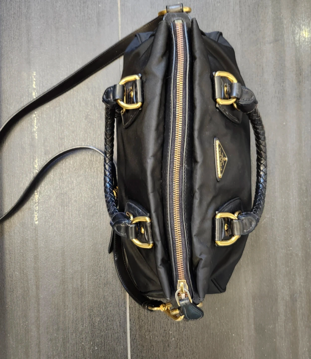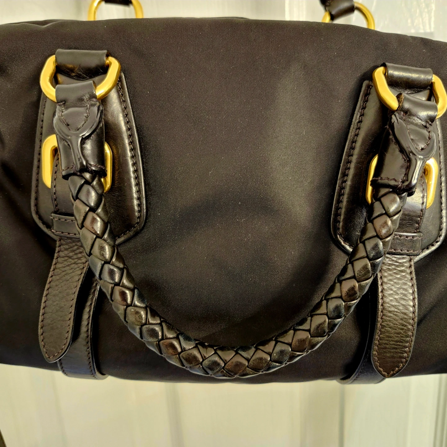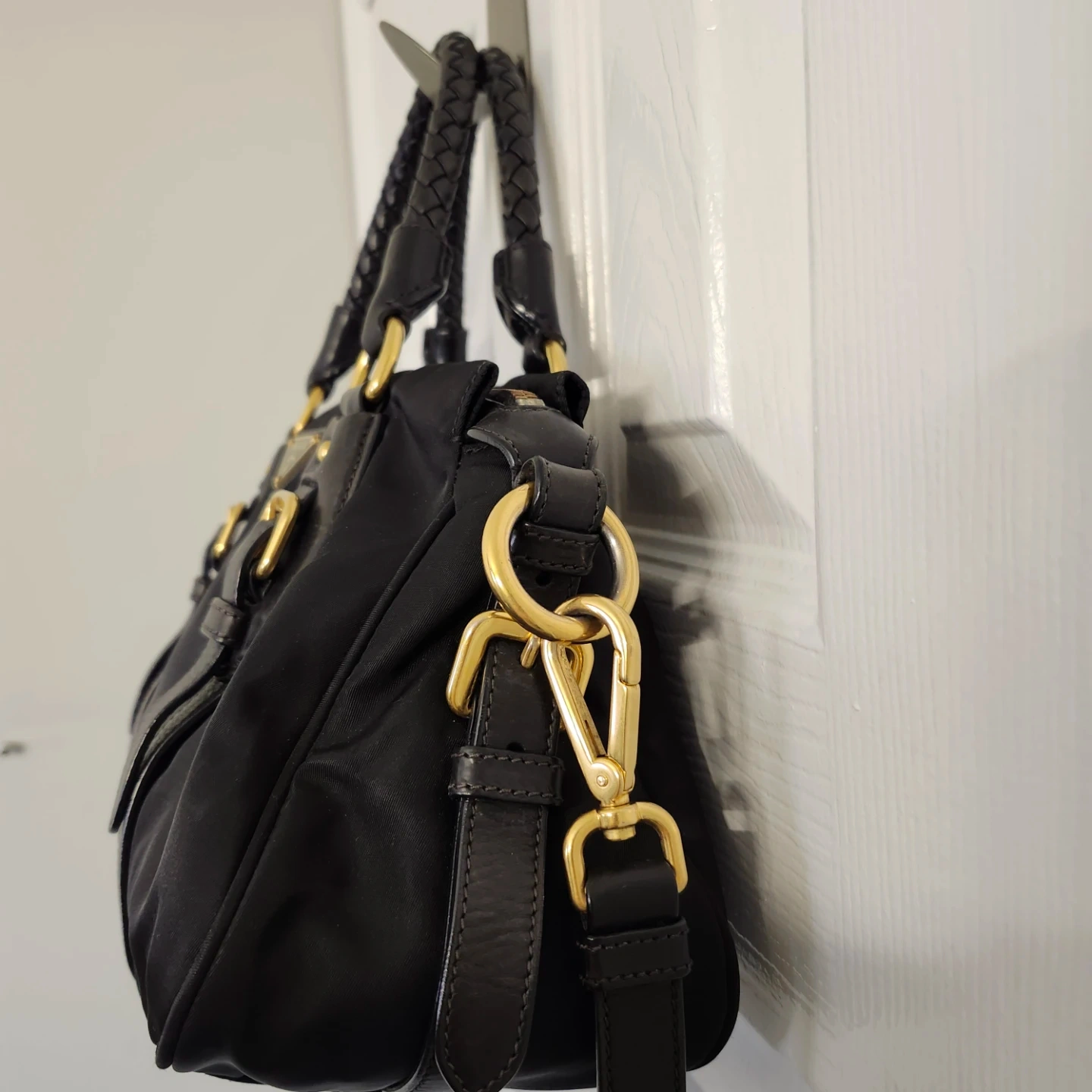 This is a black Prada shoulder bag made from nylon with leather trim. It features gold-tone hardware and a braided handle. The bag has a zip-top closure and comes with a detachable shoulder strap.