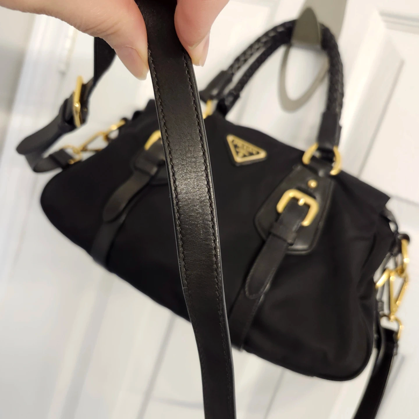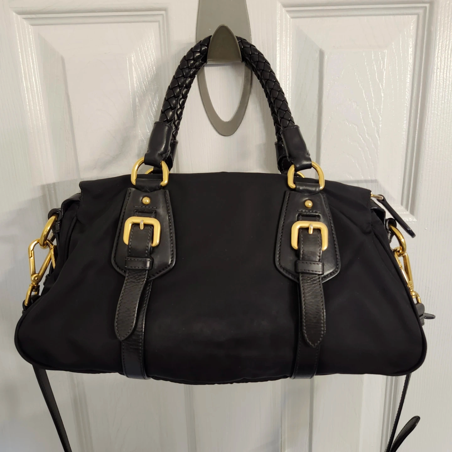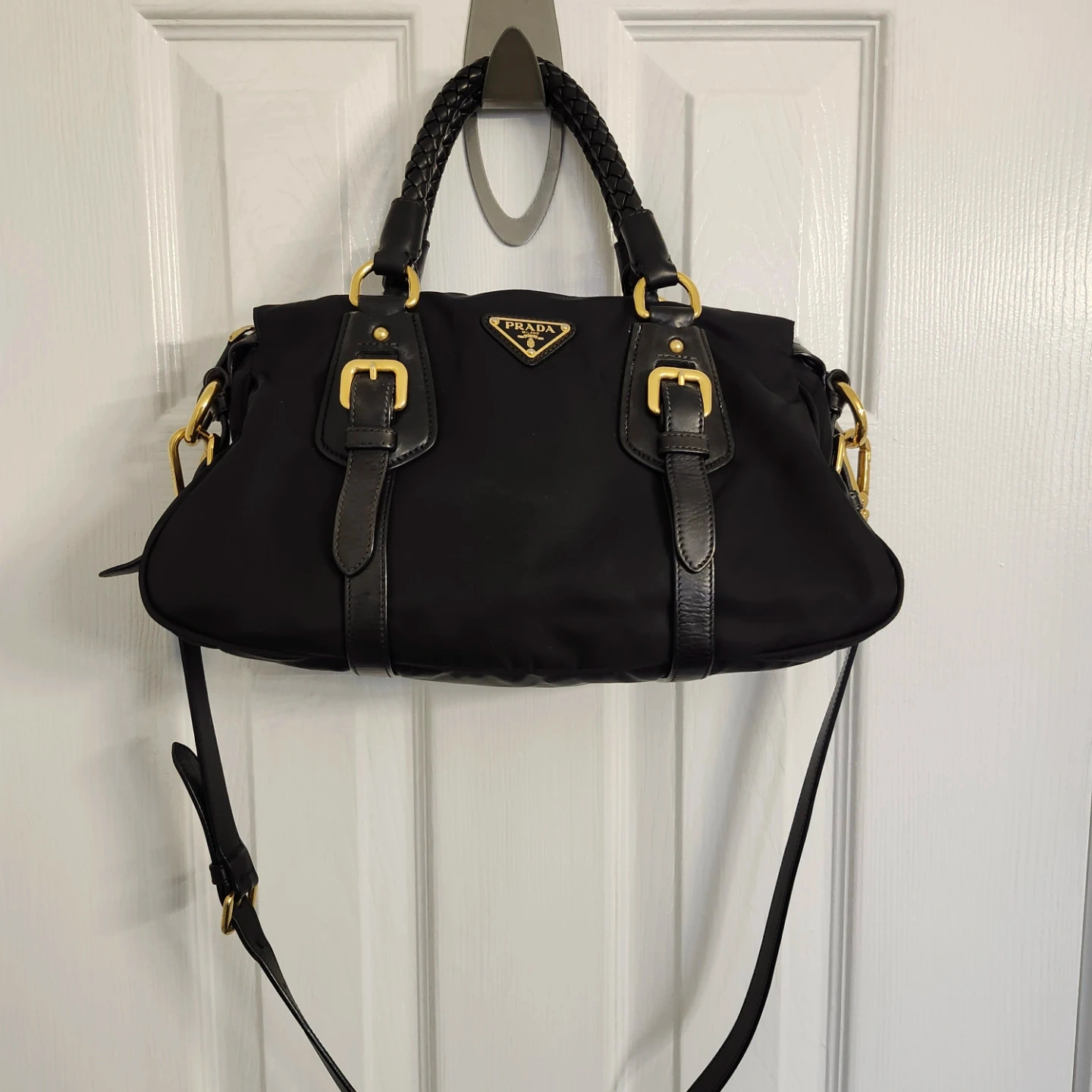 This is a black Prada shoulder bag made from nylon with leather trim. It features gold-tone hardware and a braided handle. The bag has a zip-top closure and comes with a detachable shoulder strap.
