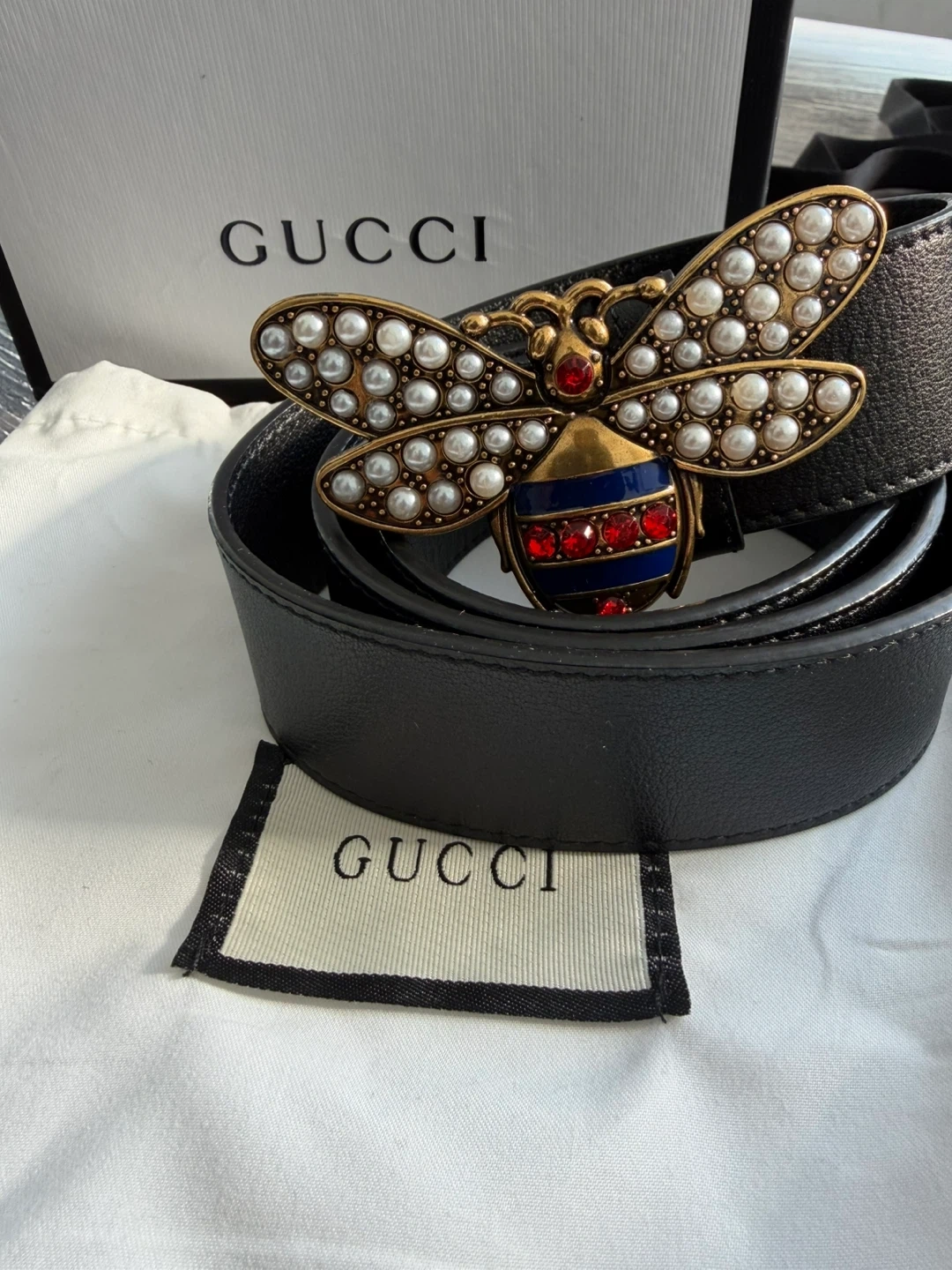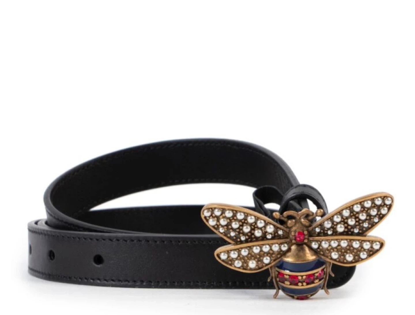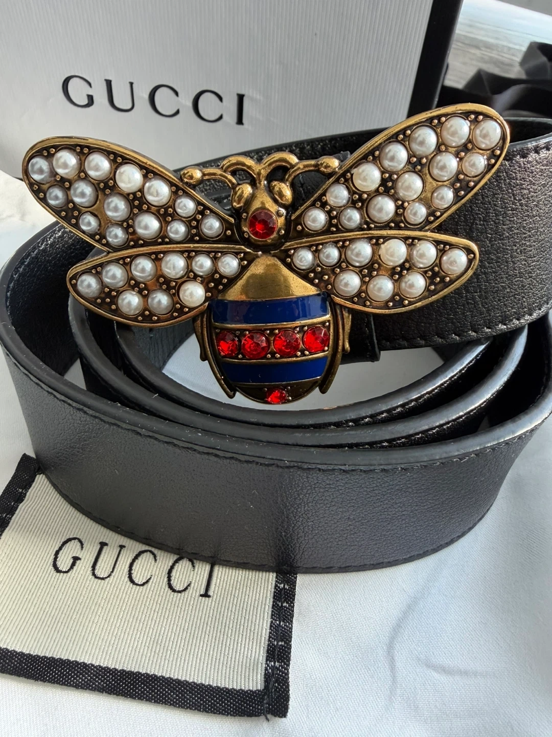 Inspired by modern romantisism, this Gucci Queen Margaret belt is the perfect accessory to complement every look. The belt is crafted in black leather and finished with a gleaming hardware closure of a metal bee. Comes with: Dustbag Box