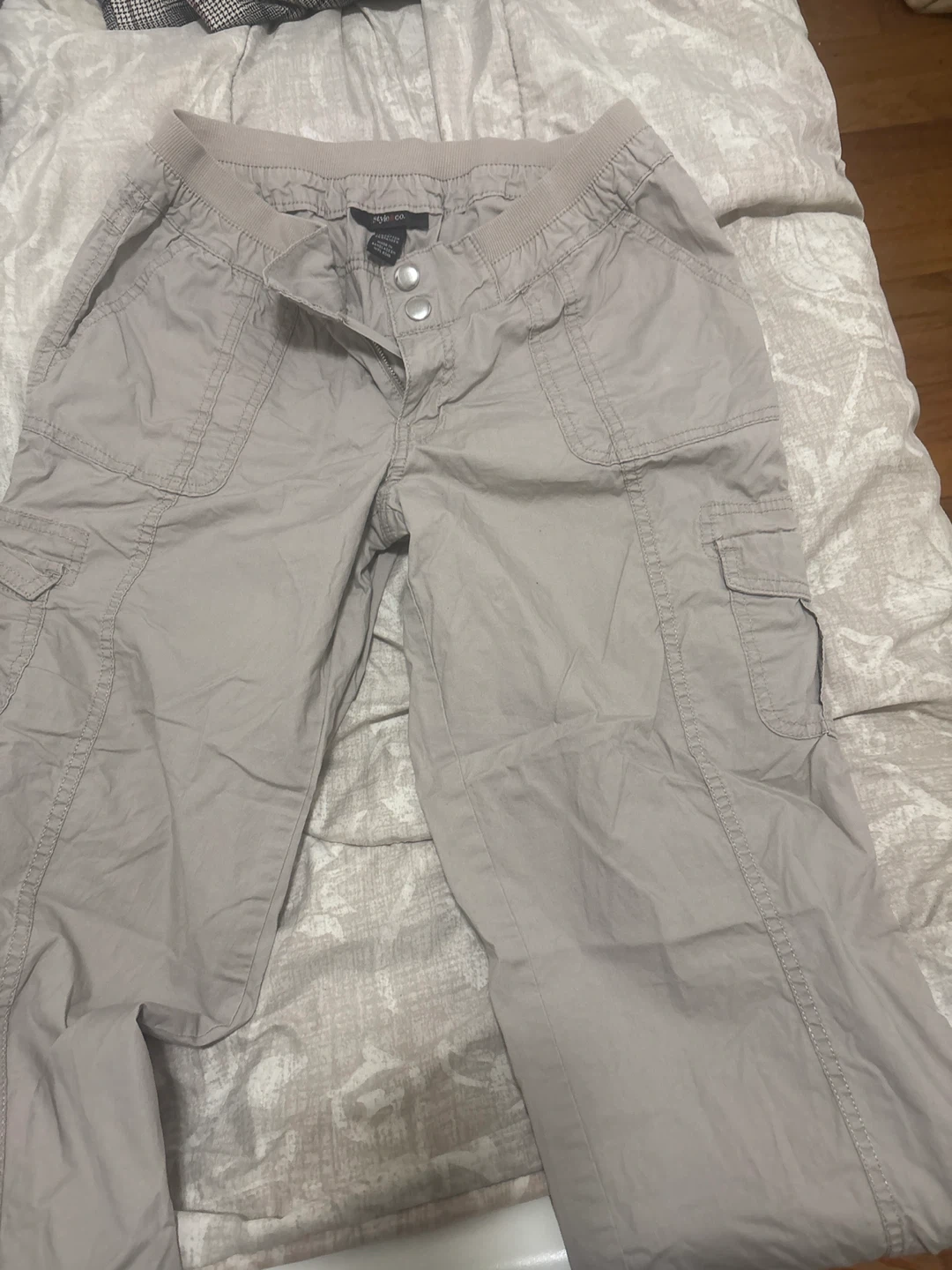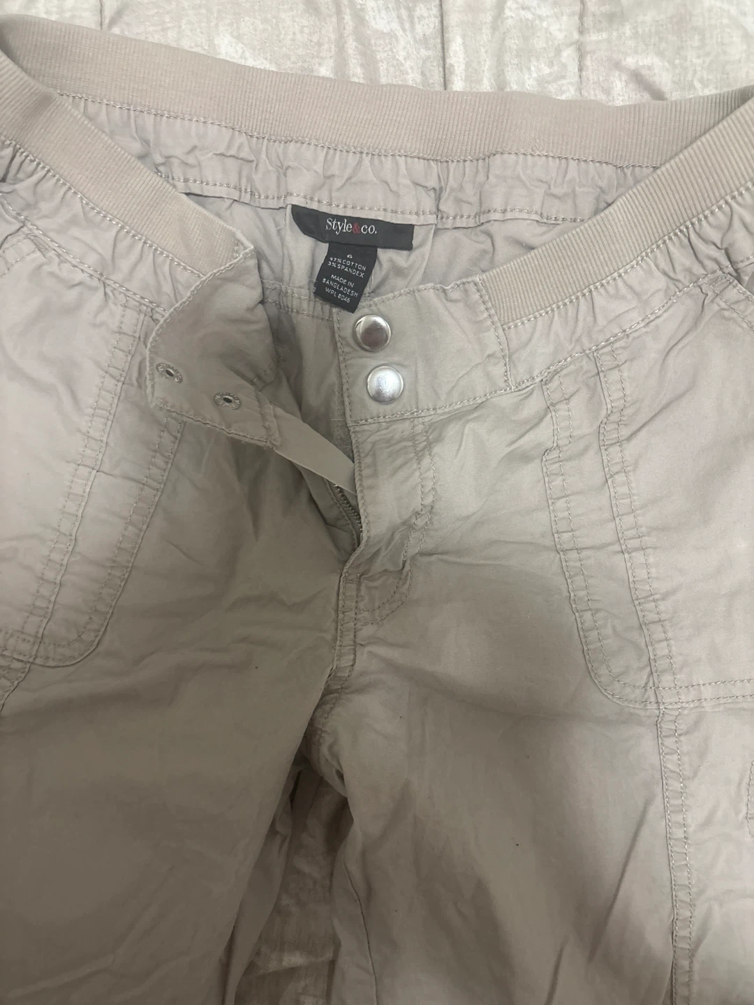 These Style & Co. cargo pants are a versatile beige color. They feature a comfortable elastic waistband and multiple pockets. Made from a cotton blend.