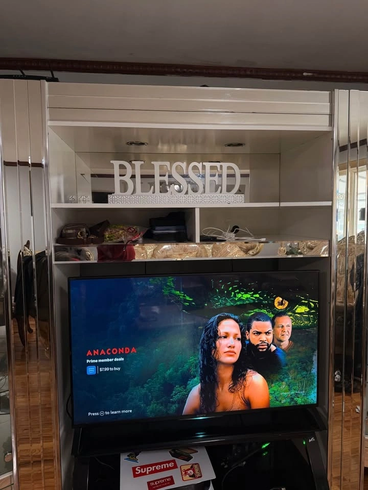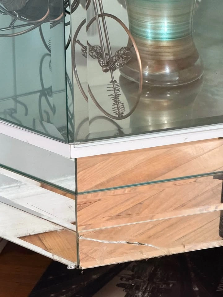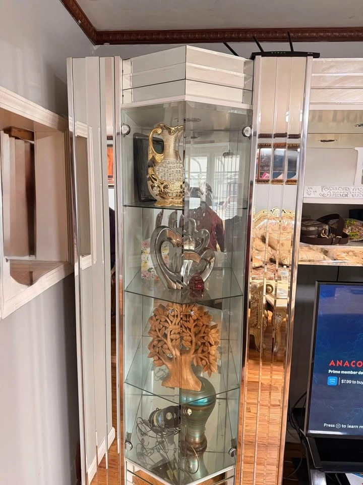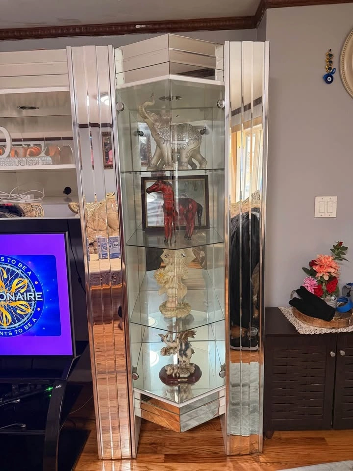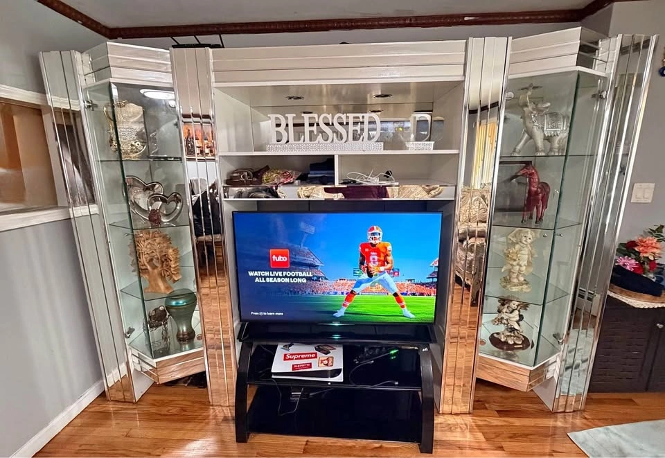Elegant 3-piece mirrored entertainment wall unit in good condition. Includes a center entertainment cabinet with shelving for a TV and media devices, plus two matching glass curio display cabinets on each side with adjustable glass shelves and built-in lighting. All decorative items shown in the photos are included with the unit. There is a small crack on the bottom left of one side cabinet, which is clearly shown in the photos. It does not affect functionality or stability and is mostly cosmetic. The unit is in 3 separate pieces, making it easy to move individually. It features mirrored accents throughout, glass shelves in the side display cabinets, and the center unit fits up to approximately a 50” TV. It's a solid, heavy, high-quality build from a clean, smoke-free home. Optional: Sony Bravia 50” 4K TV (2014 model) is available for an additional price; it is fully functional with no issues. Local pickup only. Please bring help as the pieces are heavy.