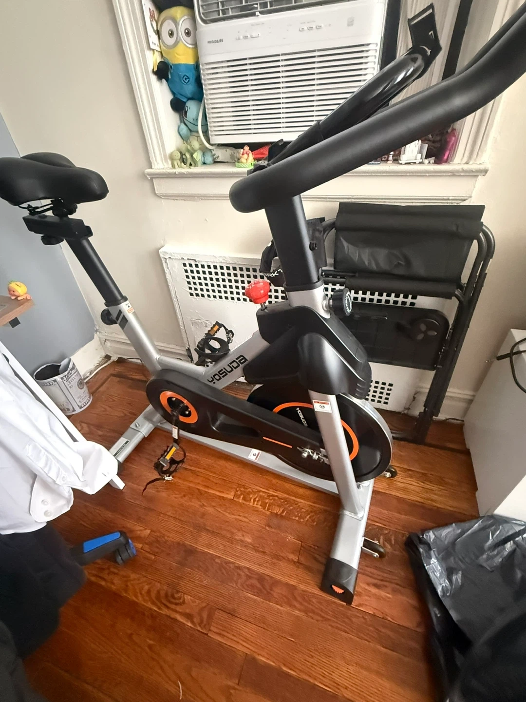 This is a YOSUDA spin bike. It has an adjustable seat and handlebars for a comfortable workout. The bike features a smooth, quiet ride.
