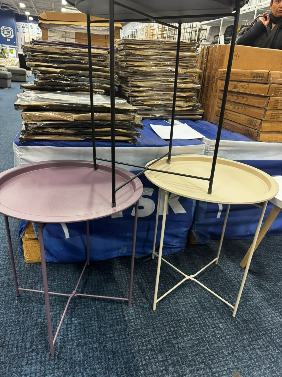 A cute round tray side table, perfect for adding a touch of colour to any room. It's in great condition and ready for a new home! The table has a metal frame and a tray top, making it both stylish and functional. It's a lovely piece to use as a side table or even as a plant stand. I only have beige available.