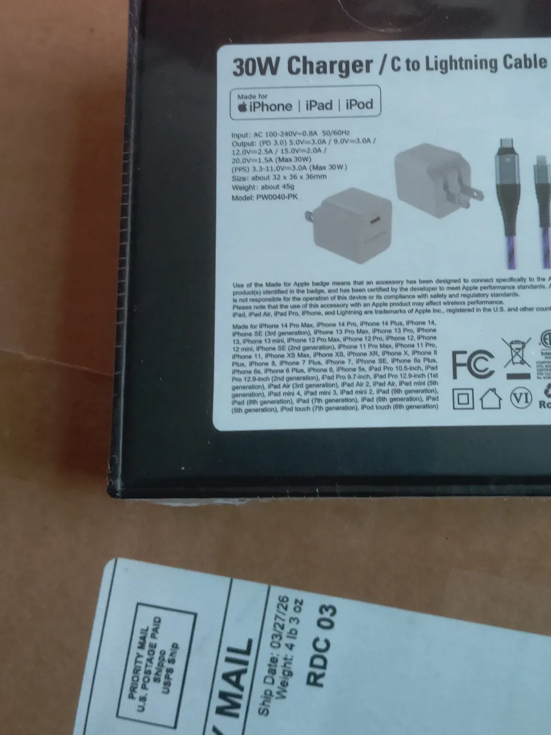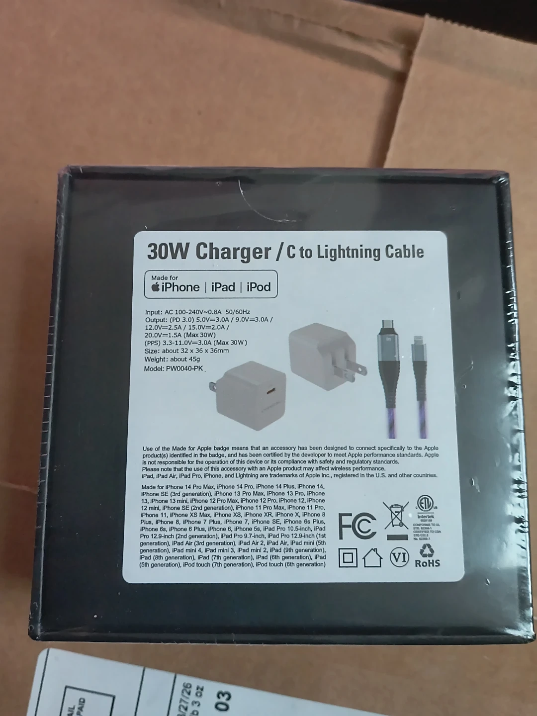 Includes a 30W charger and USB-C to Lightning cable. Charger has AC 100-240V input and PD 3.0 output. Cable is for iPhone, iPad, and iPod. Great for fast charging your Apple devices!