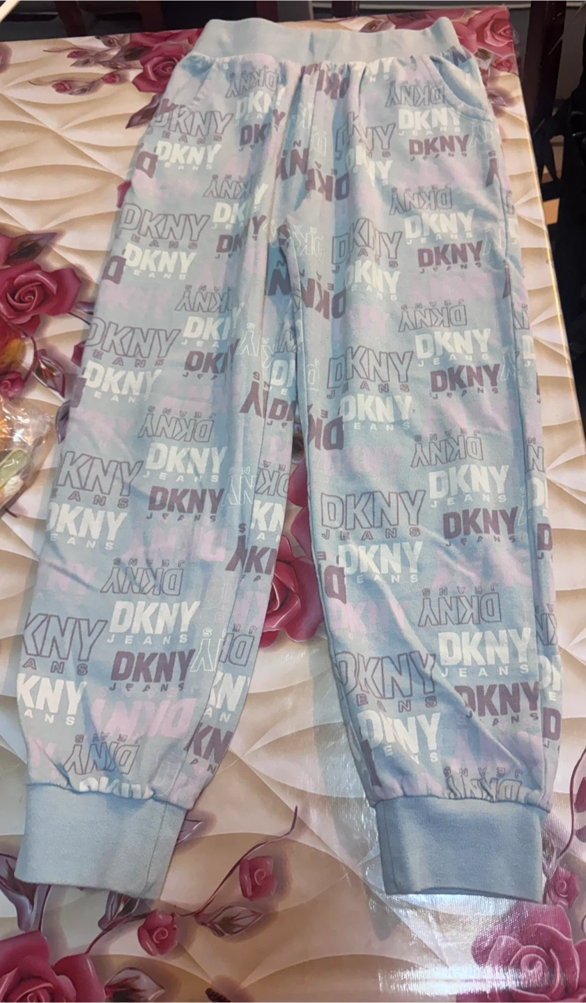 DKNY Jeans sweatpants featuring an all-over logo print. Elastic waistband with drawstring. Cuffed ankles. Soft fabric construction.