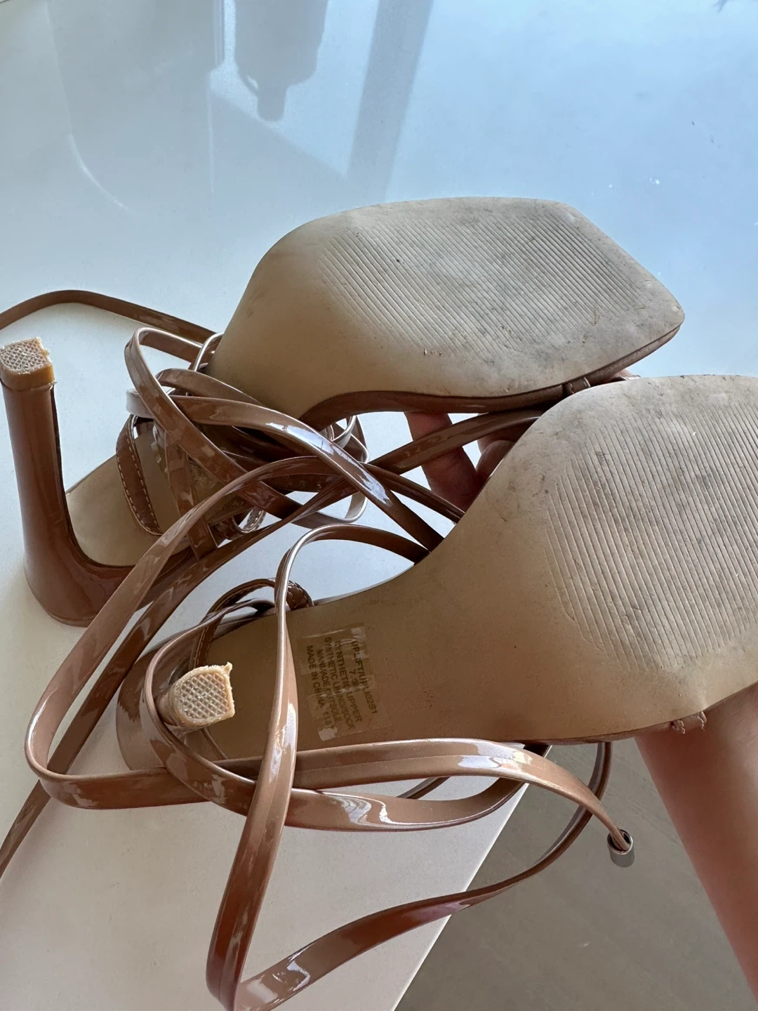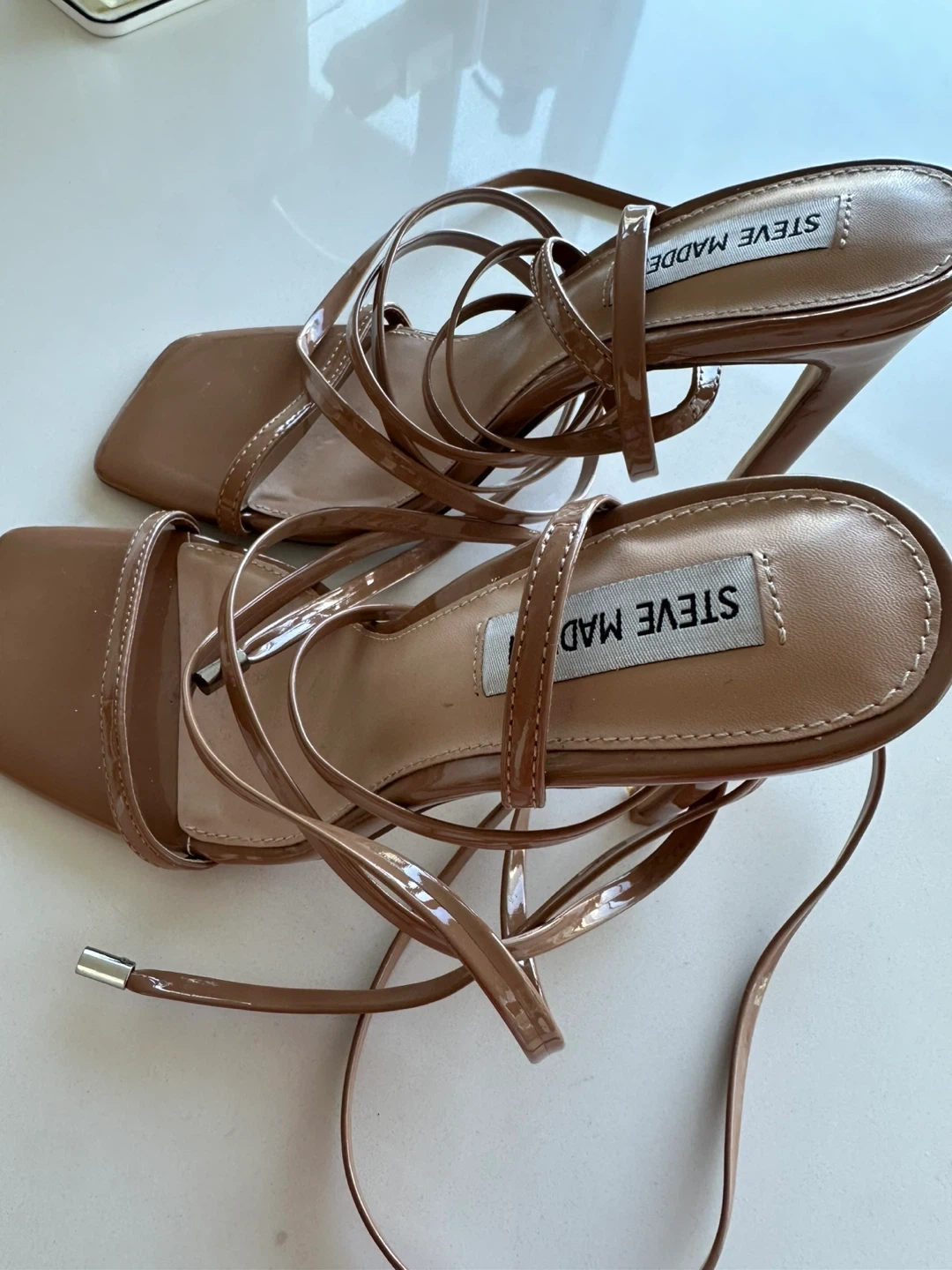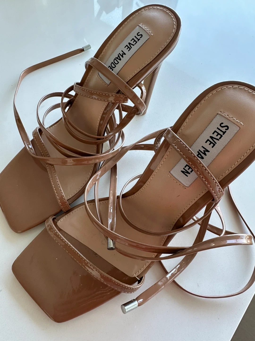 These Steve Madden heels feature a strappy design with a square toe. The ankle wraps add a stylish detail. Glossy tan finish.