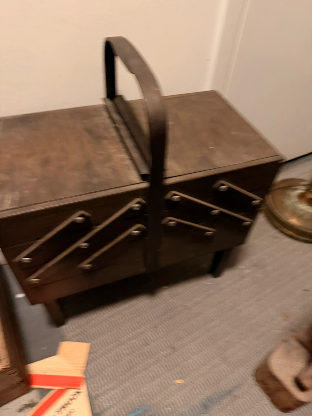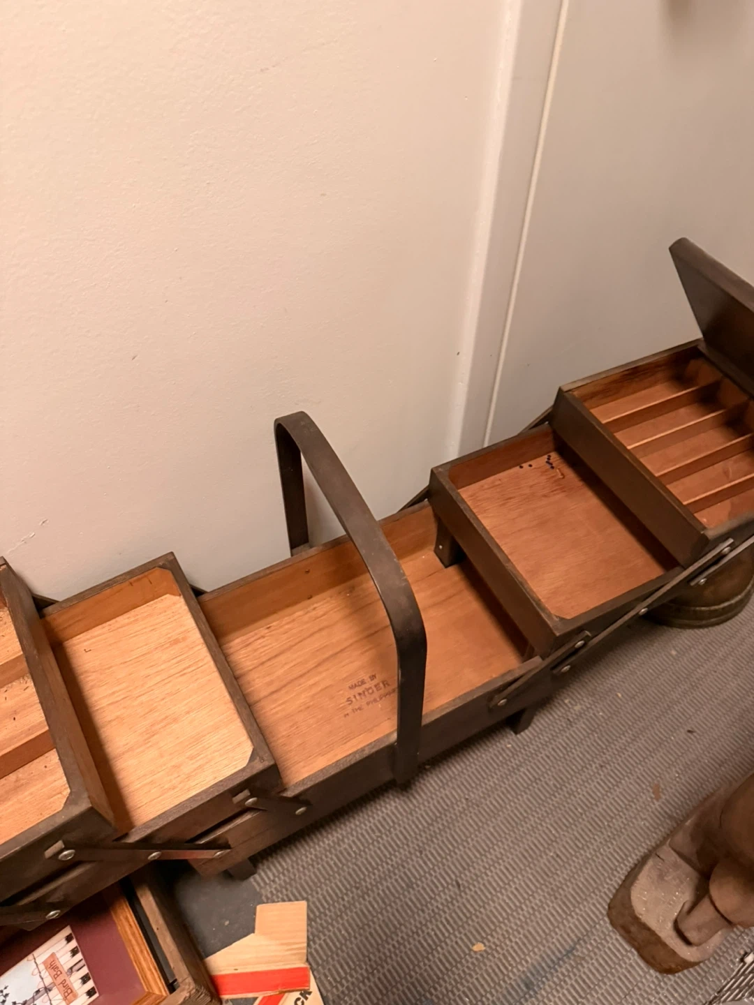 This vintage sewing basket is made by Singer. It's constructed from wood with multiple tiered compartments for organizing sewing supplies. It features a convenient carrying handle for portability.