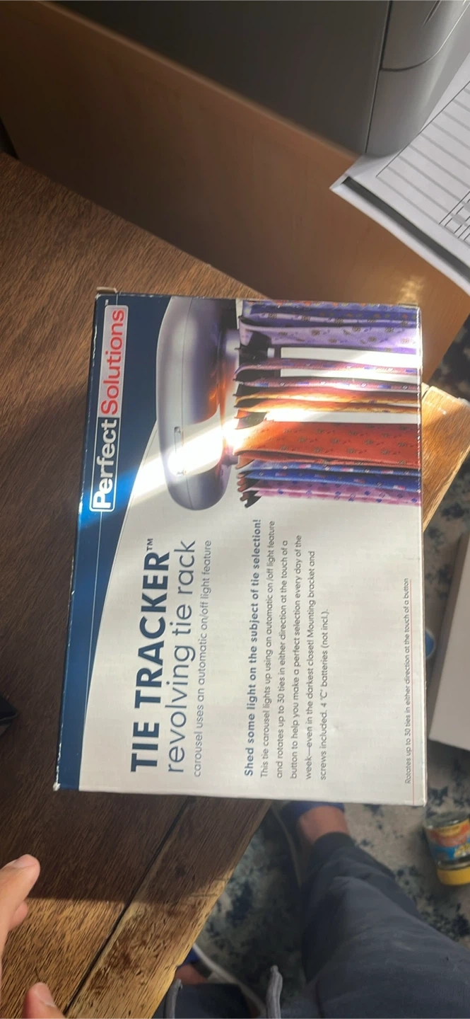 This tie carousel uses an automatic on/off light feature and rotates up to 30 ties at the touch of a button. Mounting bracket and screws are included. It runs on 4 'C' batteries, which are not included.