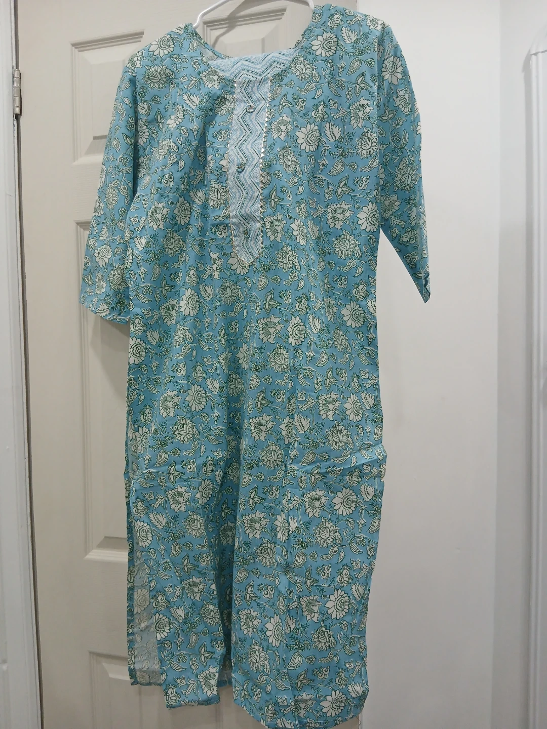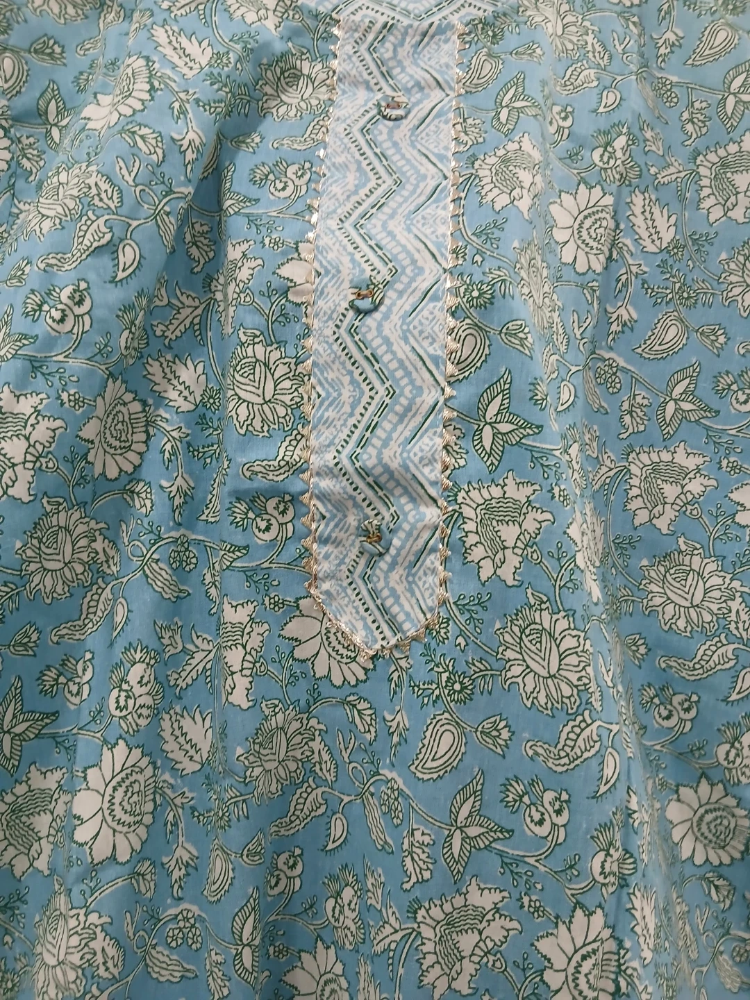 A lovely blue kurti with a white and green floral print. It features a decorative zigzag pattern and small buttons at the neckline. Made from lightweight fabric, it's perfect for warm weather. This kurti offers a comfortable and stylish option for casual wear.