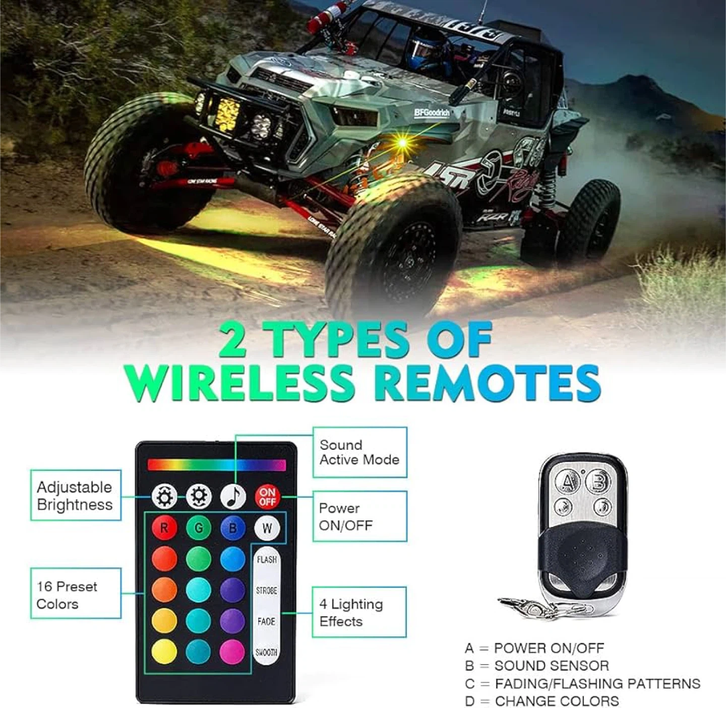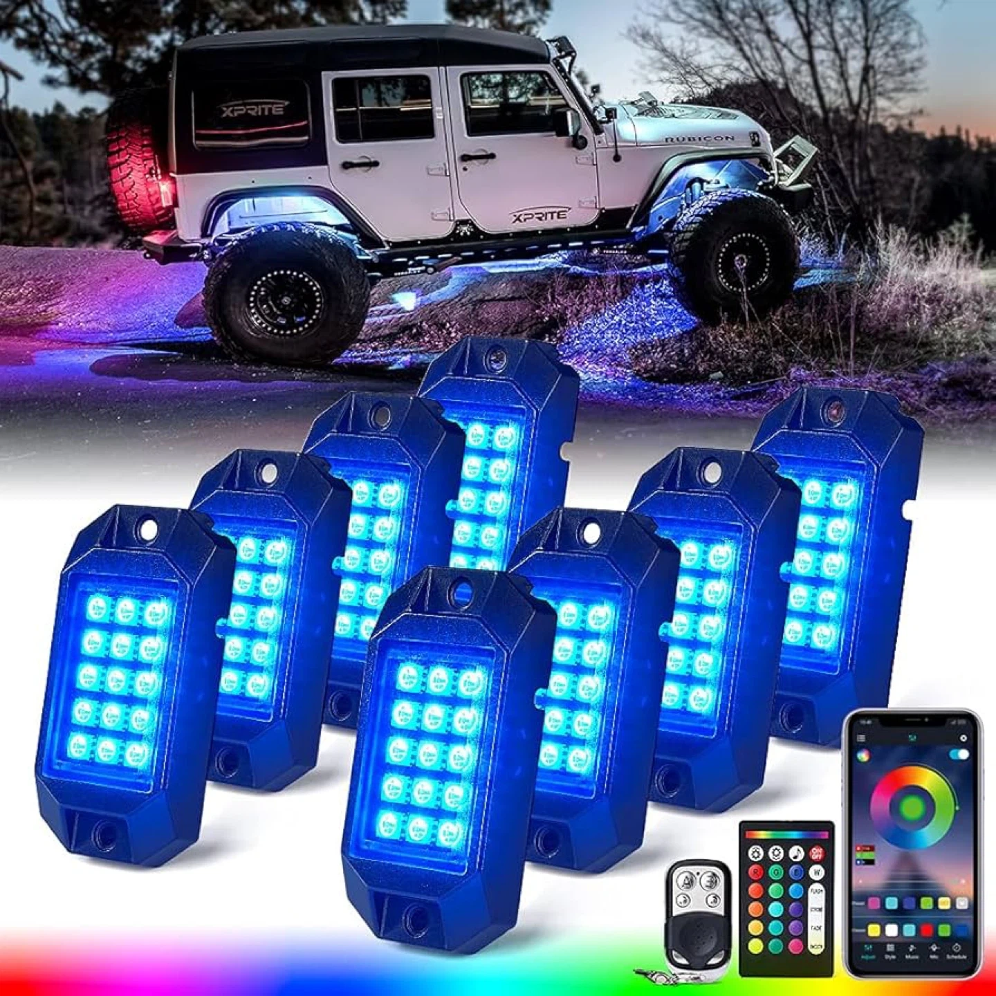 Xprite 8 Pods Rock Lights Kit - Underglow Bluetooth RGB Multicolor Neon Accent Music DIY Lighting with RF Controller for Off Road Trucks Cars UTV ATV SUV RZR