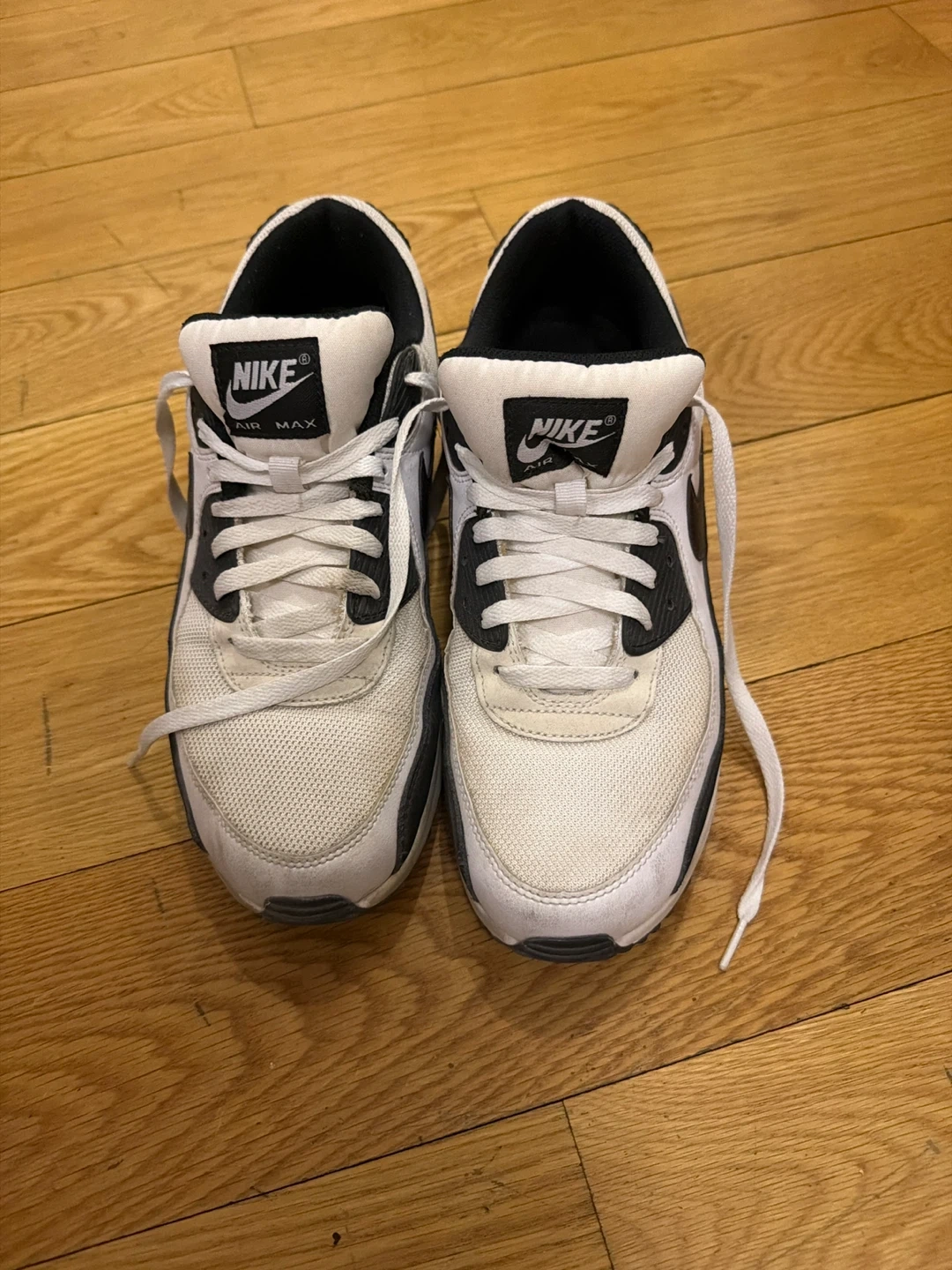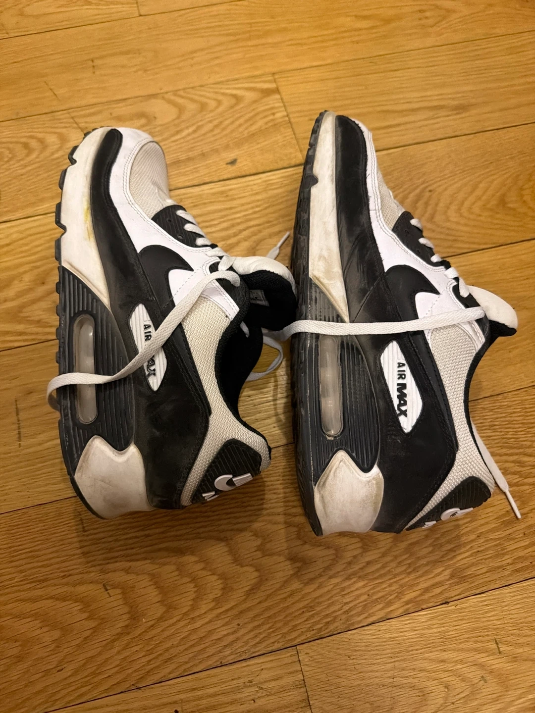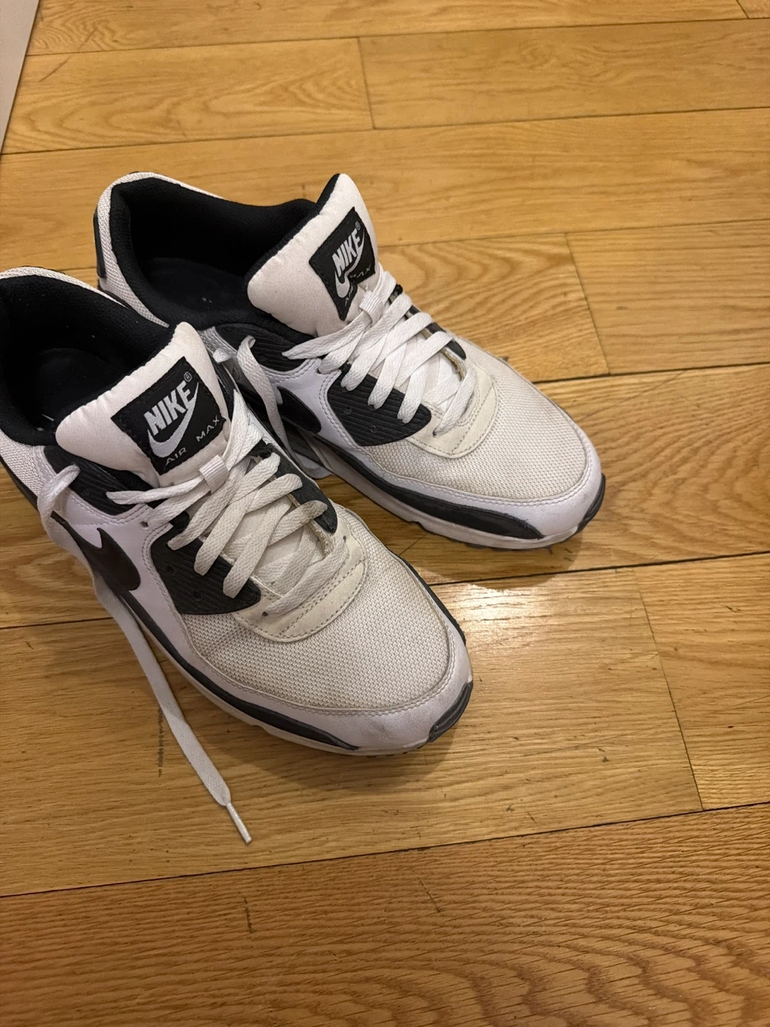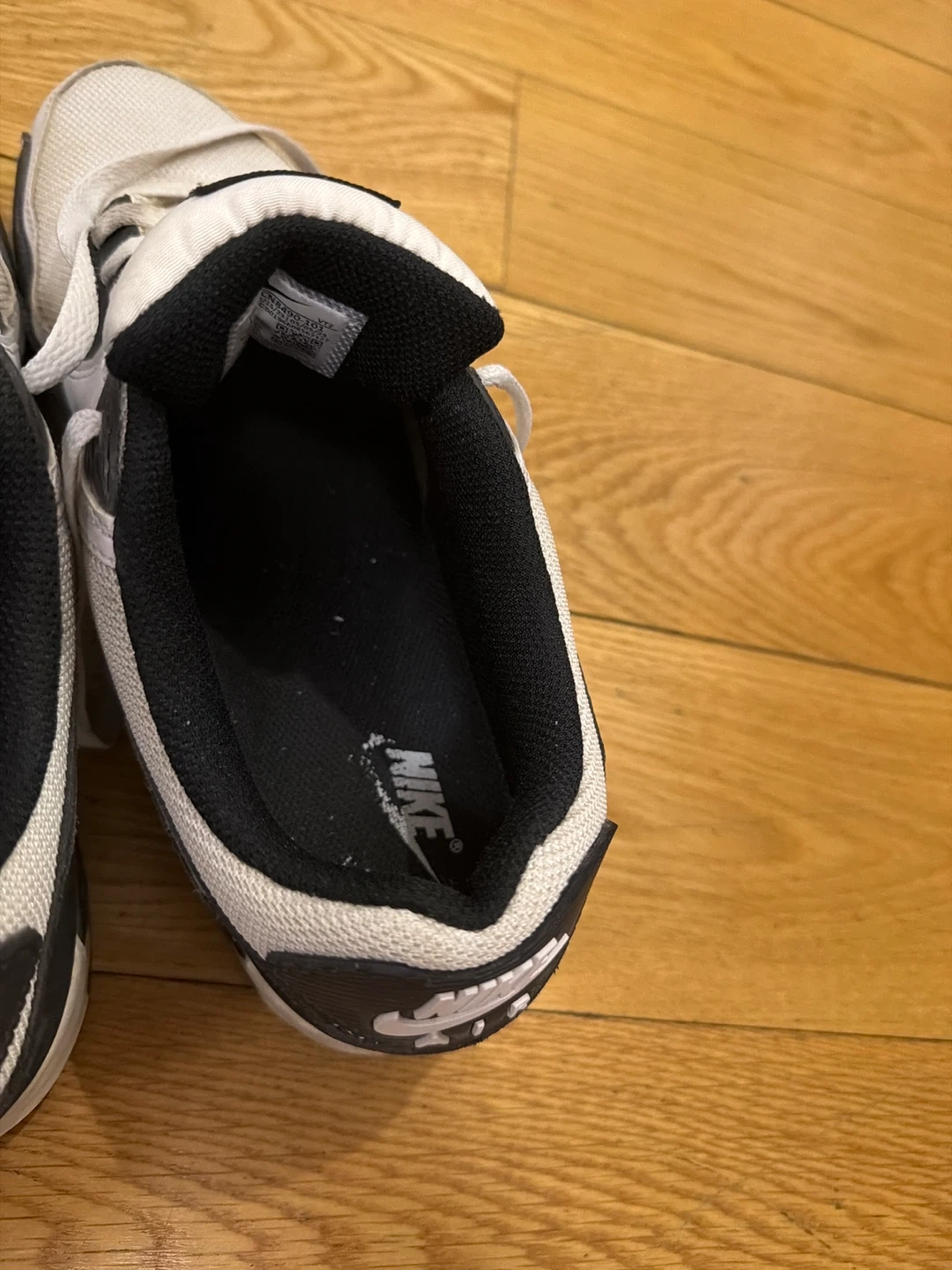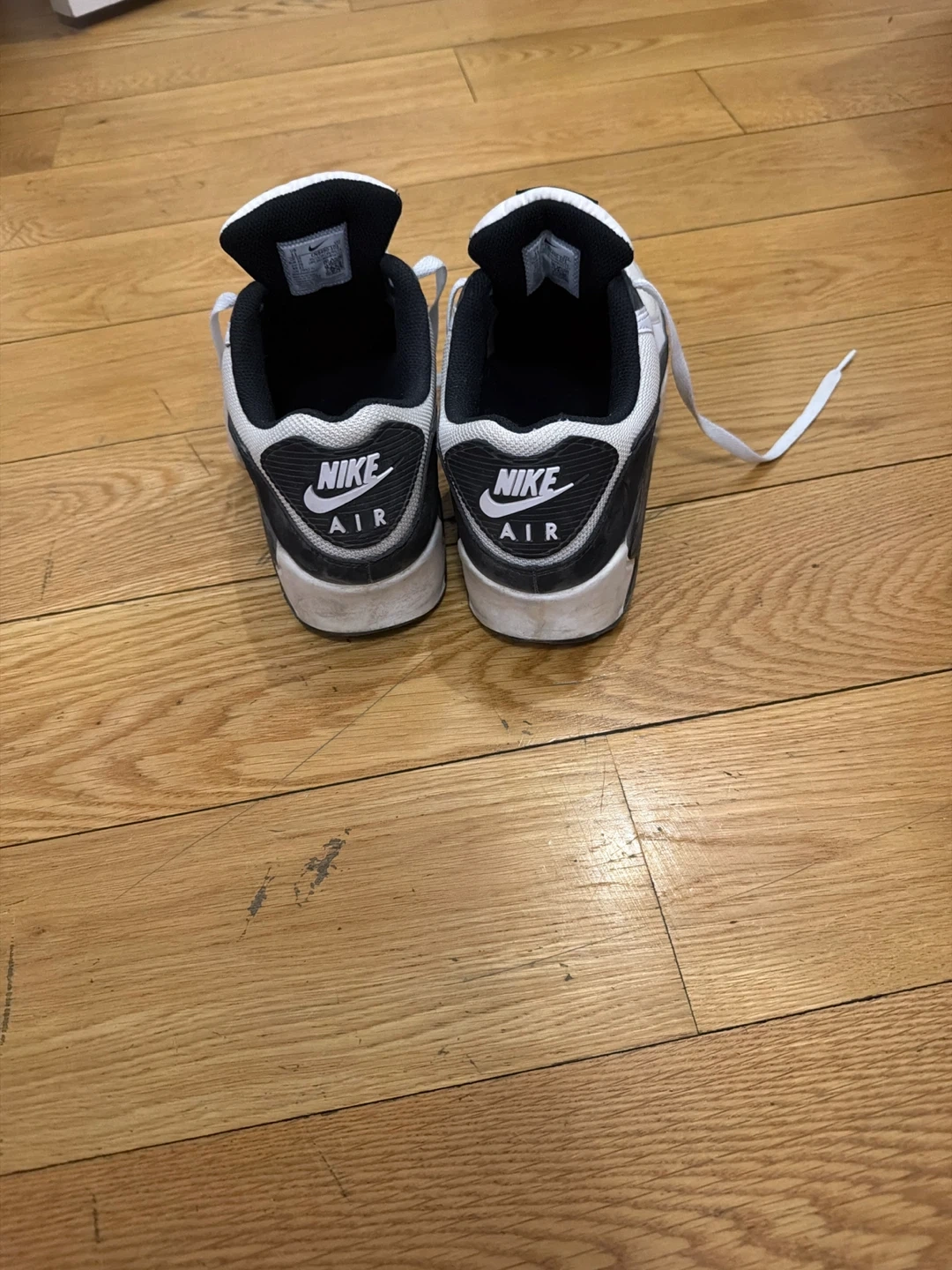Nike Air Max 90 sneakers in black and white. Mesh and synthetic leather upper with rubber sole. These shoes are perfect for everyday wear and light athletic activities.