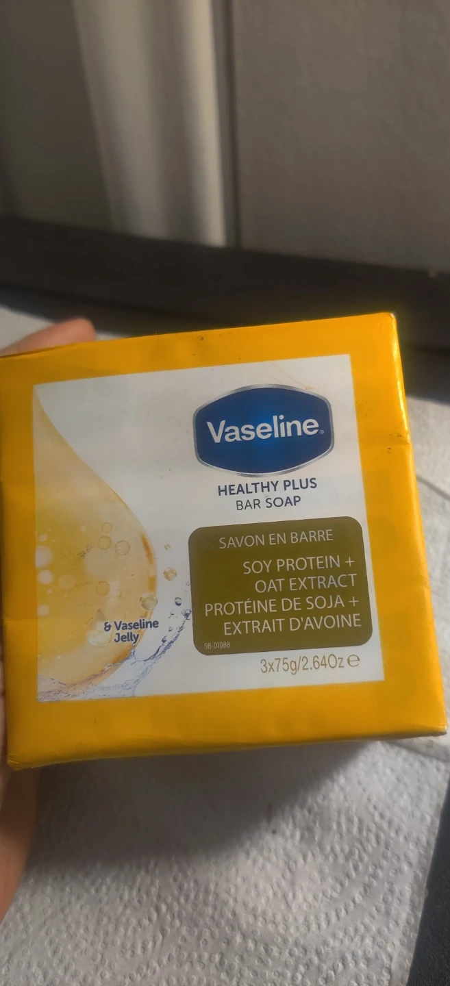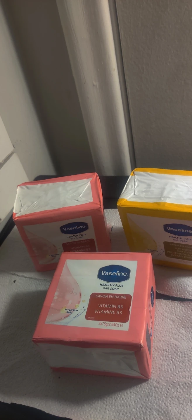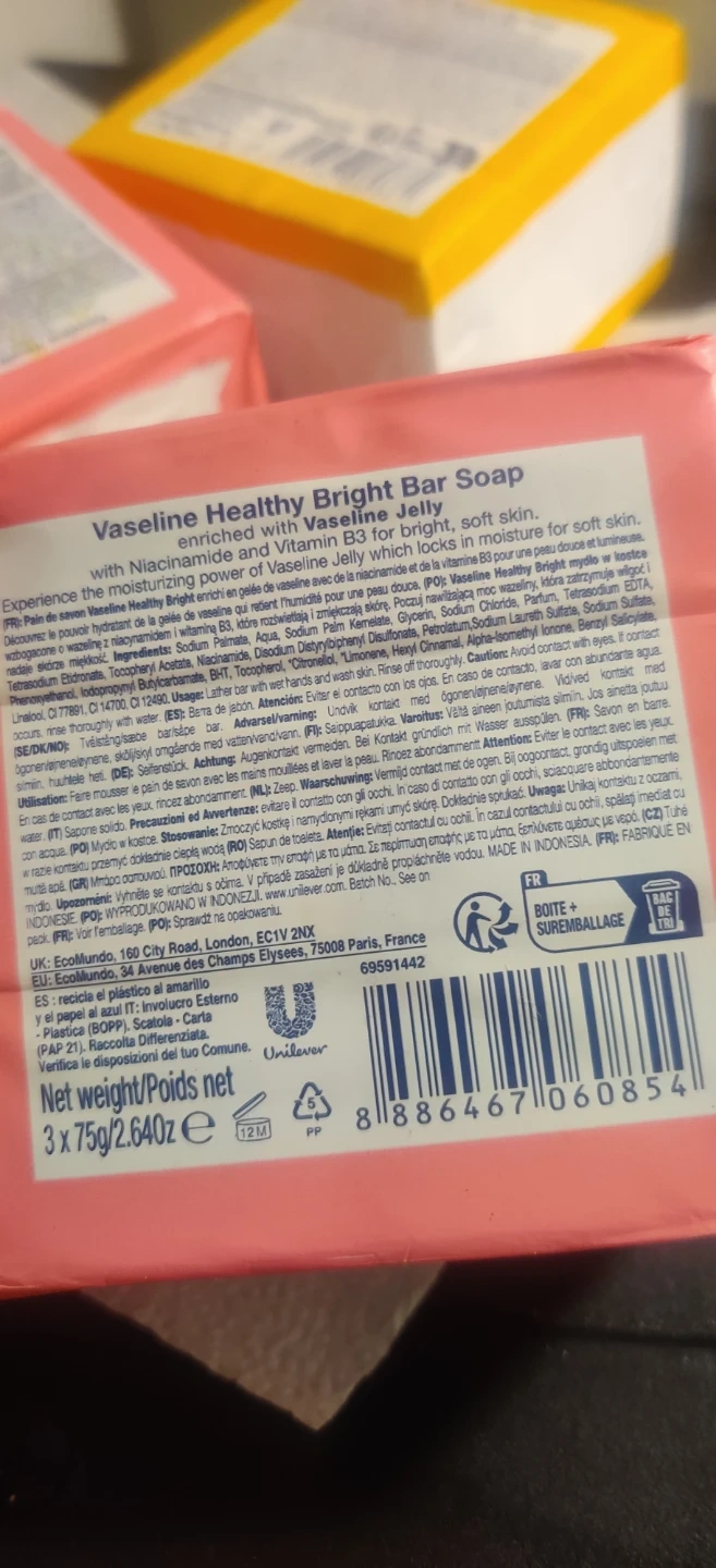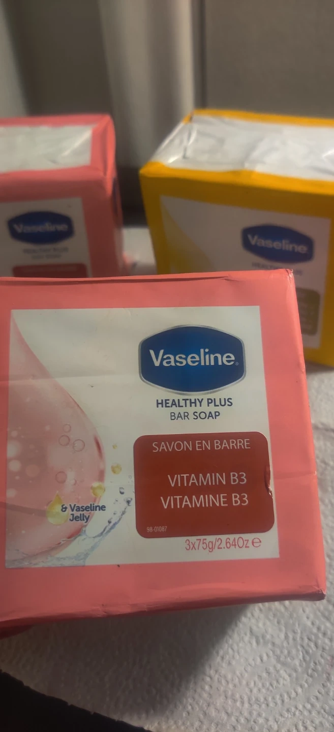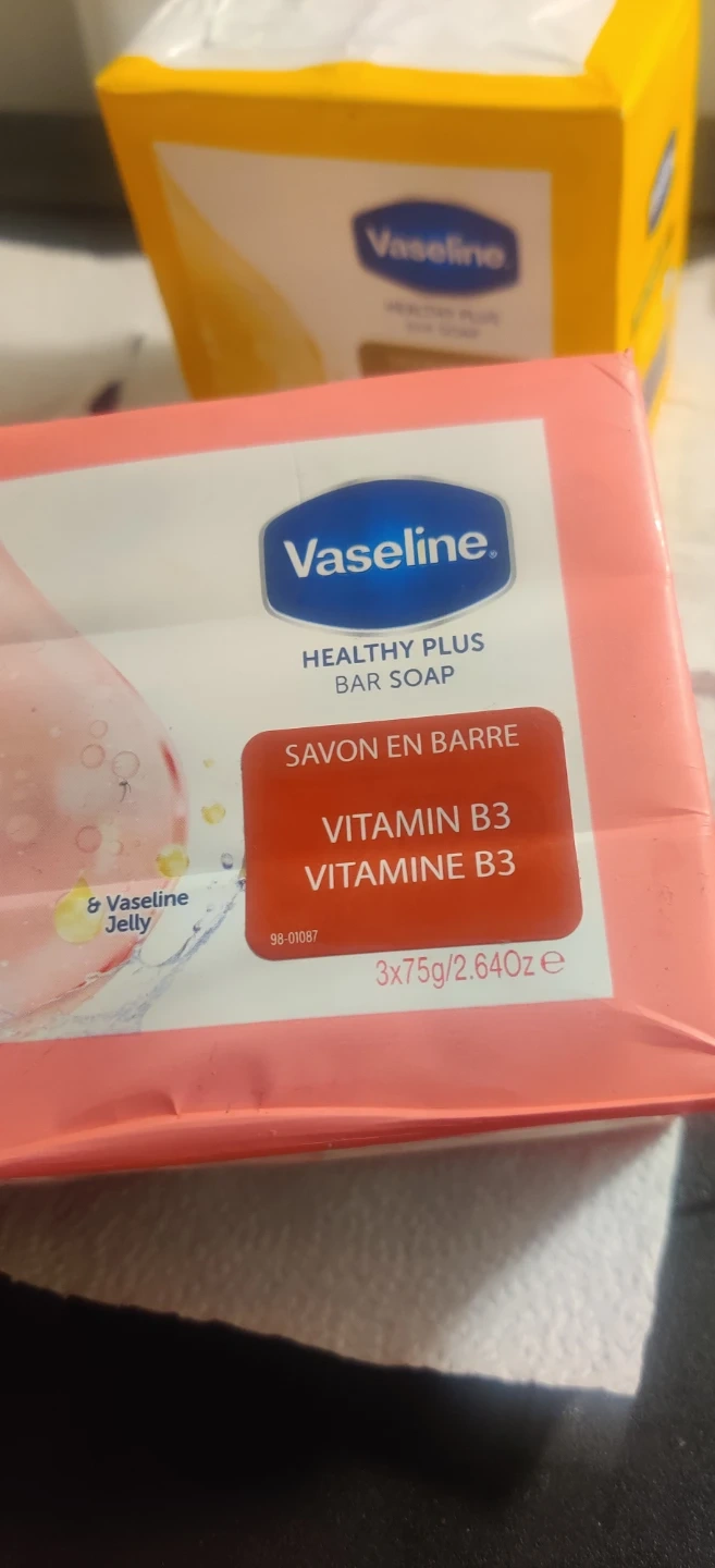 3 packs of Vaseline Healthy Bright bar soap enriched with Vitamin B3 for soft skin. Each pack contains 3 bars