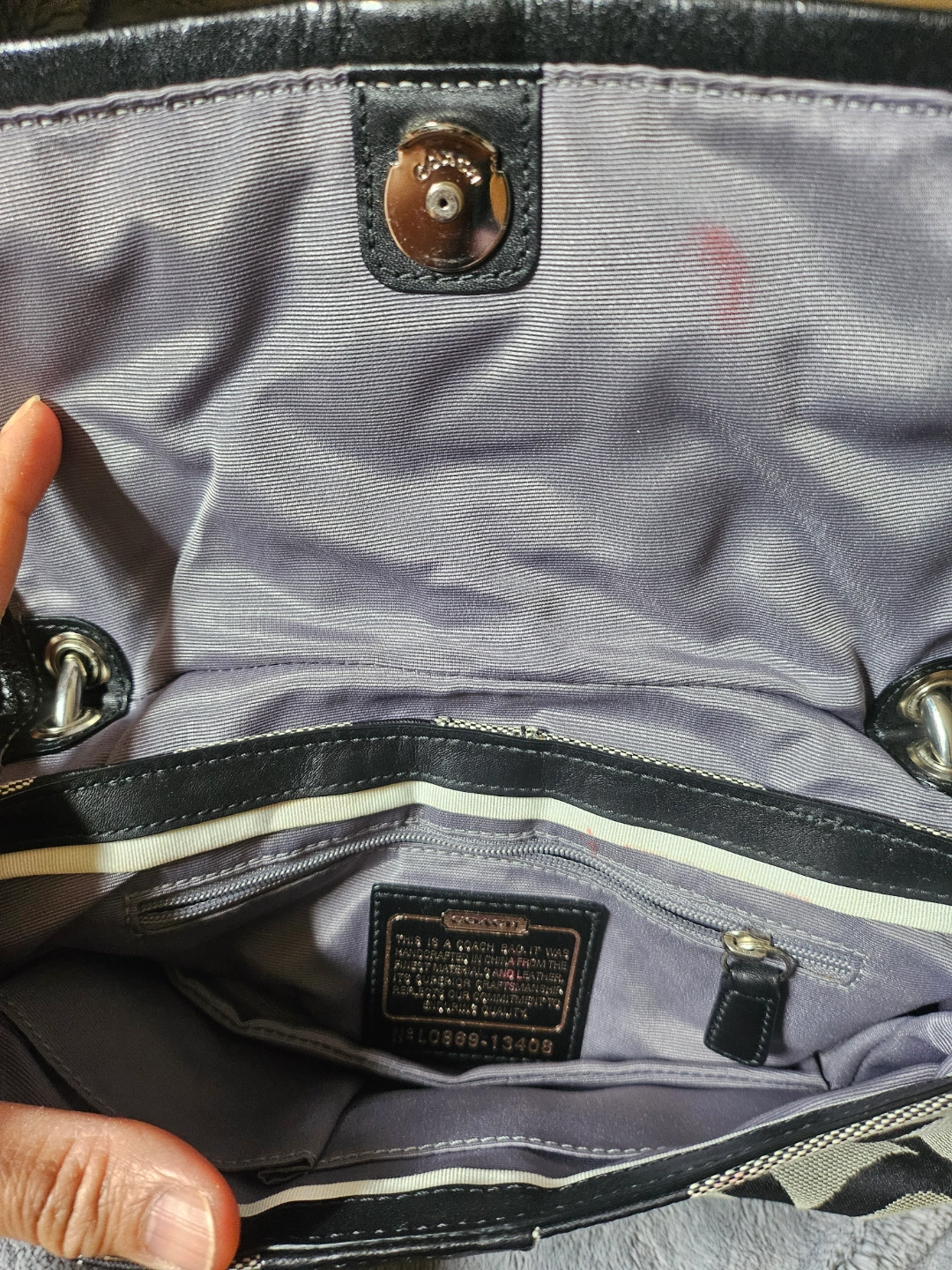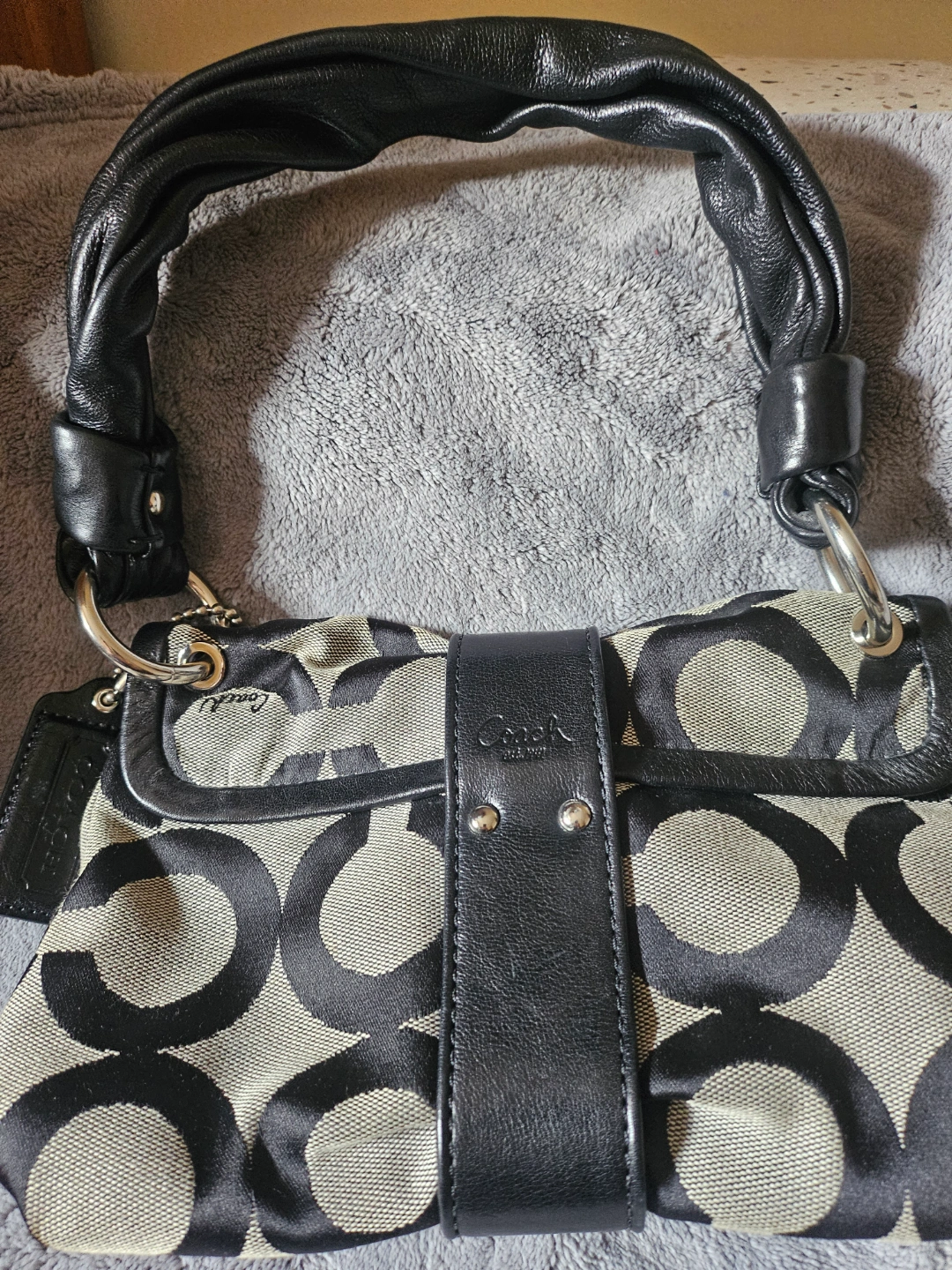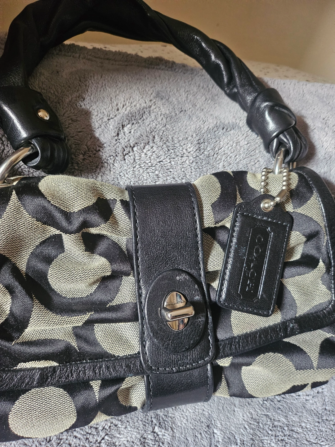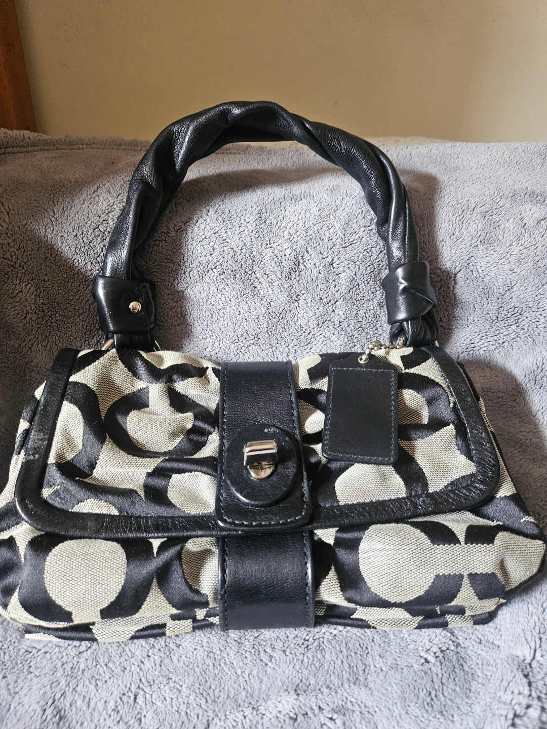 Pre-owned Coach handbag. Black and beige signature C pattern. Leather handles and accents. Small interior pockets. Slight wear.