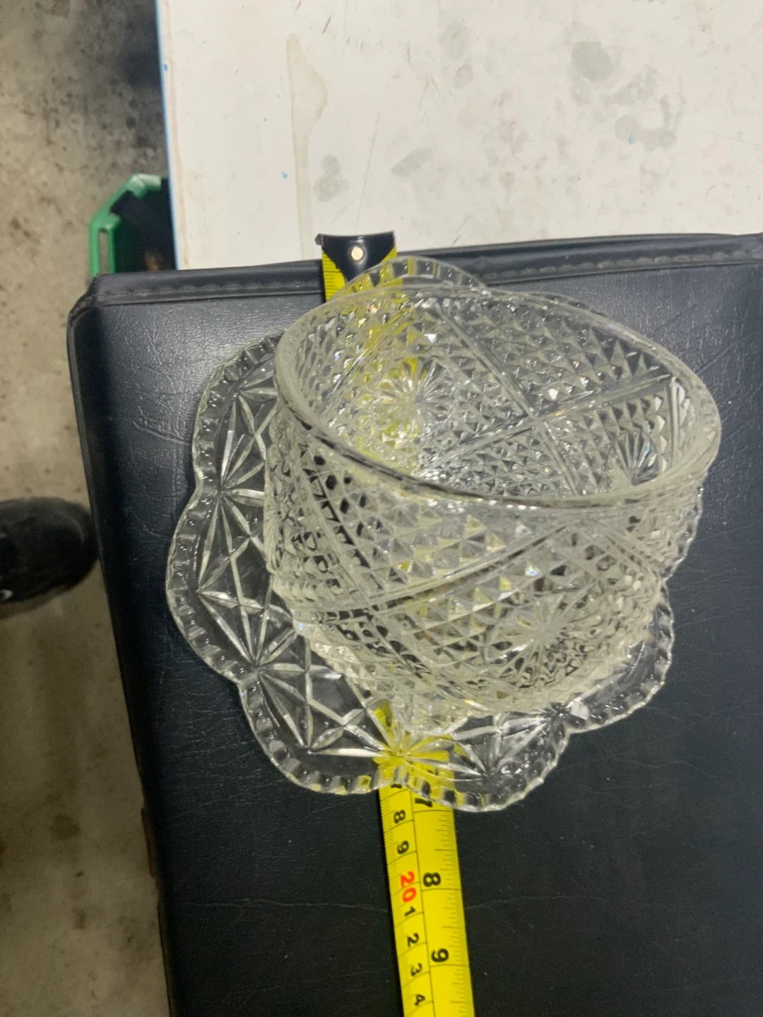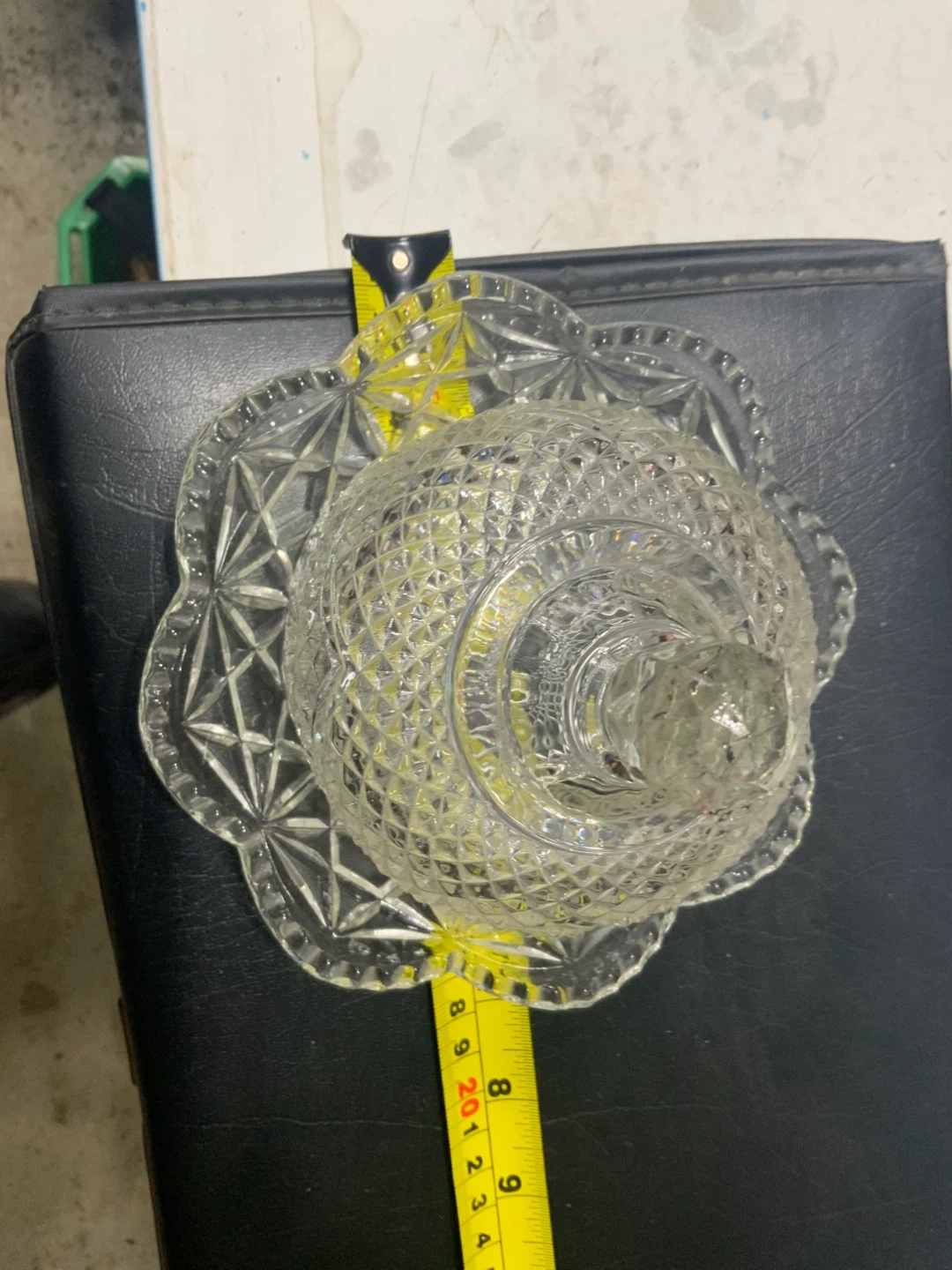 A beautiful clear glass candy dish with intricate diamond-cut patterns. It features a fluted edge on the base and a detailed bowl. Perfect for serving candies or small treats on a table!