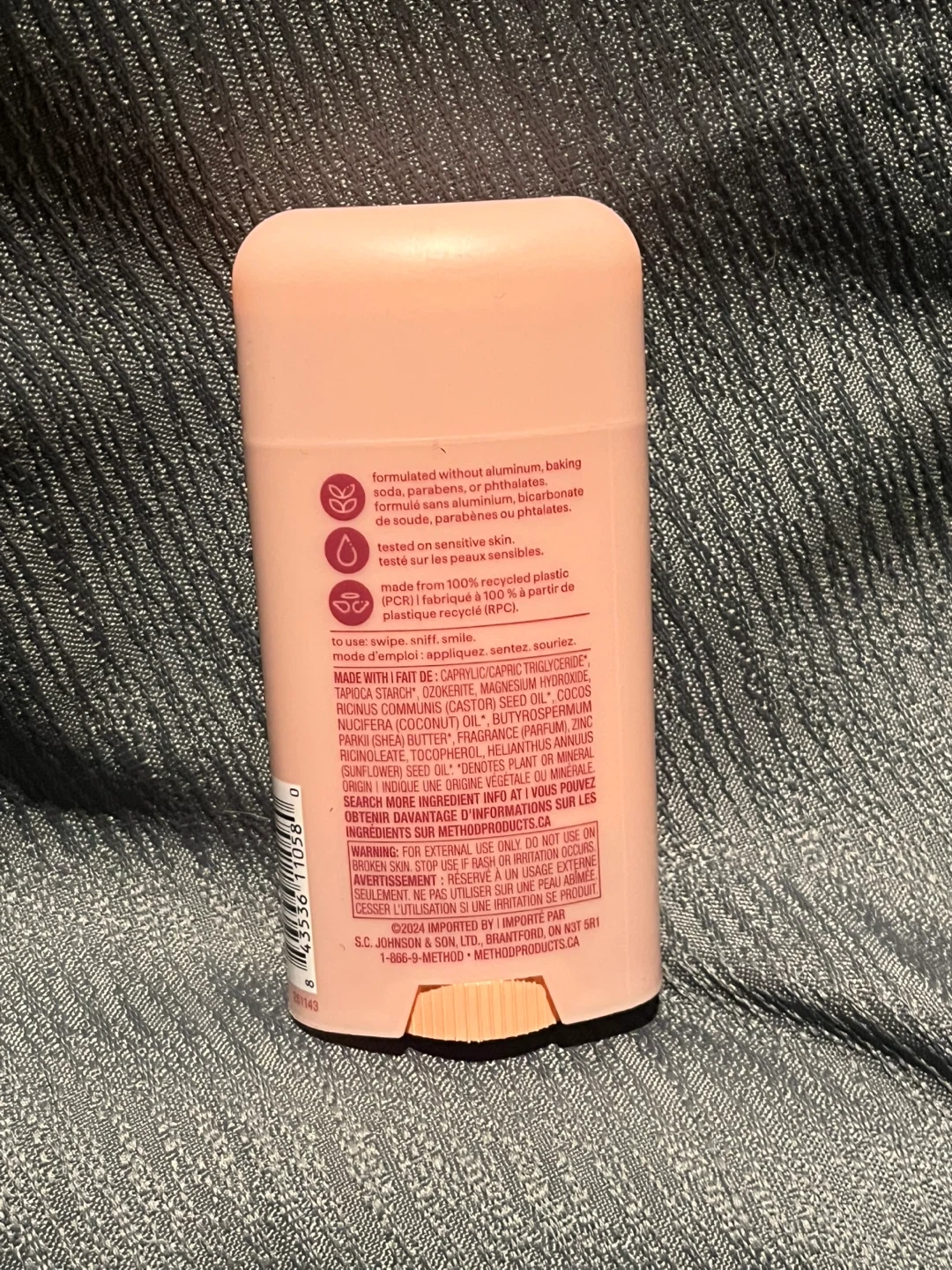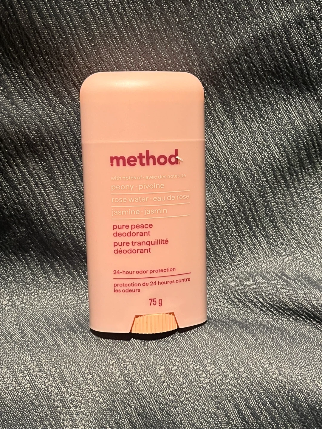 Method deodorant in a gentle rose water and jasmine scent. It's formulated without aluminum and provides 24-hour odor protection. This stick is 75g.