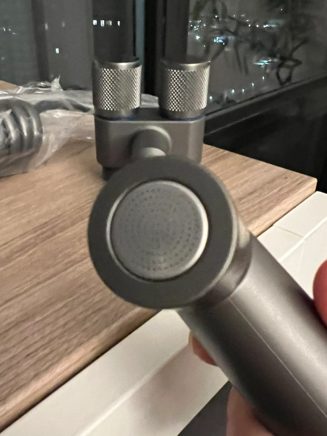 This is a brand new bidet sprayer set in box. It includes a sprayer head, a hose, and plumbing tape. The sprayer is grey.