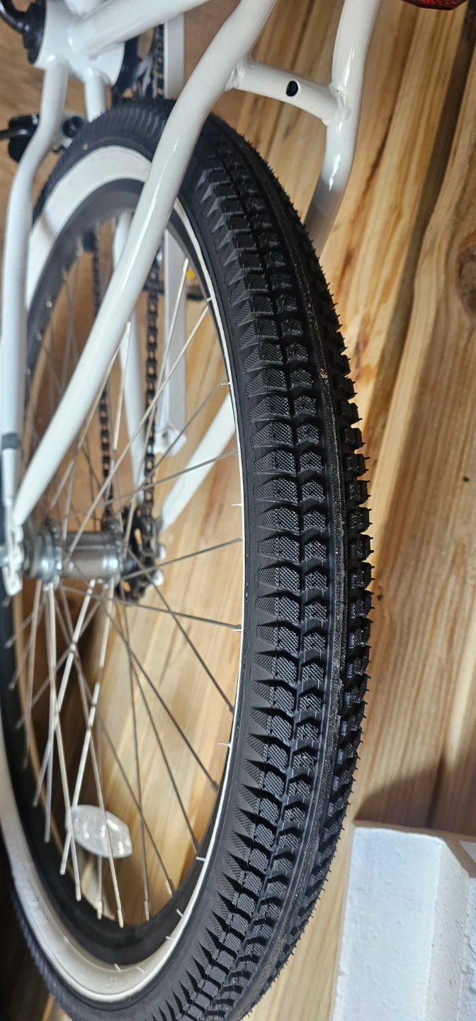 This is a white cruiser bicycle with a classic design. It features white-wall tires and a comfortable seat. Perfect for leisurely rides around the neighbourhood!
