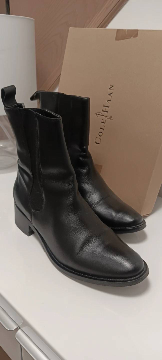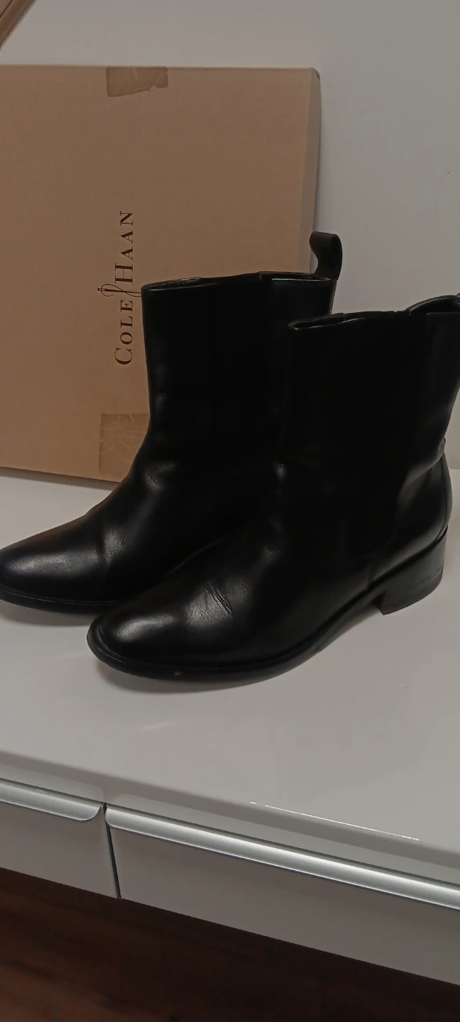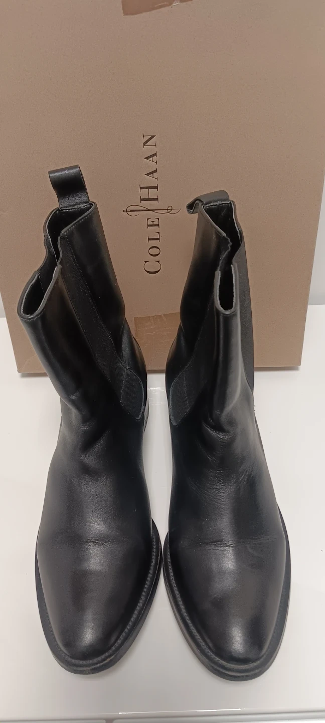 Black leather ankle boots from Cole Haan. These boots feature elastic side panels for easy on and off. They have a low heel and a classic, versatile design.