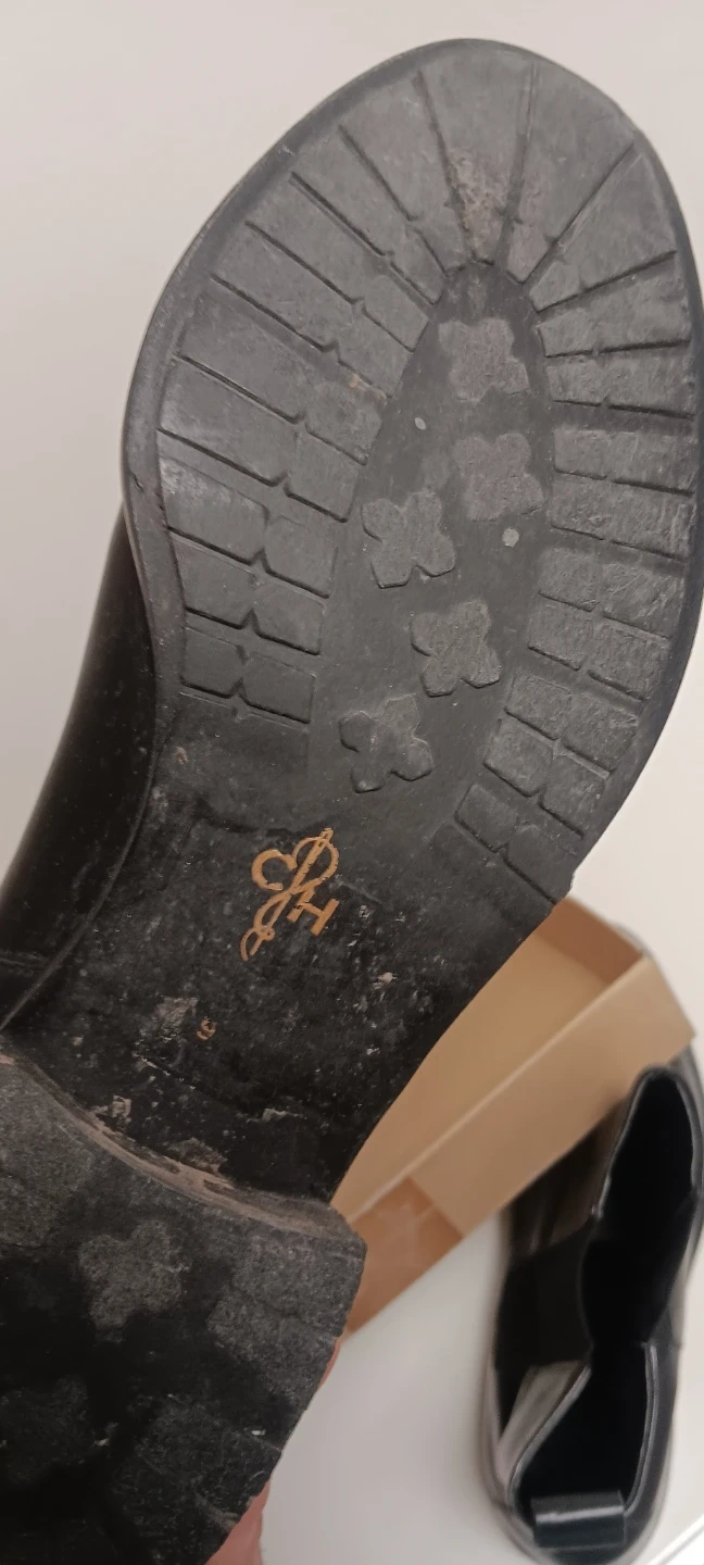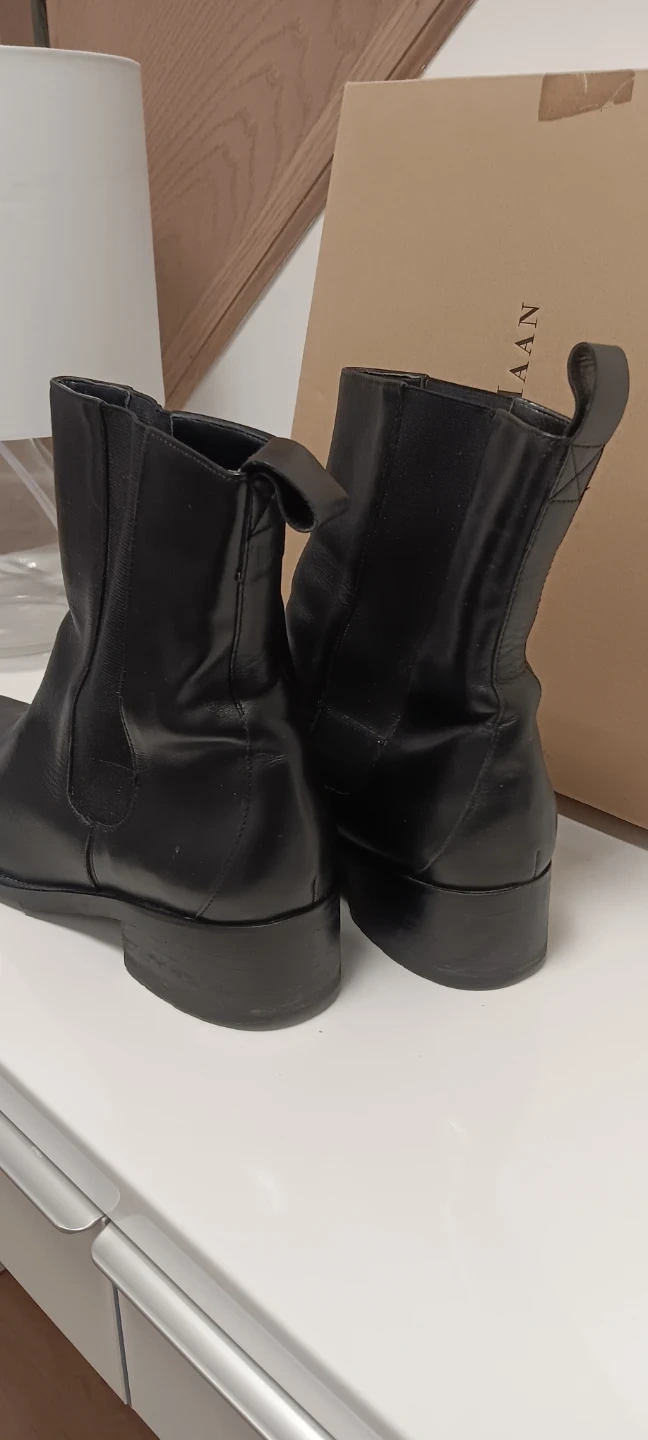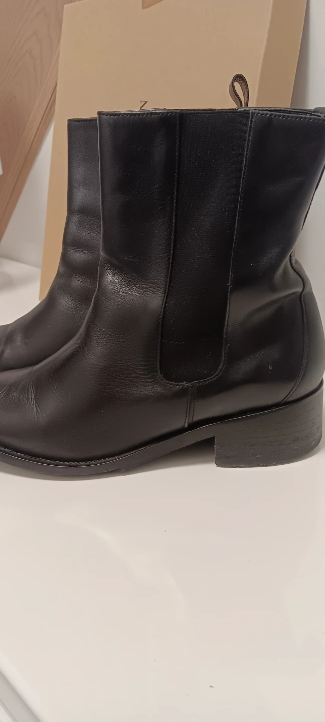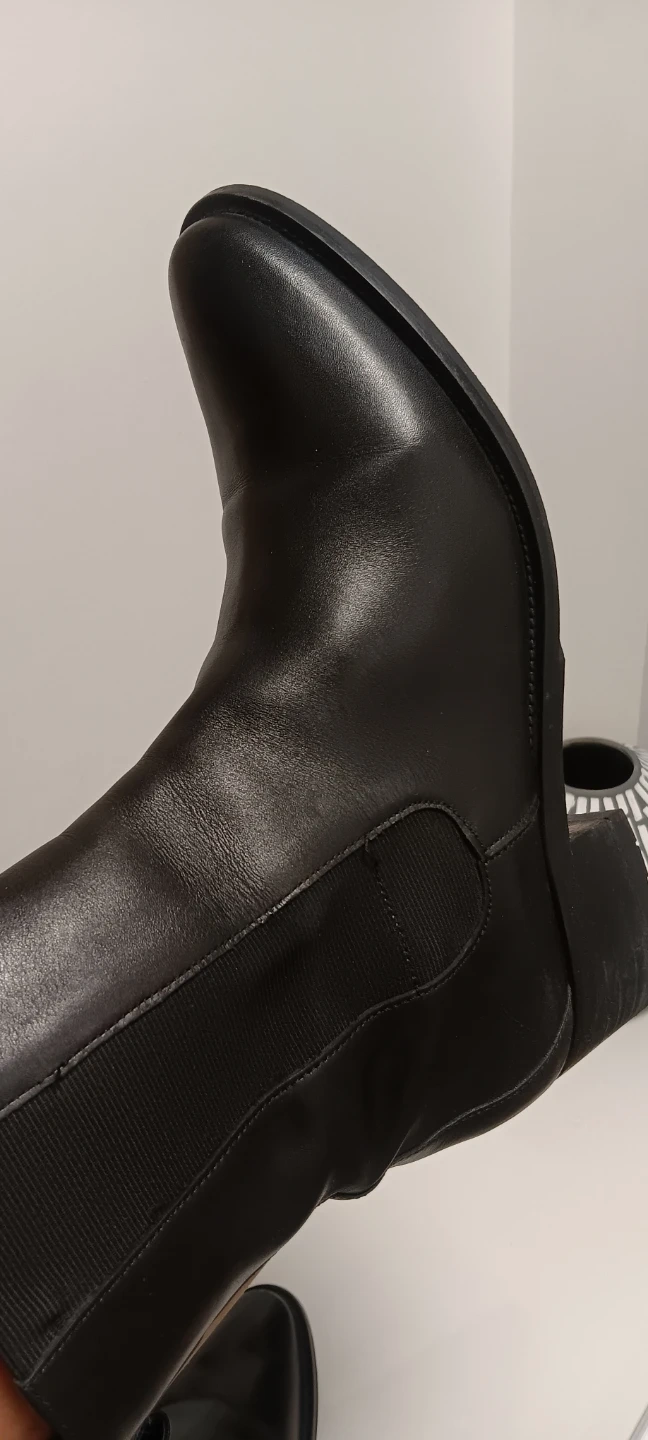 Black leather ankle boots from Cole Haan. These boots feature elastic side panels for easy on and off. They have a low heel and a classic, versatile design.