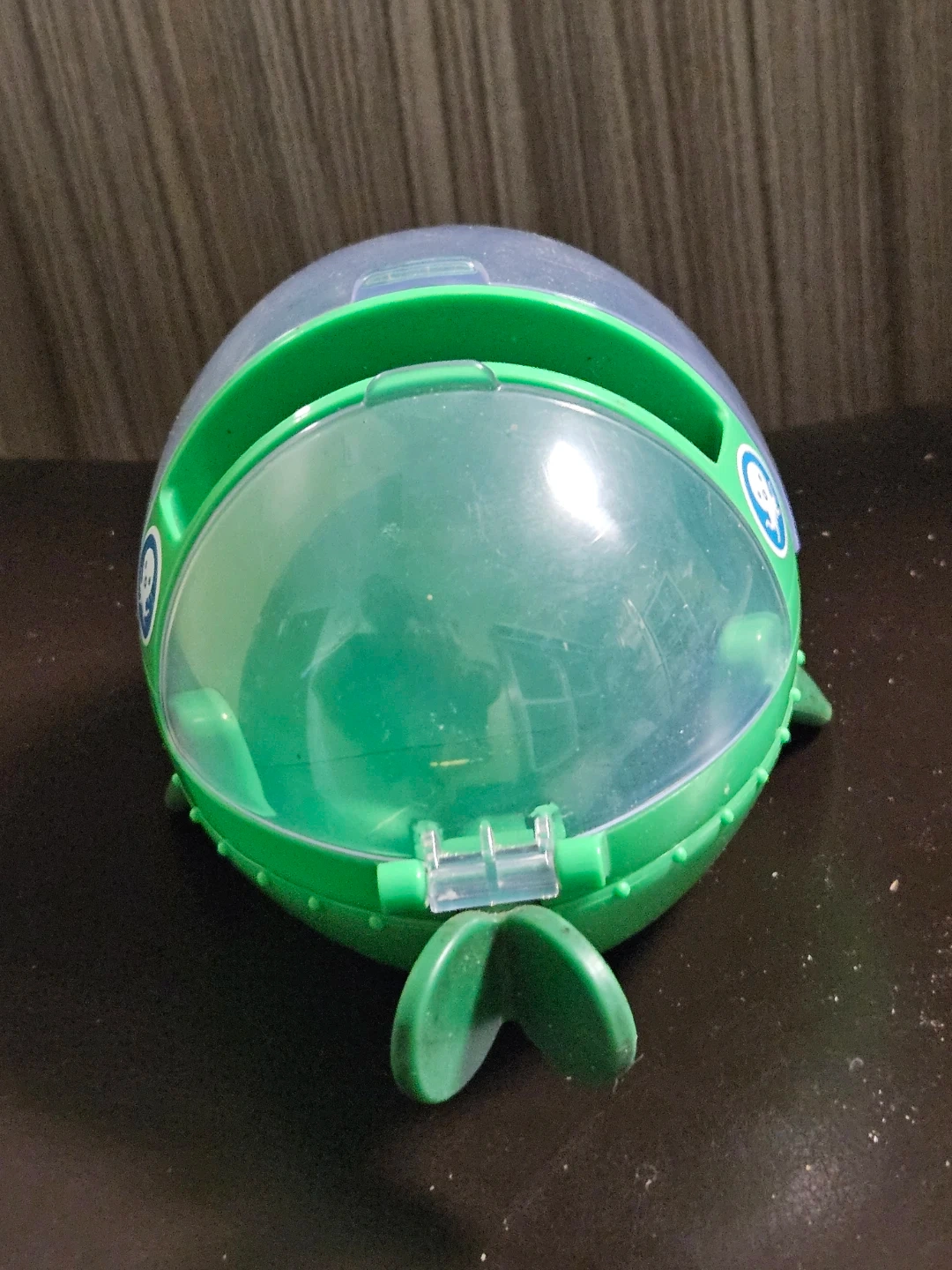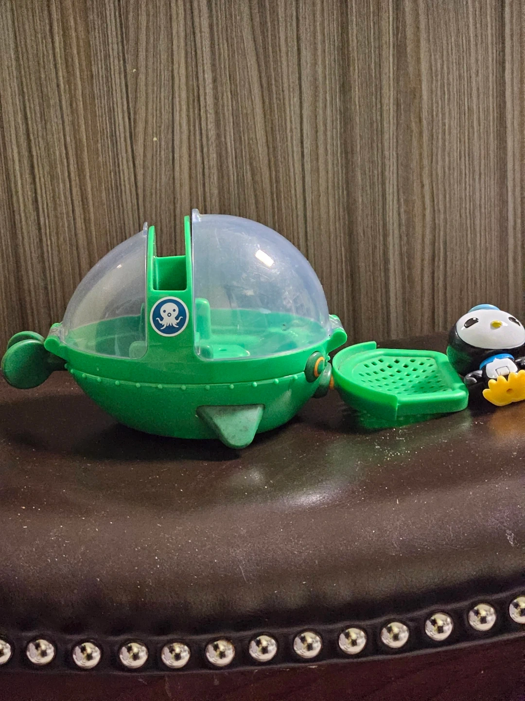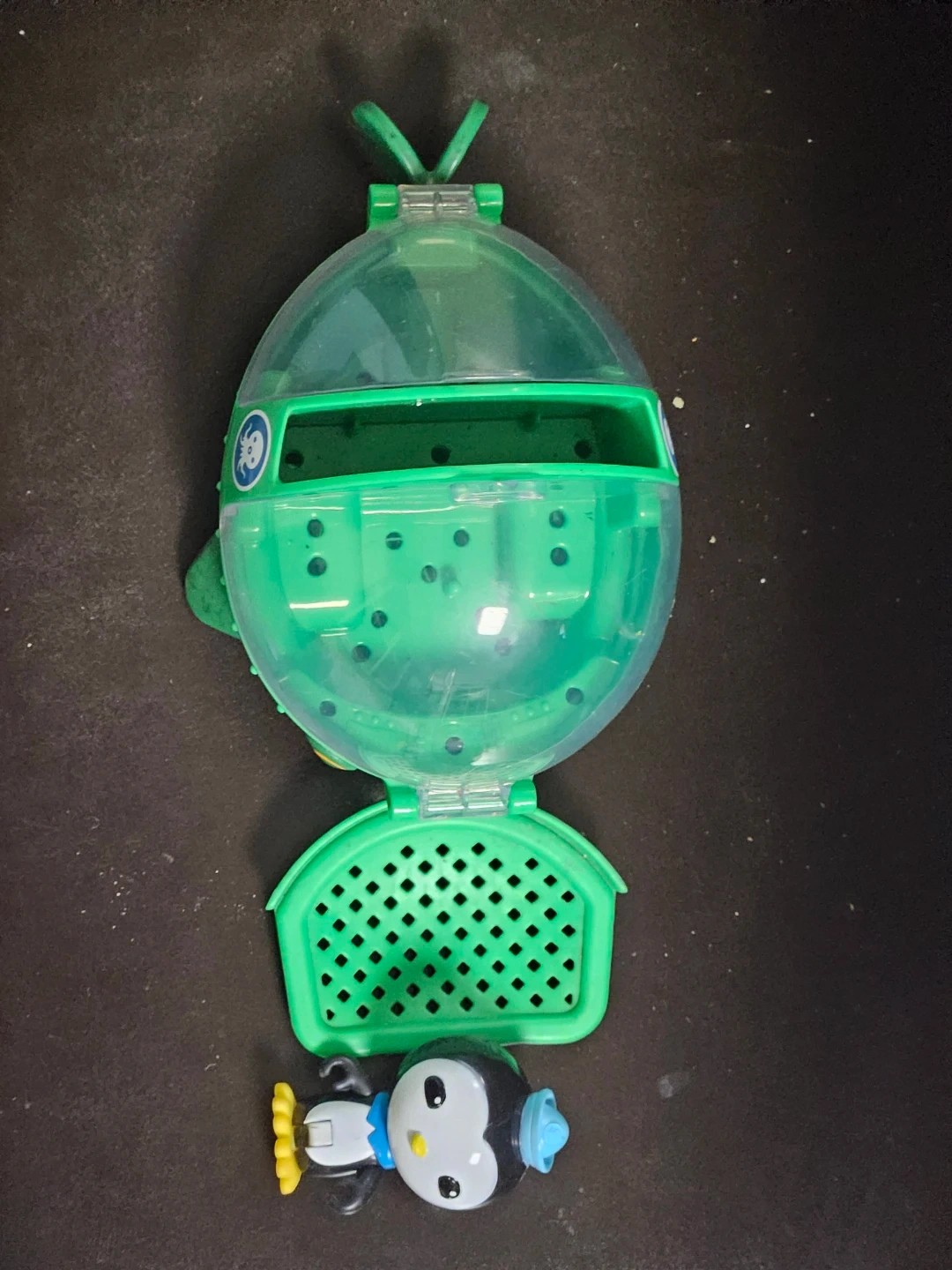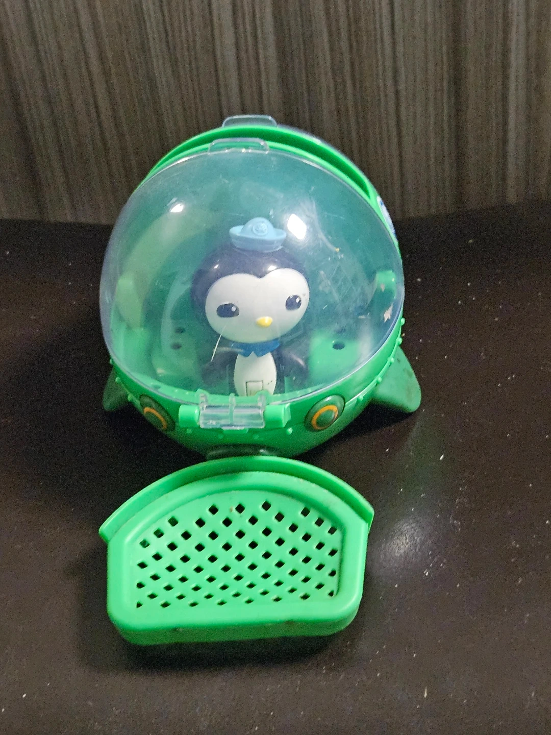 This is the Octonauts Barnacles Penguin vehicle playset. It's green with a clear dome. Includes the Barnacles figure. Plastic material.