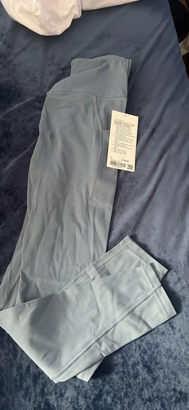 These Lululemon Align High-Rise pants are 28 inches long and feature pockets. They're made from soft, four-way stretch fabric. The size is 6. They're a great choice for yoga or everyday wear!