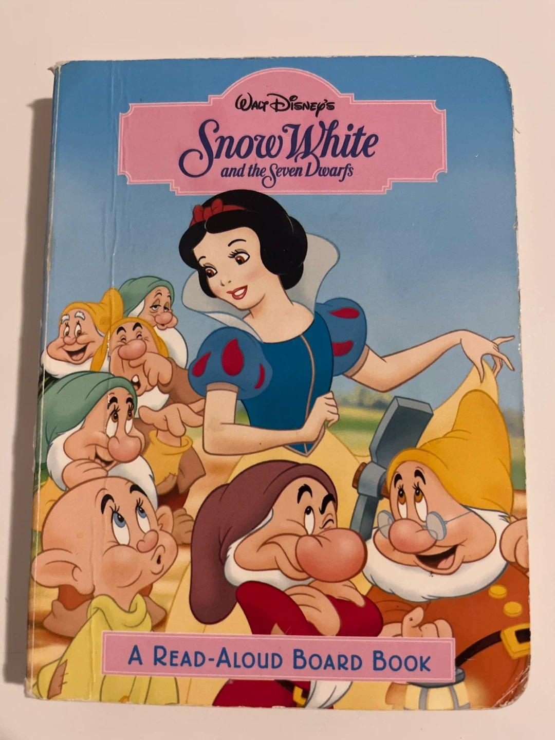 This is Walt Disney's Snow White and the Seven Dwarfs board book. It's a read-aloud book. This book is great for young children learning to read.
