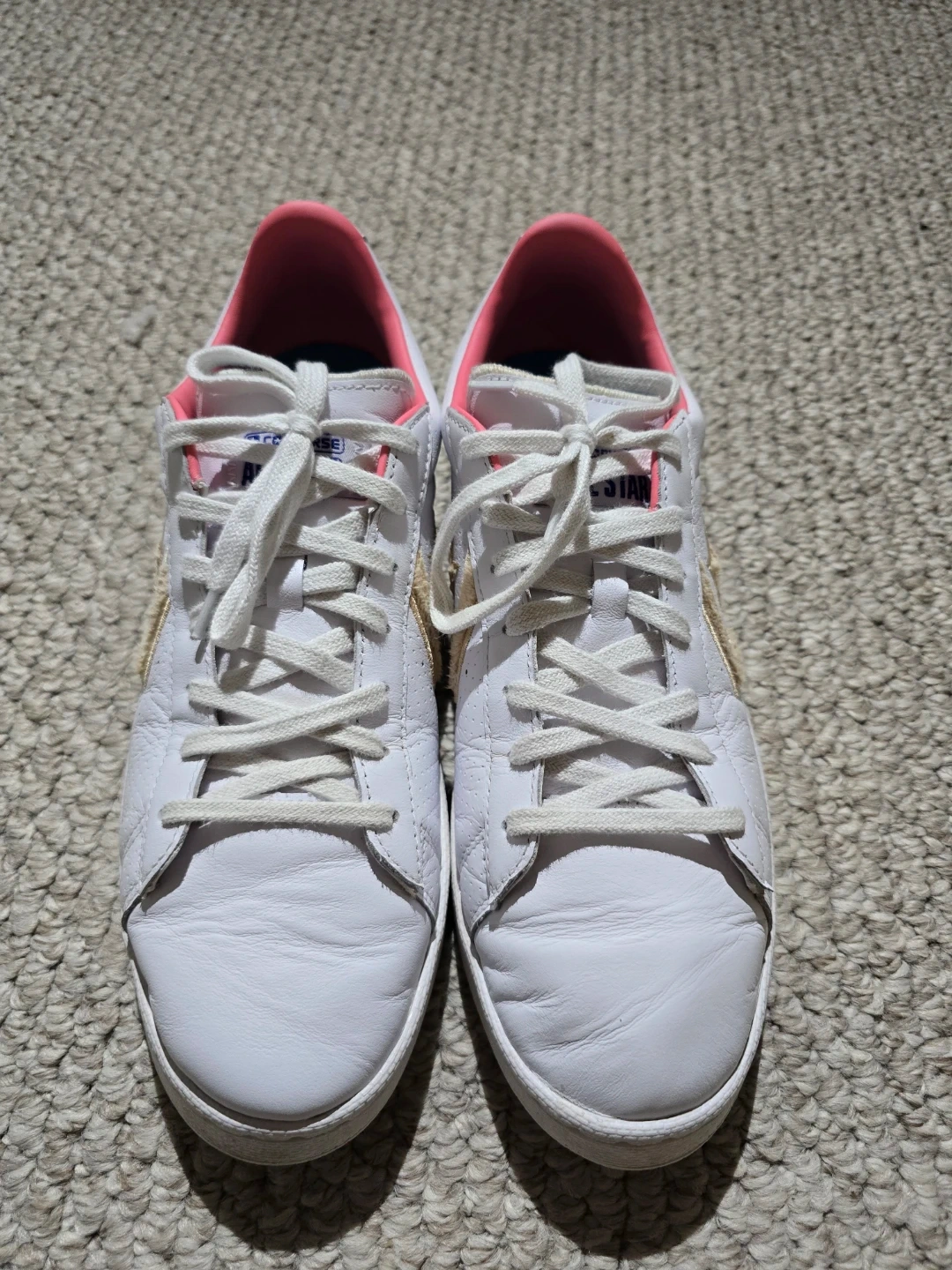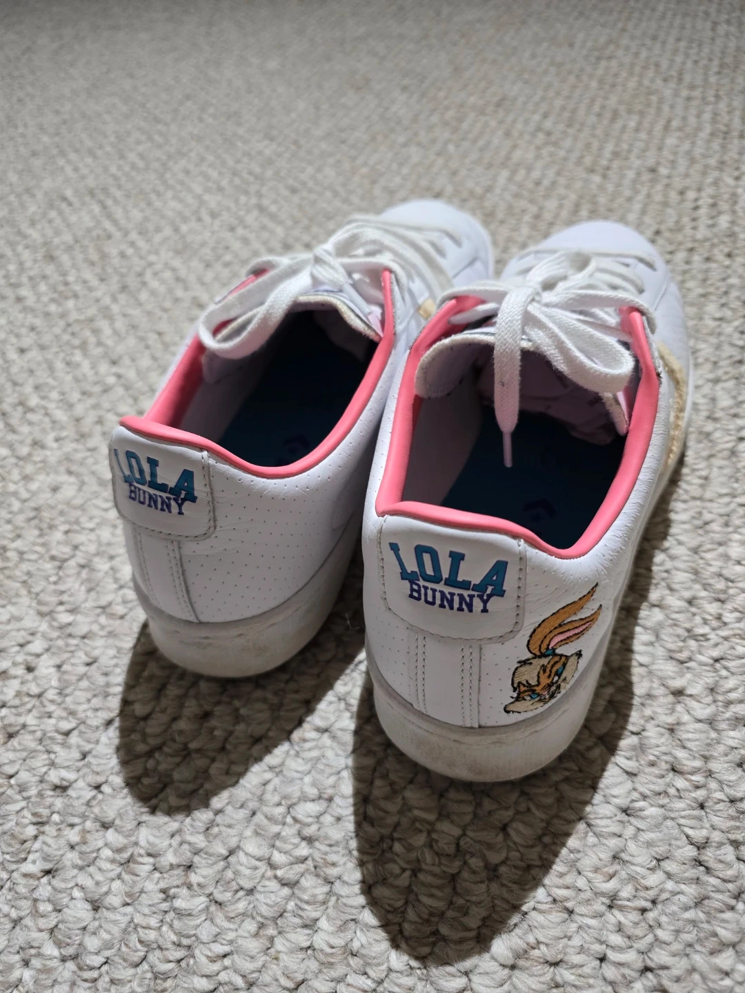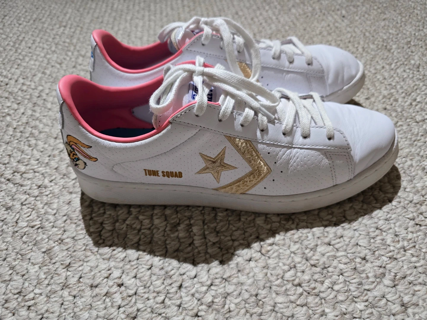 White Converse sneakers featuring Lola Bunny and "Tune Squad" detailing. Leather upper with pink accents. Size 8 women's (6.5 men's, 39 EUR).