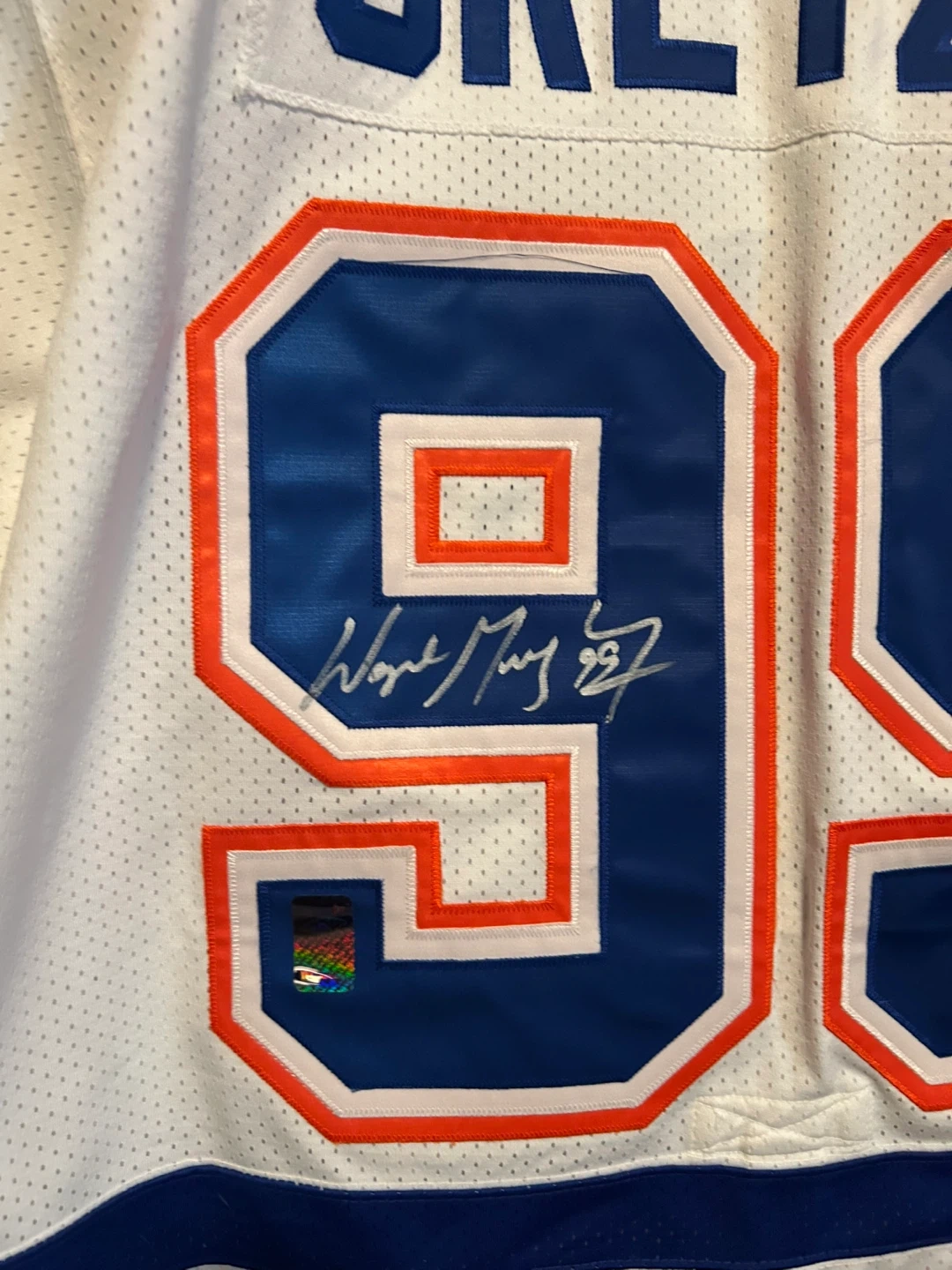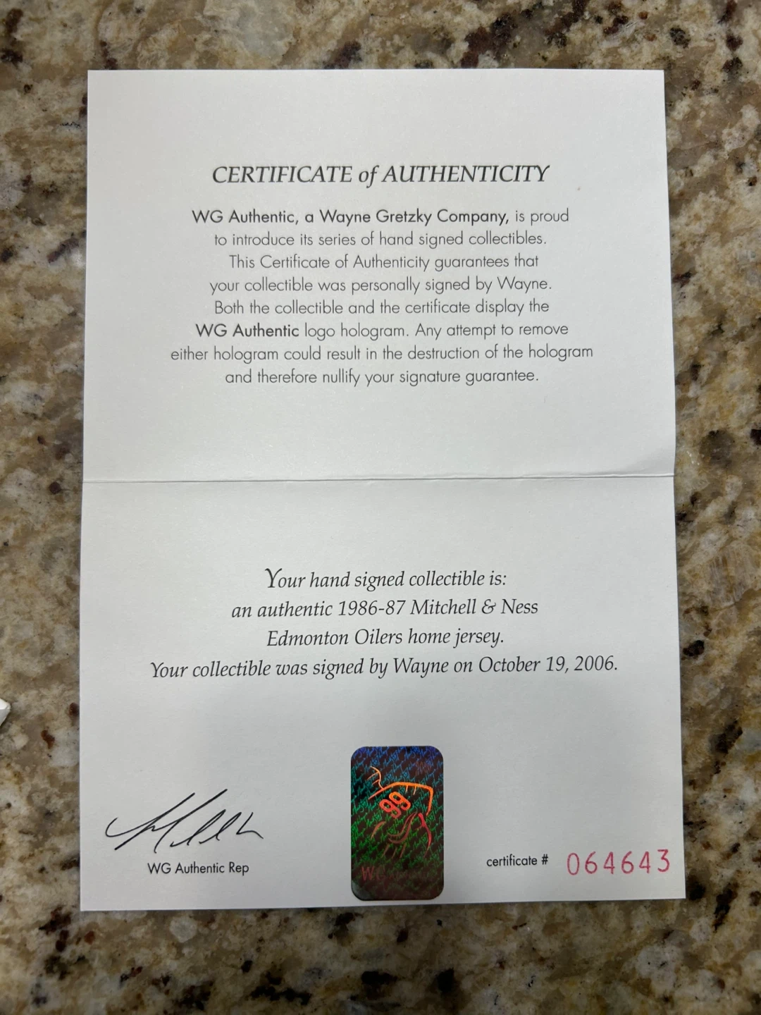 This is an authentic 1986-87 Mitchell & Ness Edmonton Oilers home jersey signed by Wayne Gretzky. Never been worn. It's a size 48 (XL) and made of 100% polyester. The jersey was signed on October 19, 2006, and includes a certificate of authenticity from WG Authentic. This is a fantastic piece for any hockey collector!