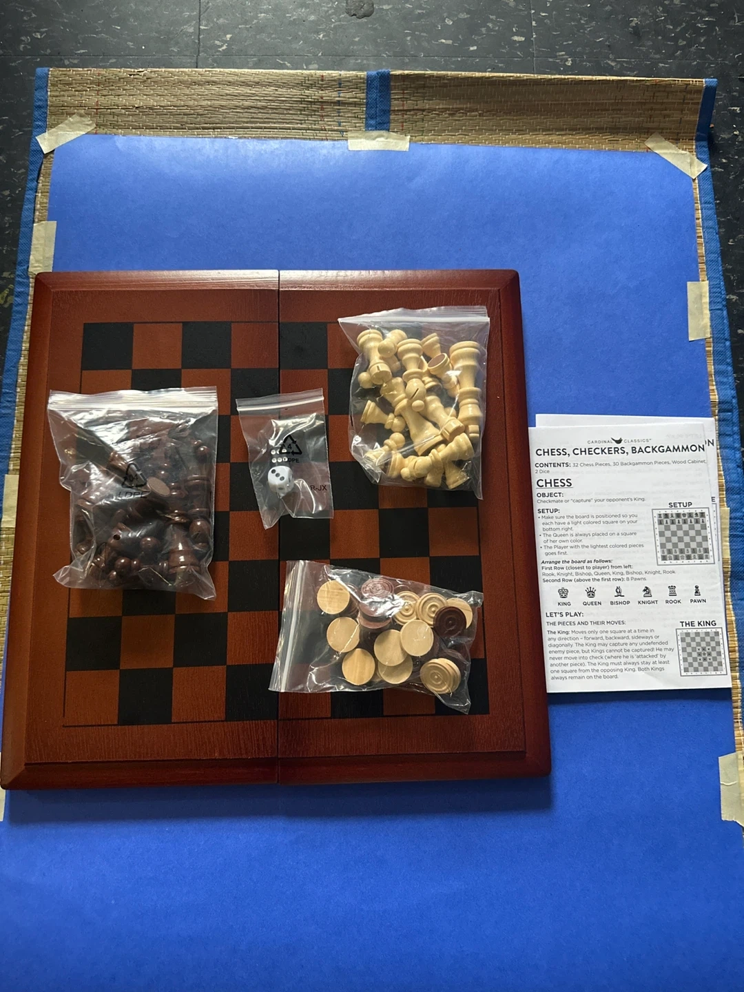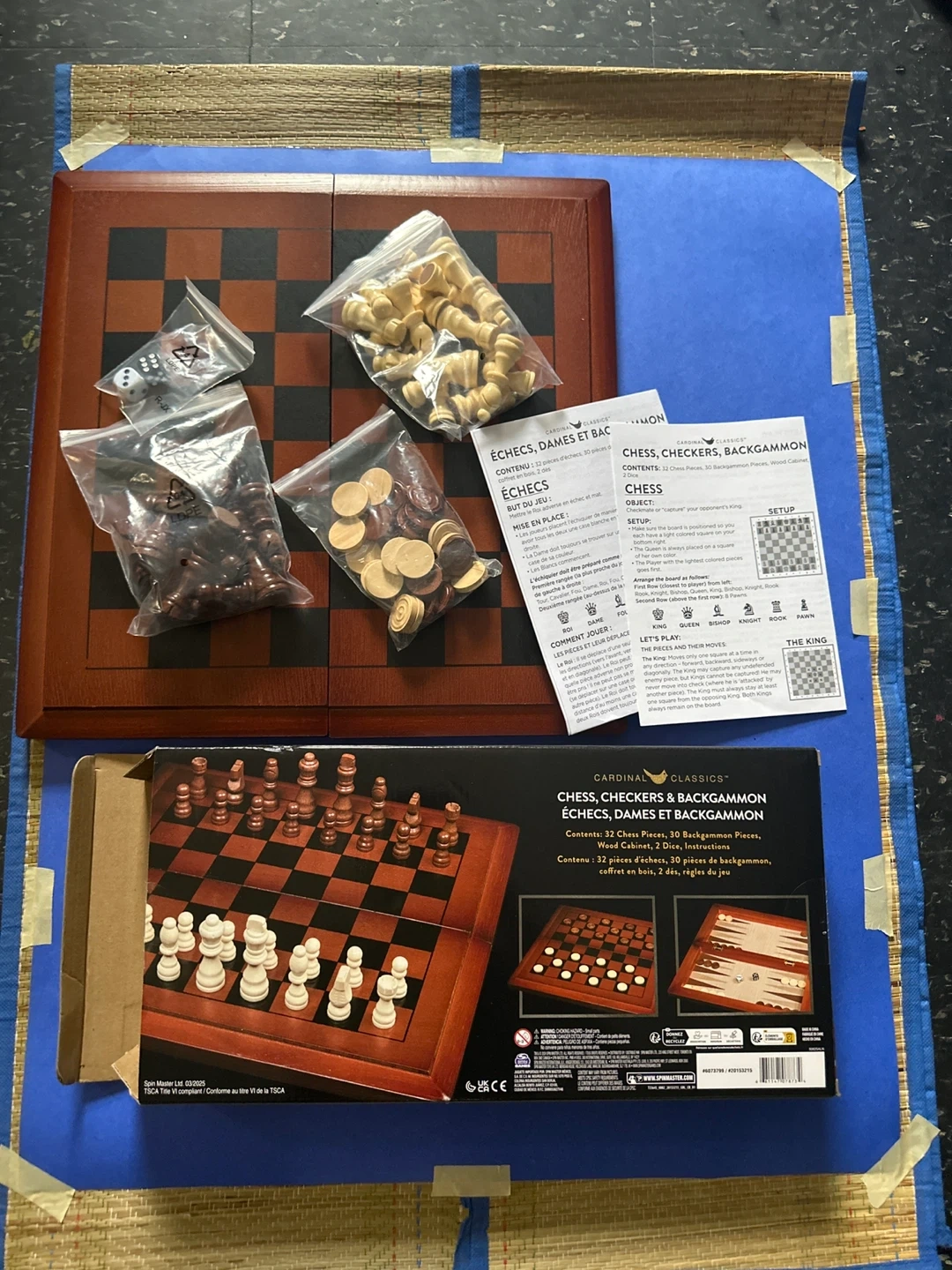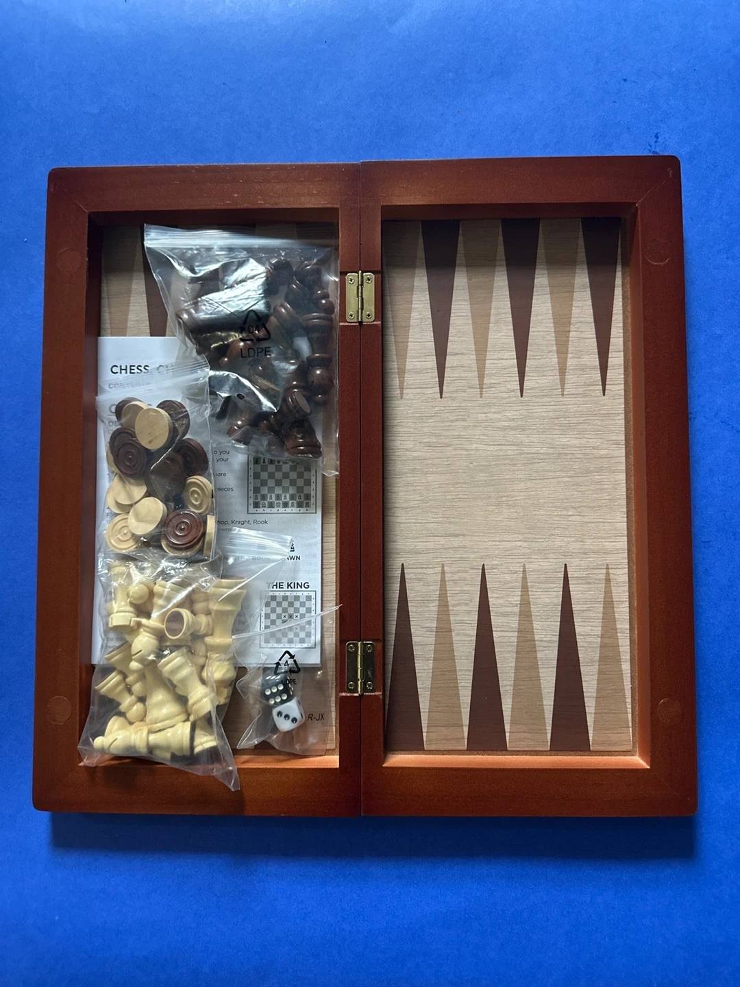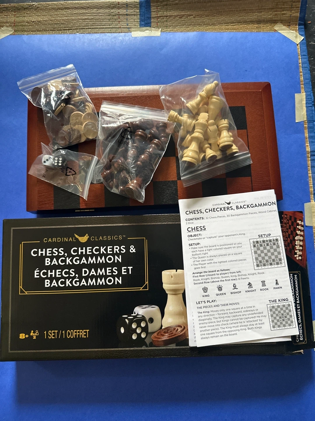 This Cardinal Classics set includes chess, checkers, and backgammon. It's a 3-in-1 game set with wood cabinets and all the pieces. Comes with 32 chess pieces, 30 checkers, and wood cabinet.