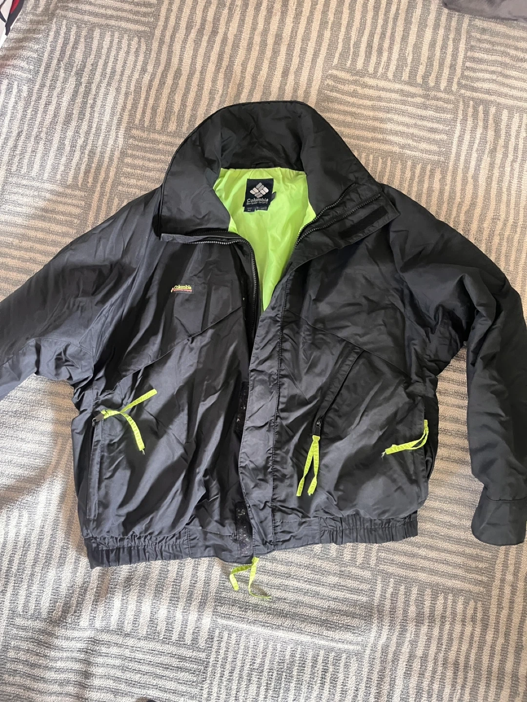 Selling a Columbia Whirlibird jacket in black with a bright green lining! It's a men's size medium. This jacket is in great condition and ready for a new home. It's lightweight and perfect for layering