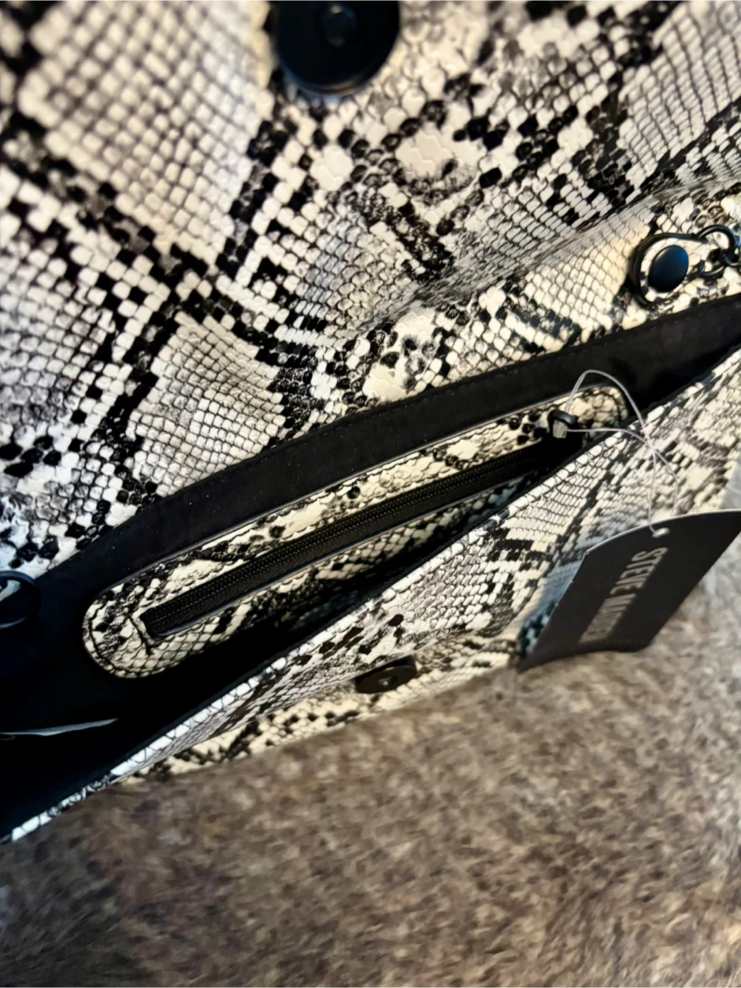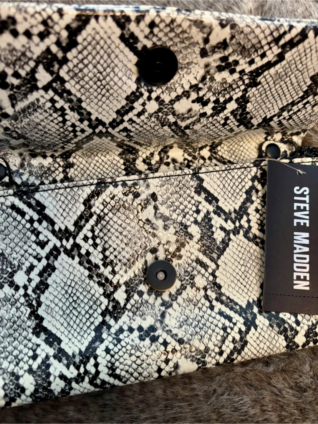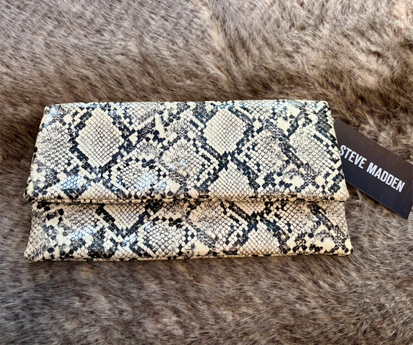 New with tags Steve Madden clutch features a bold snakeskin pattern (glows in the dark) and a removable chain strap for versatile wear. It has a magnetic snap closure and includes an interior zip pocket. Its compact size makes it perfect for carrying essentials.