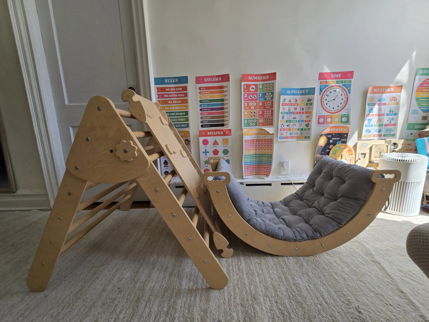 Wood & Hearts Pikler Triangle and Rocker with Gray Cushion