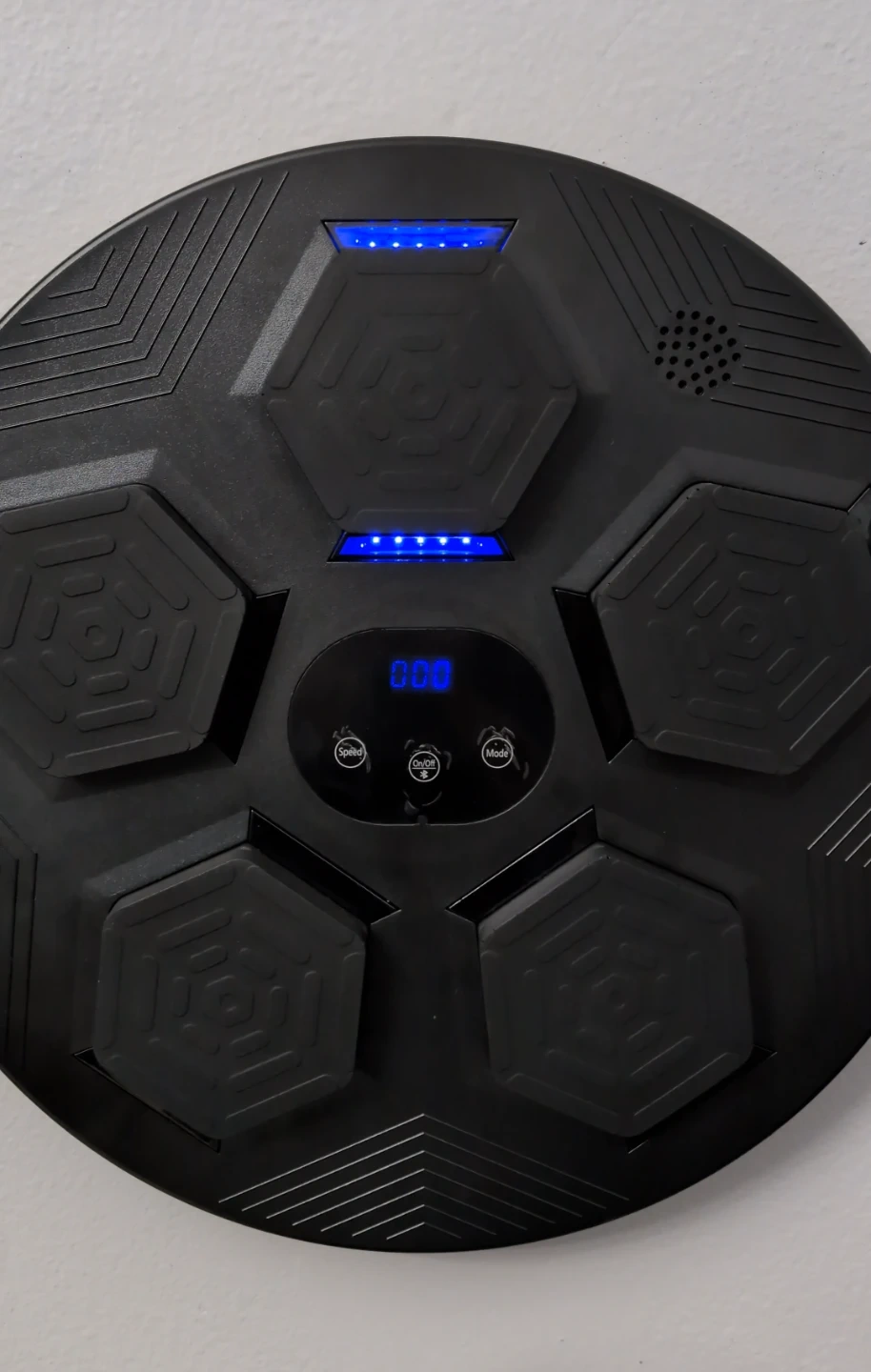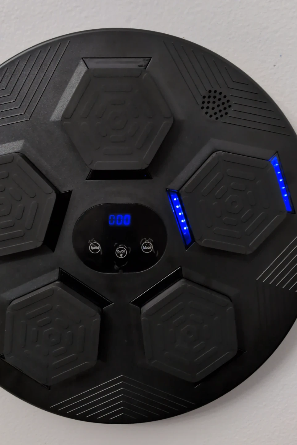 This electronic drum pad features multiple hexagonal pads and a digital display. It has buttons for Speed, On/Off, and Mode. Blue LED lights indicate its active status. It's powered by an external source and designed for interactive use.