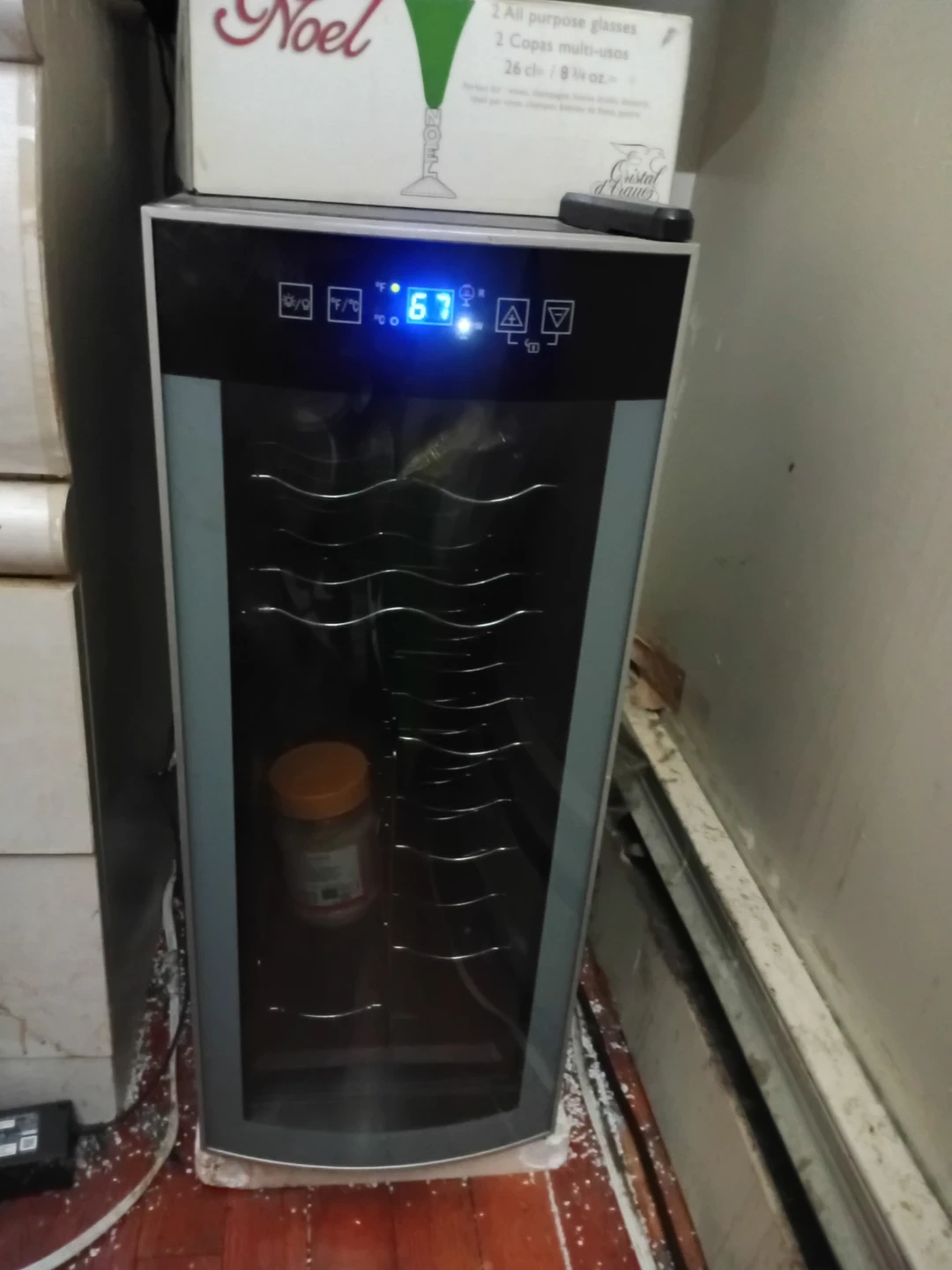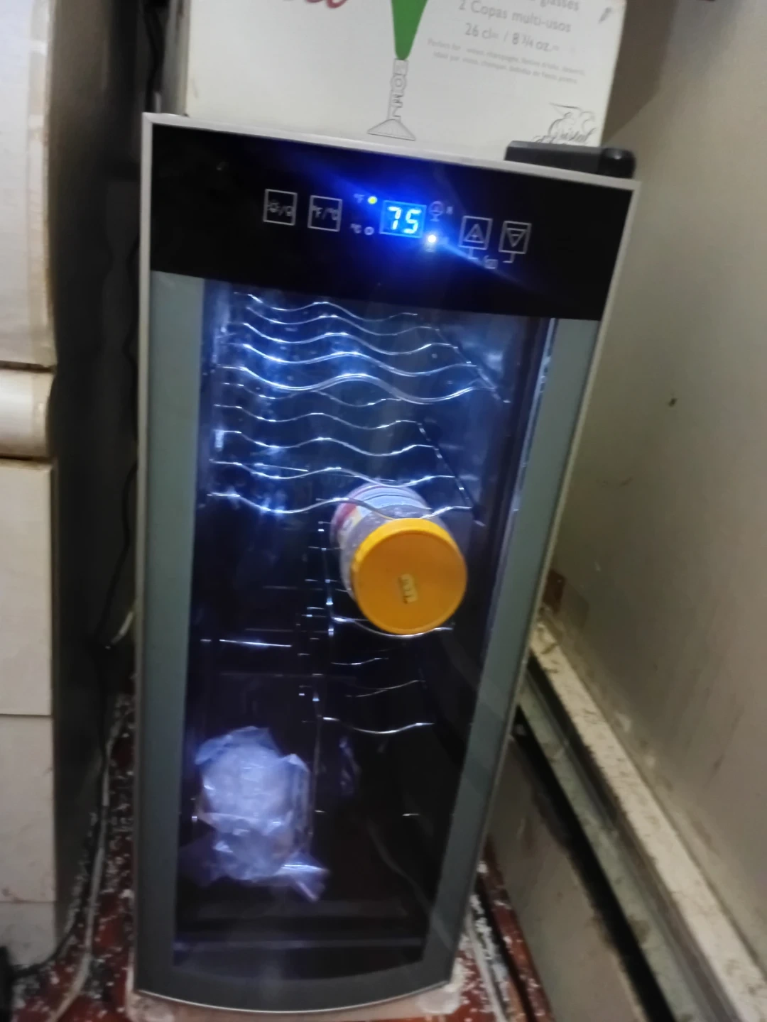 This is a wine cooler refrigerator. It displays 67 degrees. This appliance is great for keeping wine at the perfect temperature. Only need gas. Great condition with it original box