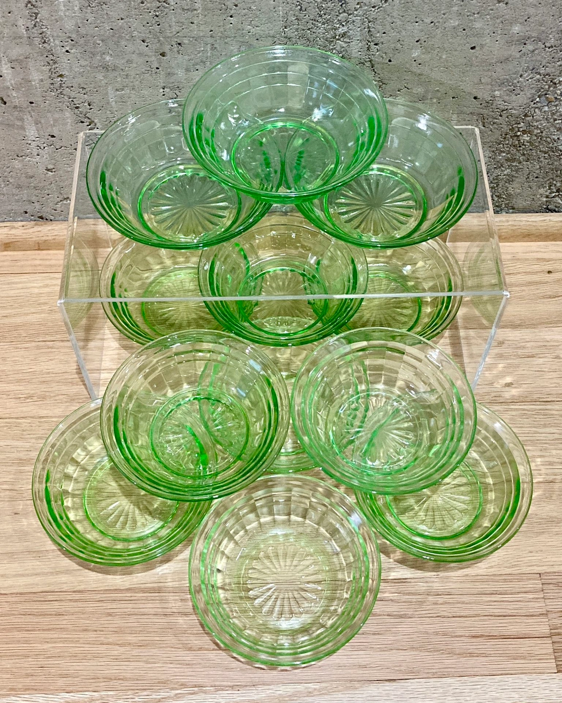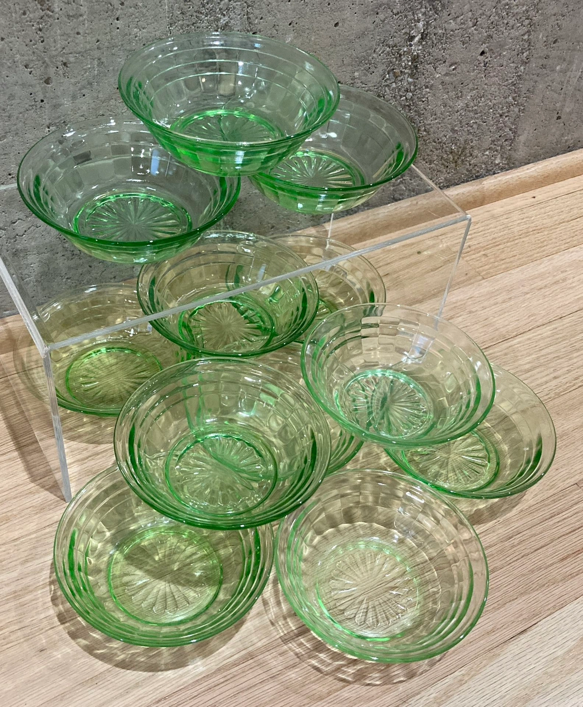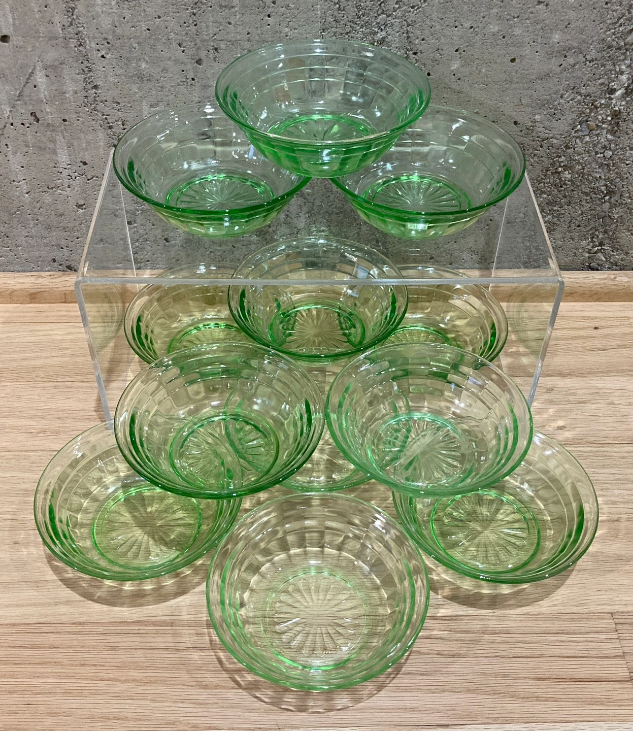 Set of 12 Vintage Anchor Hocking Small Fruit Berry Dessert Bowls in Block Optic pattern. Green depression pressed glass bowls feature a mid century geometric block optic design. Made in the USA.