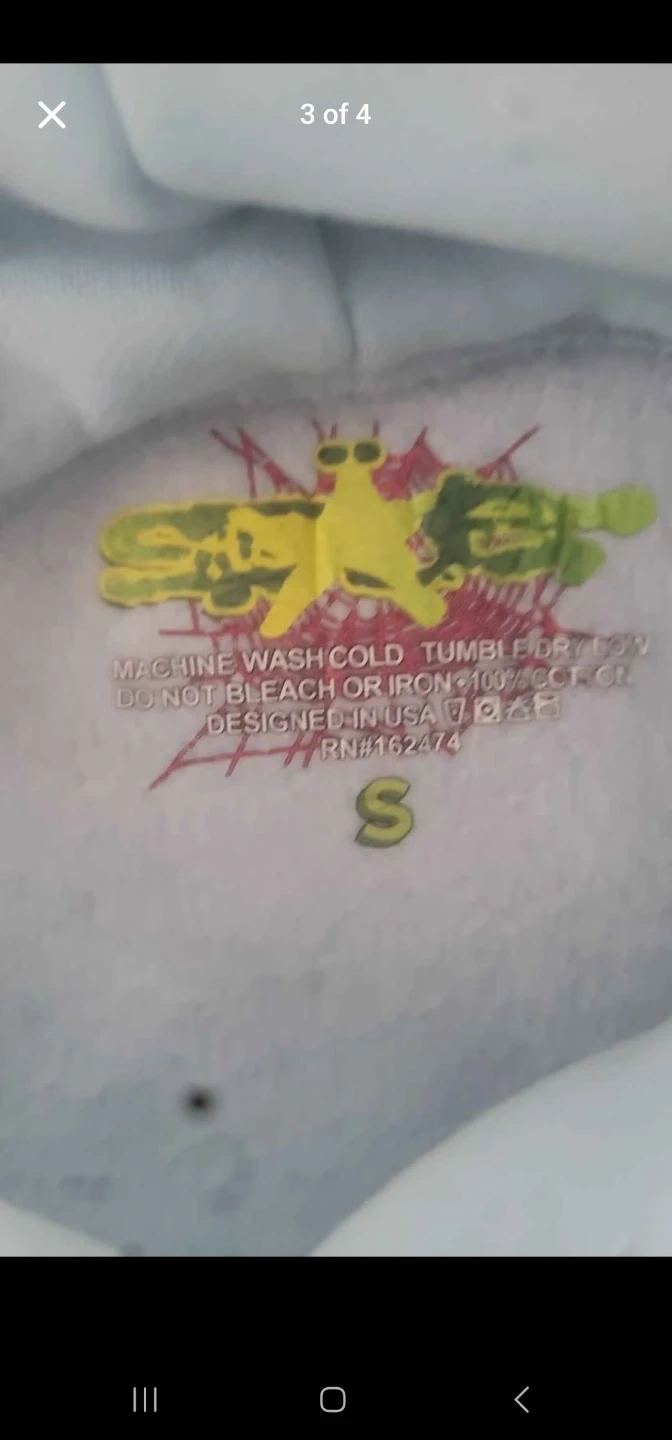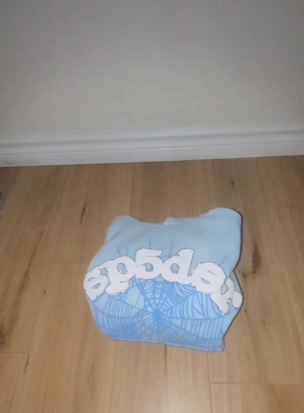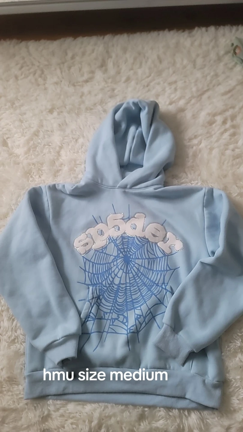 Light blue Sp5der hoodie with a spiderweb graphic. Size is small and it's made of 100% cotton. Designed in the USA.
