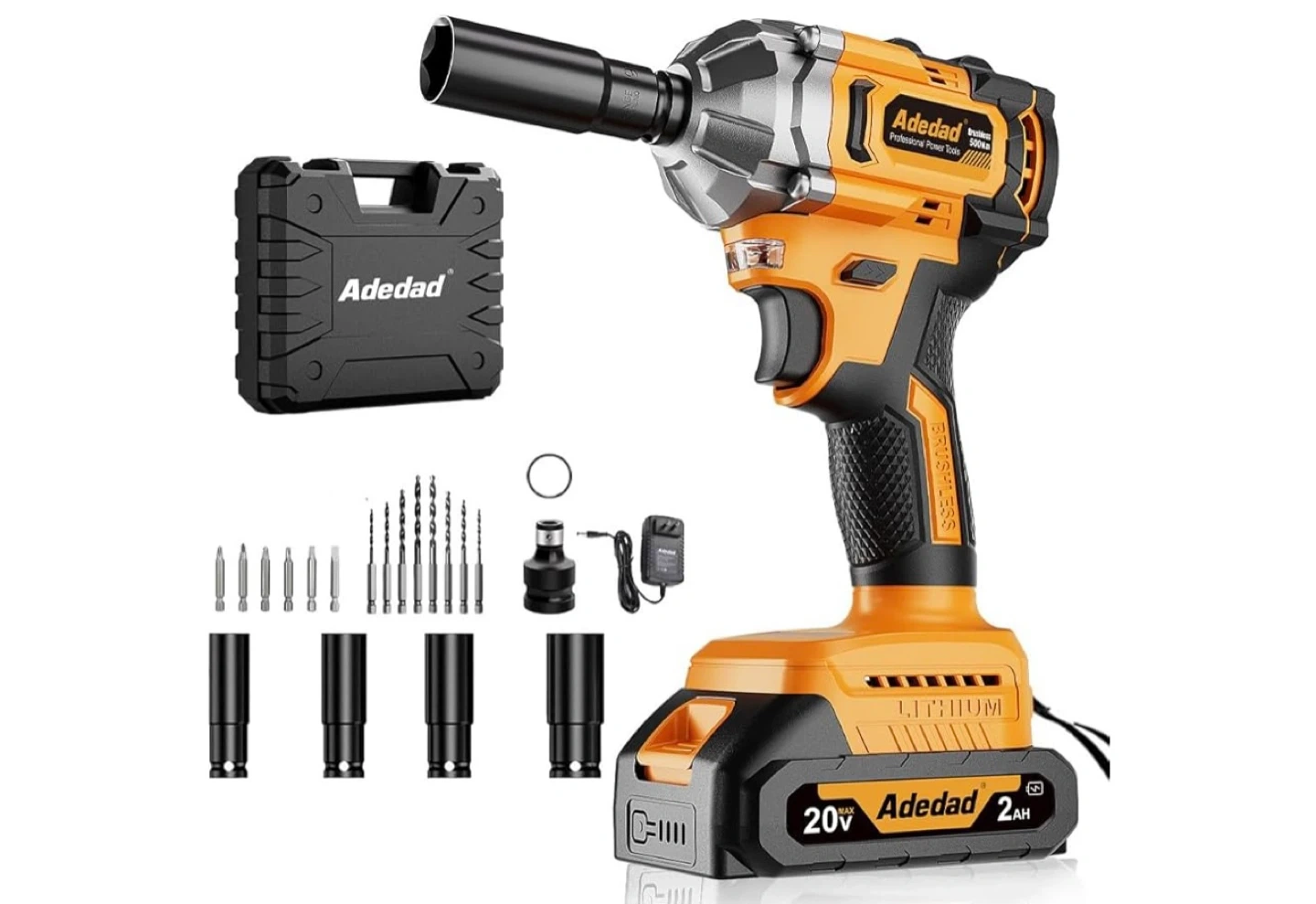 Adedad 20V cordless impact wrench kit. It's a brushless motor tool with a 2AH lithium battery. Includes a storage case, charger, socket adapter, and assorted bits. Ready for your projects!
