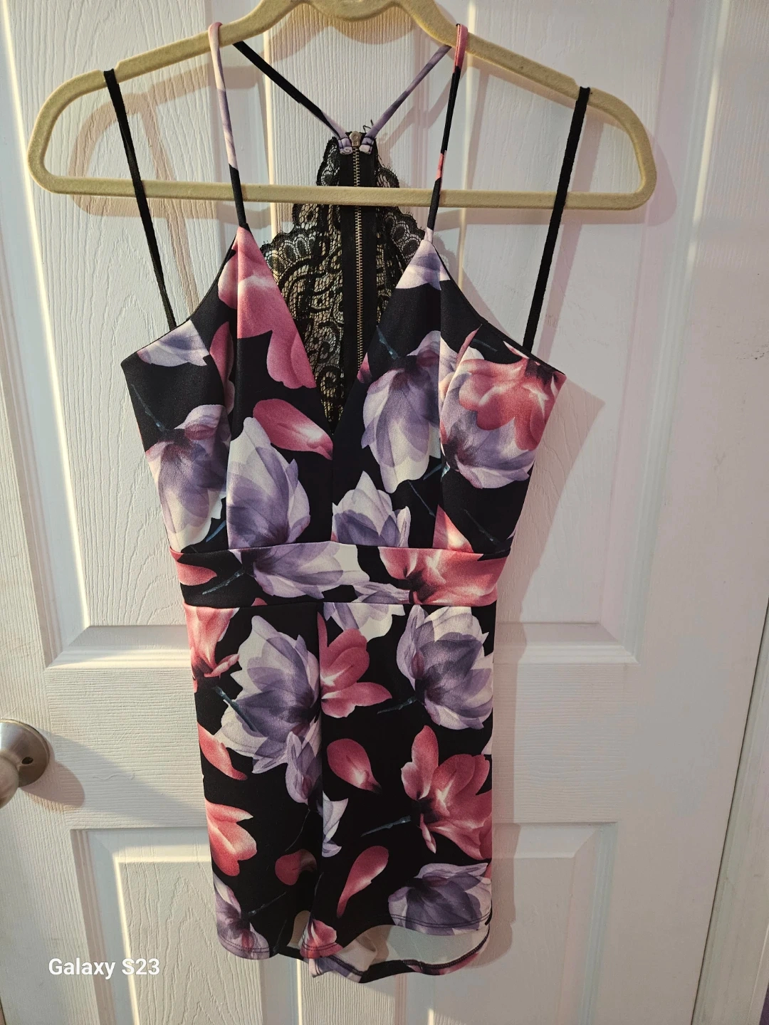 This romper features a bold floral print with vibrant pink and purple flowers on a black background. It has adjustable spaghetti straps and a lace panel with a zipper closure at the back. It's a fun piece for a night out!