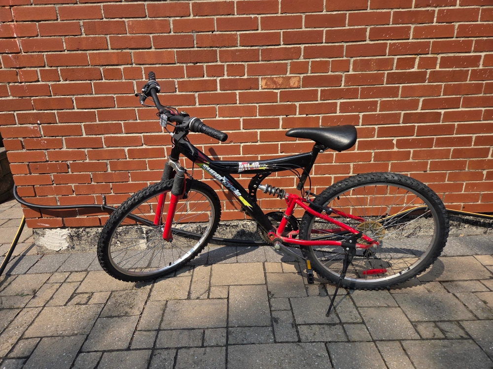 Selling a Supercycle full suspension mountain bike. It features a black frame with red accents on the front forks and rear suspension. Great for trails and getting around town!