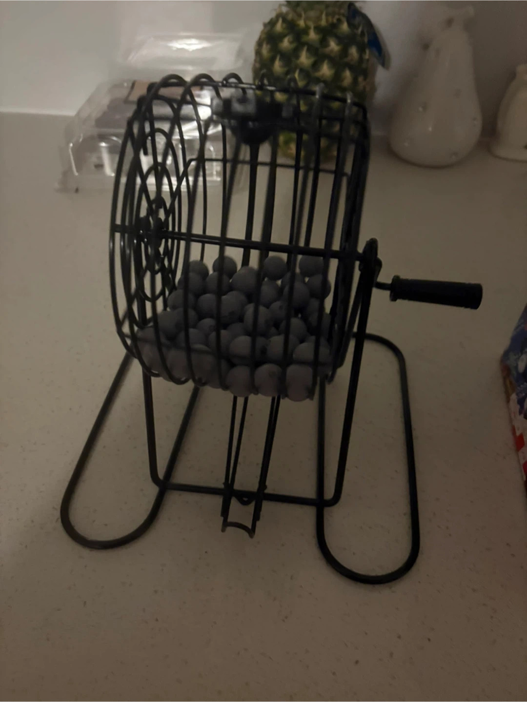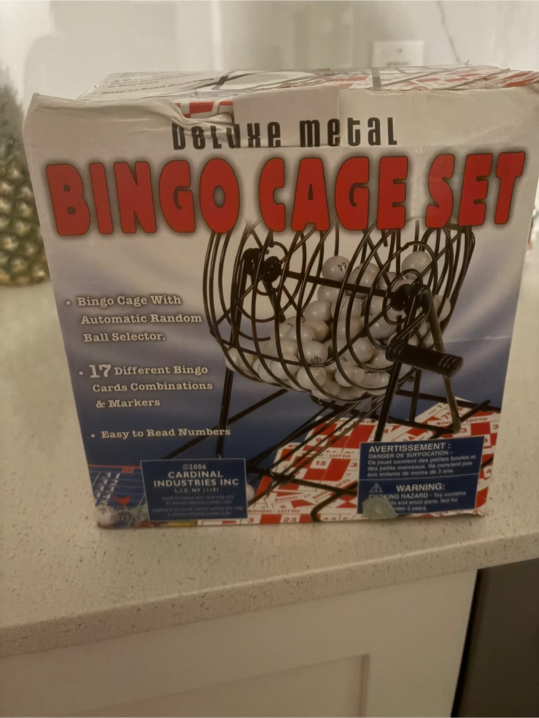Selling a Deluxe Metal Bingo Cage Set! It includes a bingo cage with automatic random ball selector, 17 different bingo cards combinations & markers, and easy to read numbers. The box is included!
