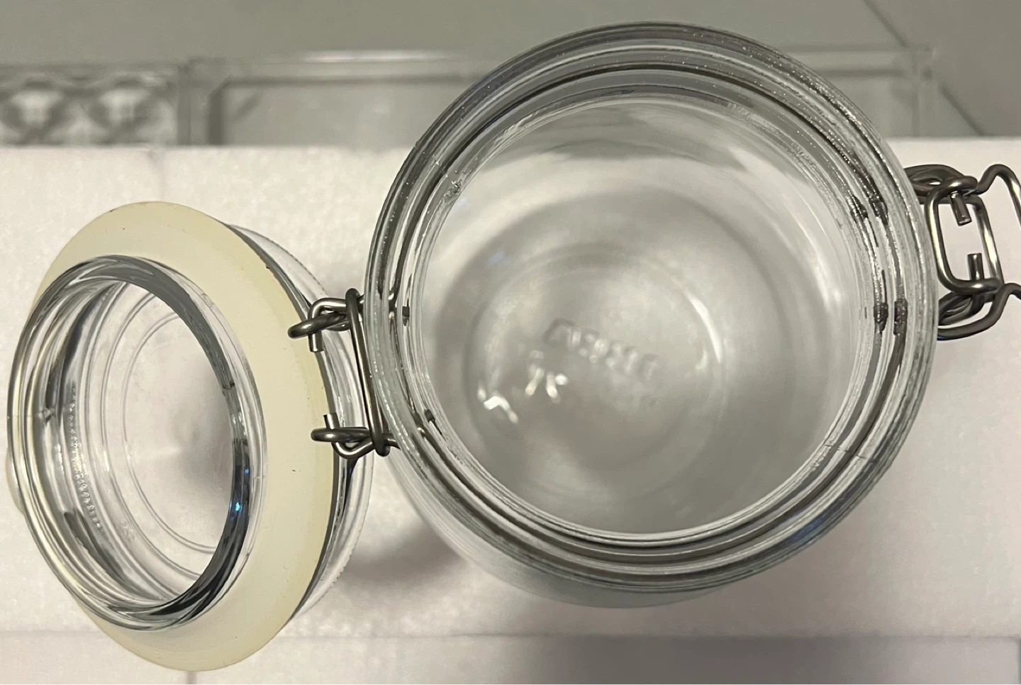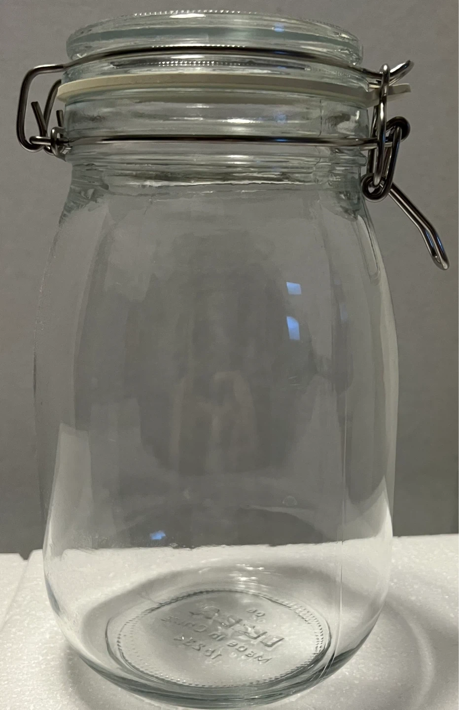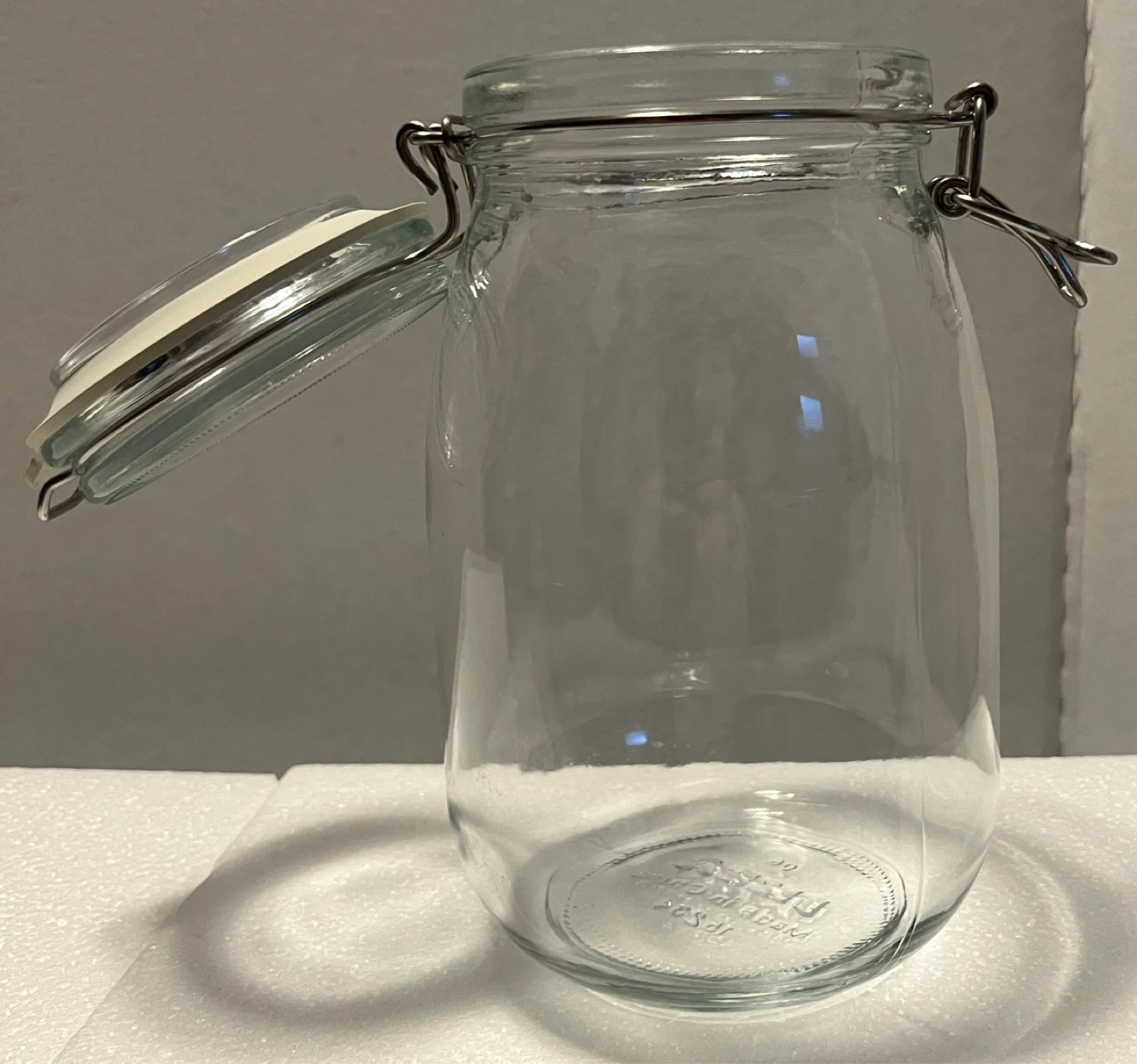 Clear glass clamp-lid canister from IKEA in excellent condition. Features a secure metal latch with airtight seal, perfect for keeping contents fresh.