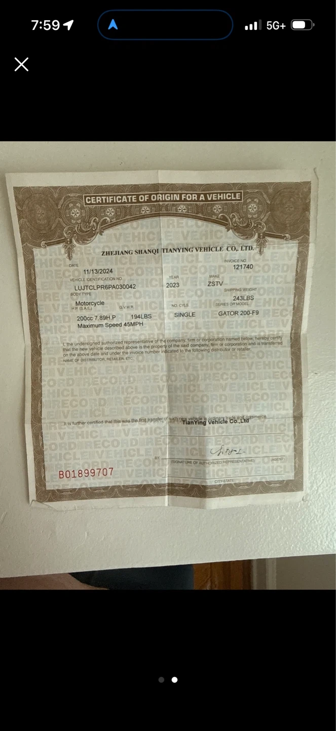 This is a 200cc motorcycle scooter. It has a maximum speed of 45 mph. It comes with two keys. The certificate of origin is dated 11/13/2024.