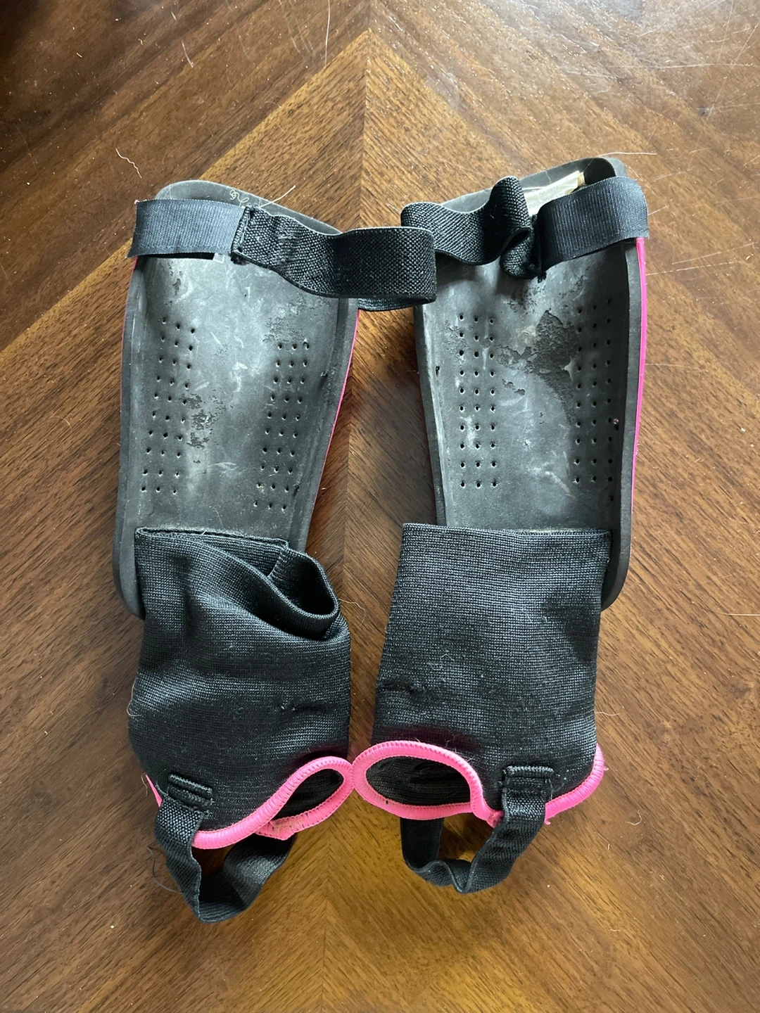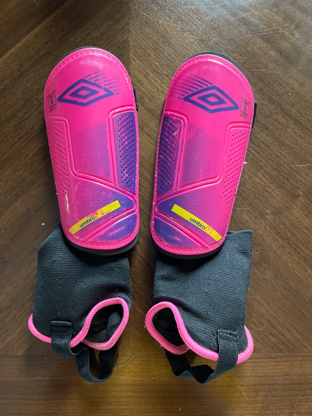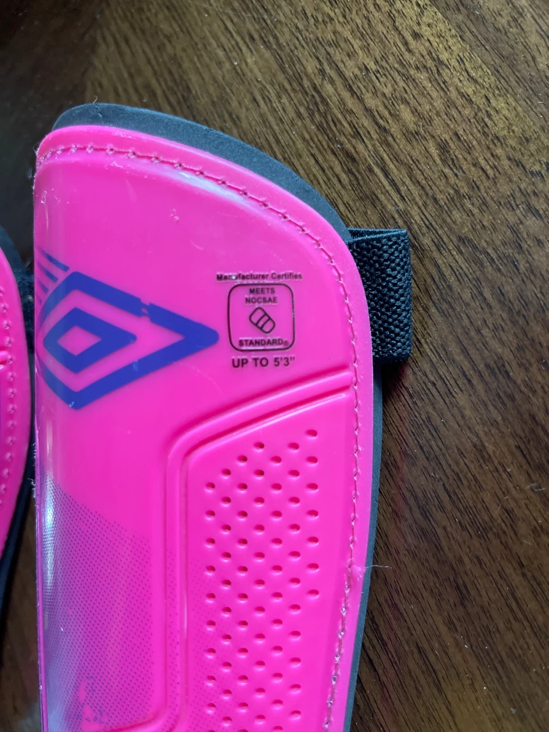 Free pair of kids Umbro soccer shin guards in pink! They're designed for players up to 5'3" in height. Great for protecting your shins during games or practice. Elastic and Velcro are in good condition. Used and just need a quick wash.