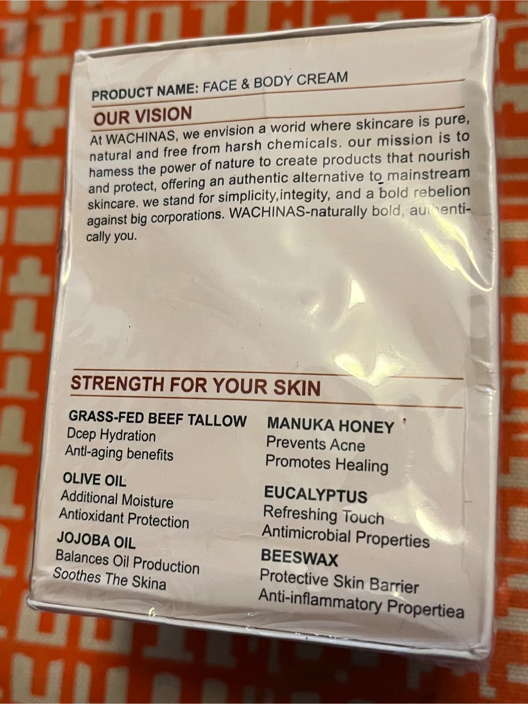 This Wachinas Face & Body Cream is a whipped tallow honey balm formulated with jojoba oil, olive oil, grass-fed tallow, and manuka honey. It's unscented and comes in a 4 oz (113.4g) container. The balm is designed for strength and nourishment for your skin.