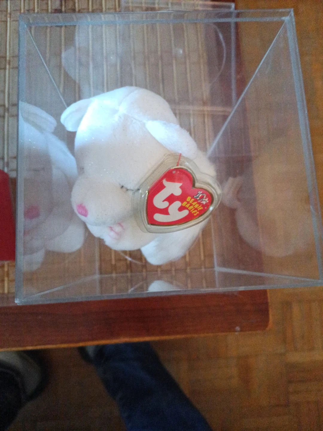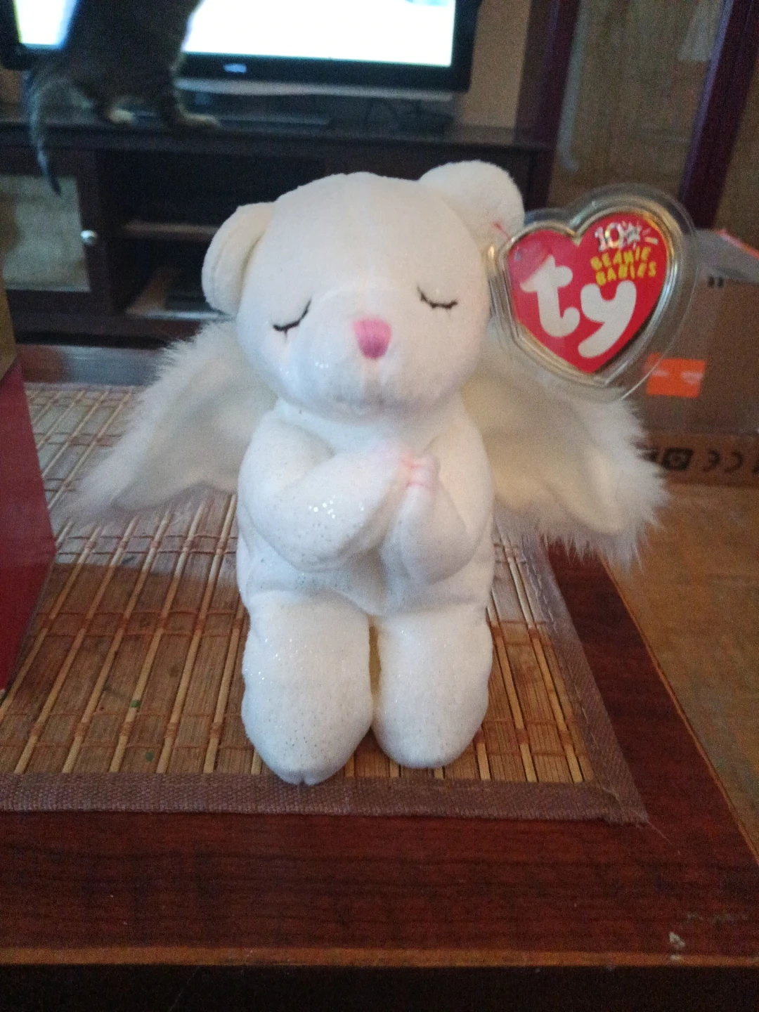 This is the "Peace" Ty Beanie Baby teddy bear. It's white with glitter accents and features feathery wings. It's displayed in a clear protective case.